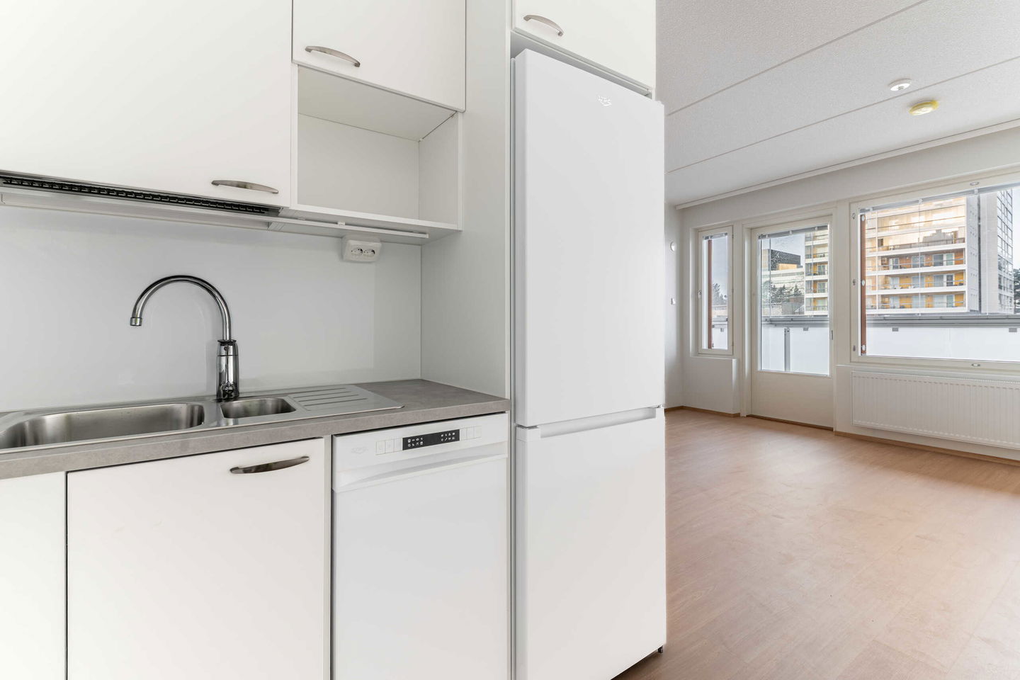 Hissitalon 2. kerroksen toimivapohjainen koti! Keittiö on L-mallinen ja siellä on hyvin kaappi- ja laskutilaa. Keittiö on yhtenäistä tilaa olohuoneen kanssa ja ruokapöydälle löytyy oma paikkansa. Makuuhuoneessa on vaatehuone sekä lisäksi kaapistot tavaroiden säilytykseen. Eteisessä lisäsäilytystilaa. Lasitettu parveke sekä ikkunat pohjoiseen sisäpihan suuntaan. Jätäthän asuntohakemuksen.