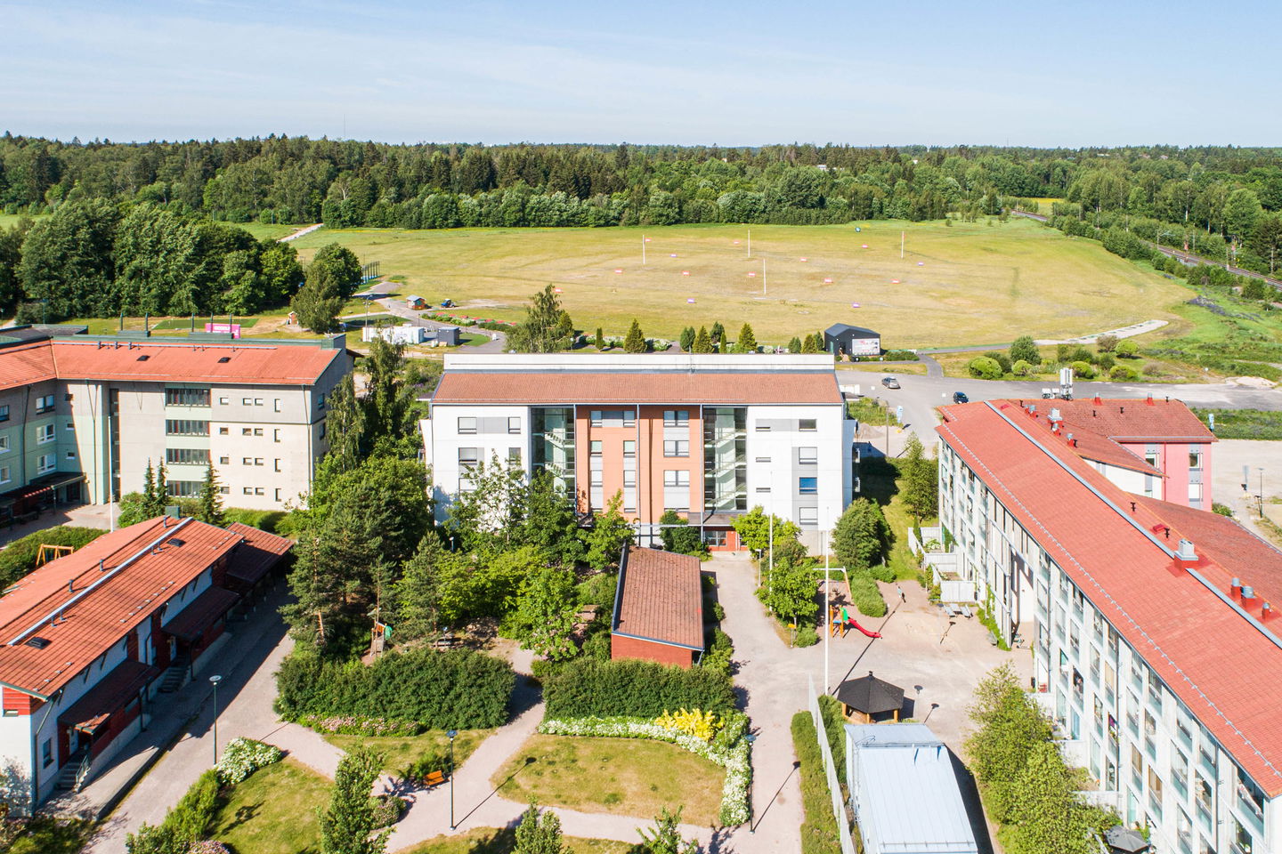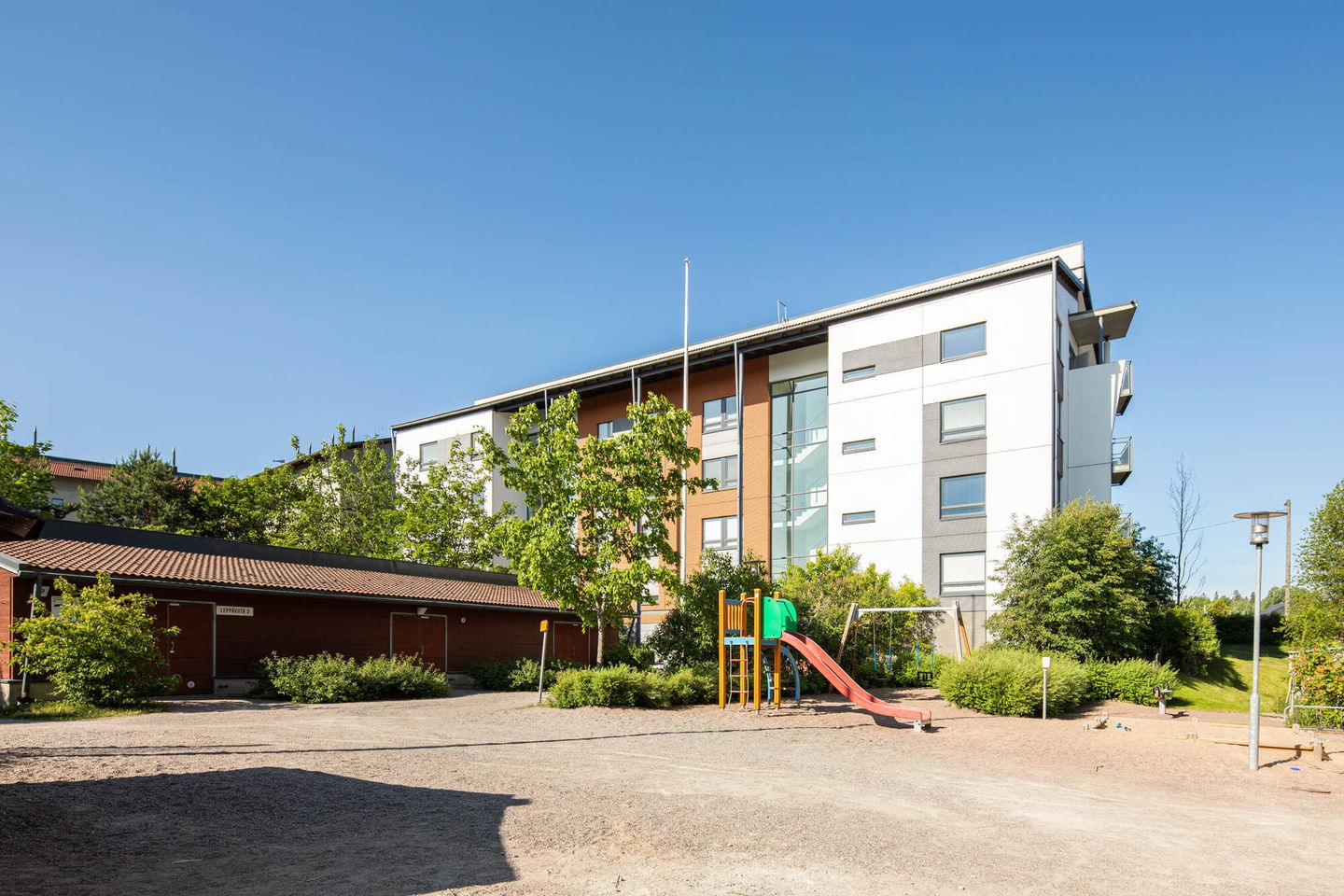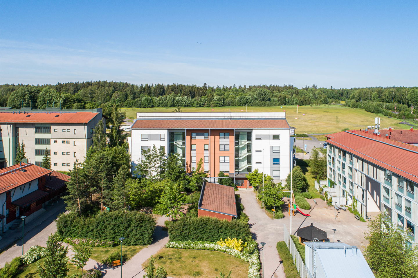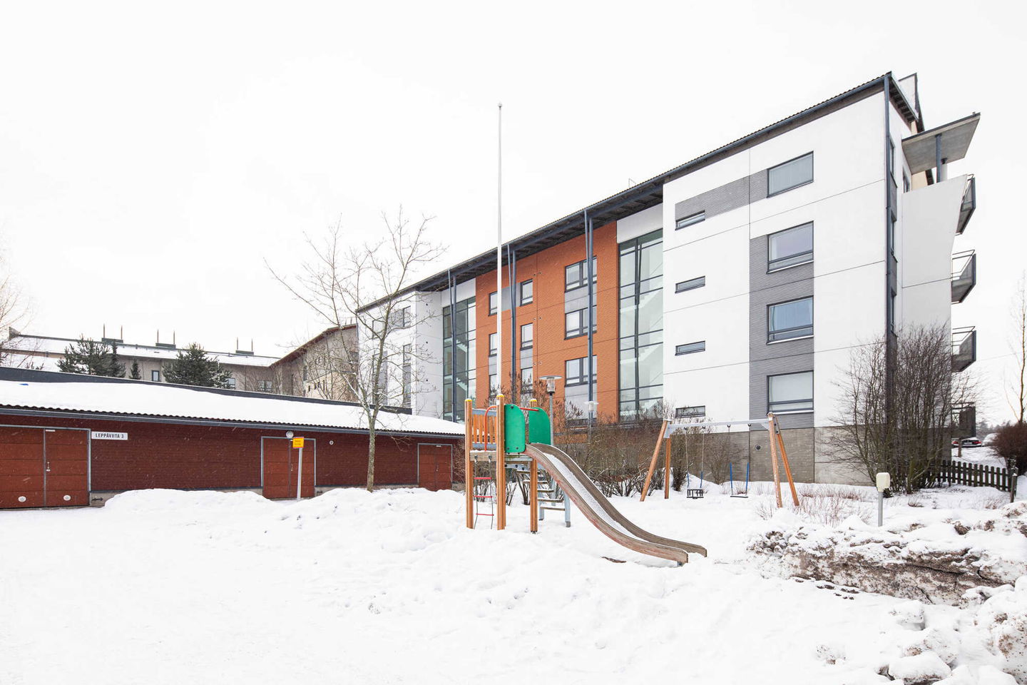 Puistojen välissä sijaitseva kerrostalokohde Leppävaarassa. Kaikissa asunnoissa on oma sauna ja osassa myös parveke.