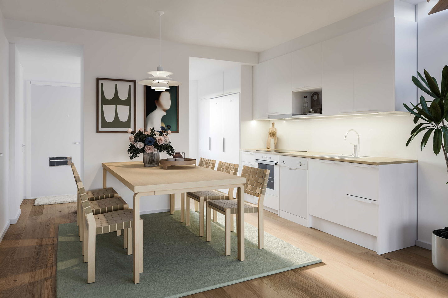 Keittiön varusteisiin kuuluu kaksi kylmälaitetta, keraaminen liesi sekä astianpesukone. Keittiössä oleva ikkuna tuo tilaan luonnonvaloa.
