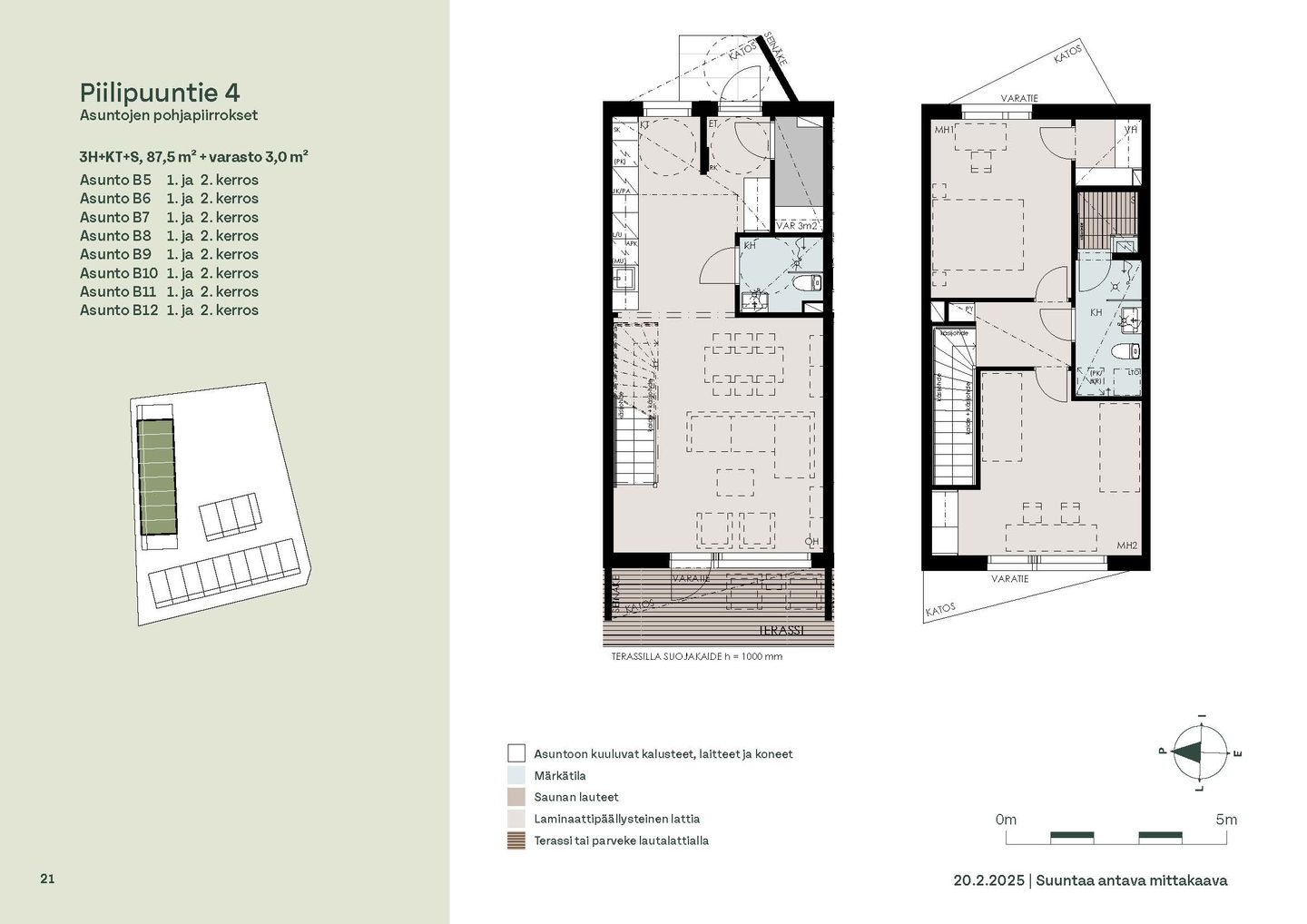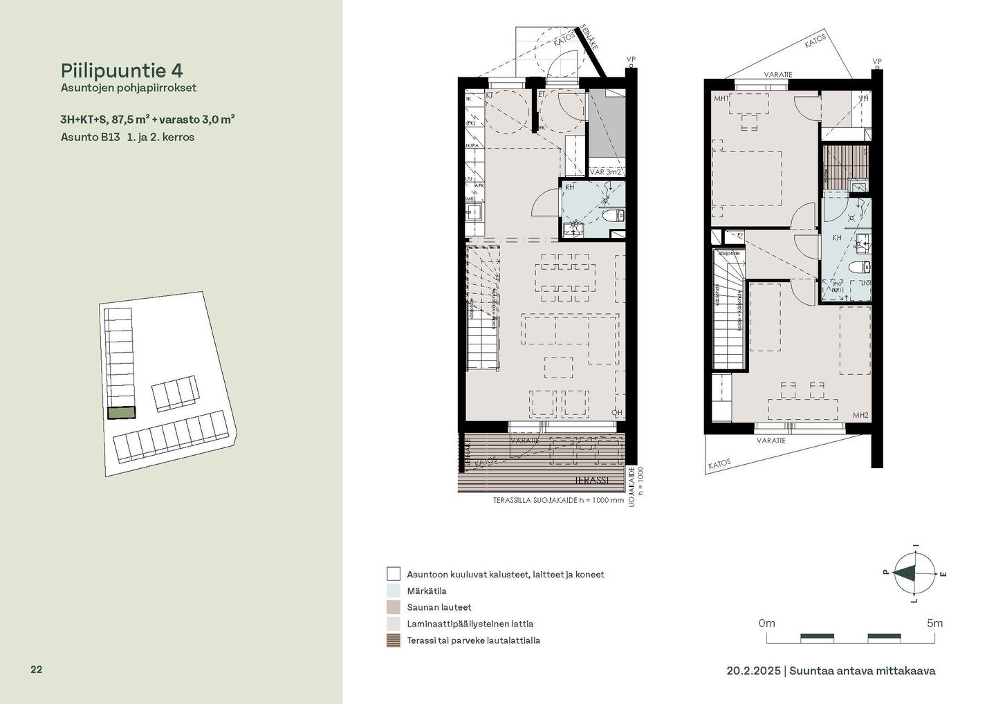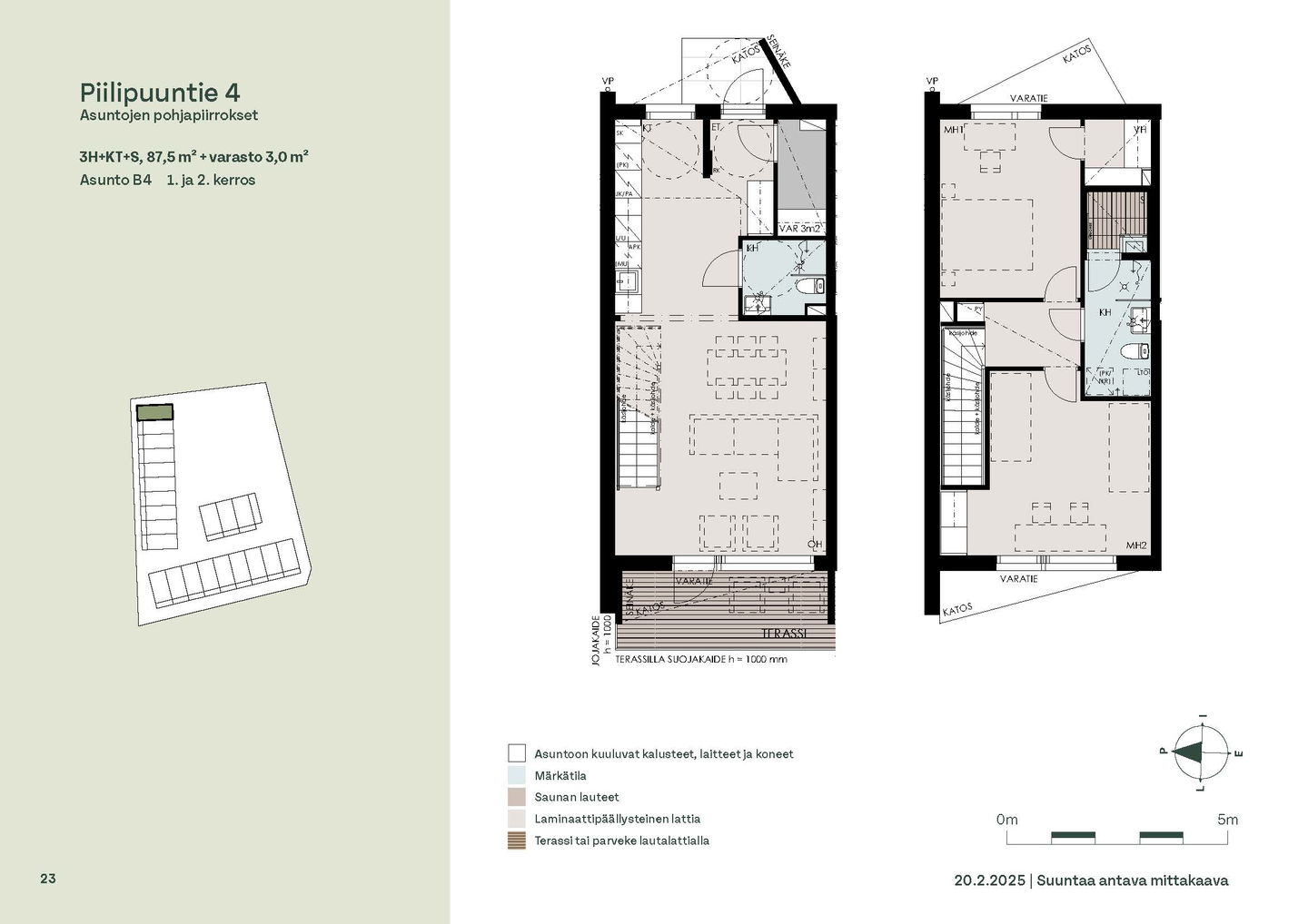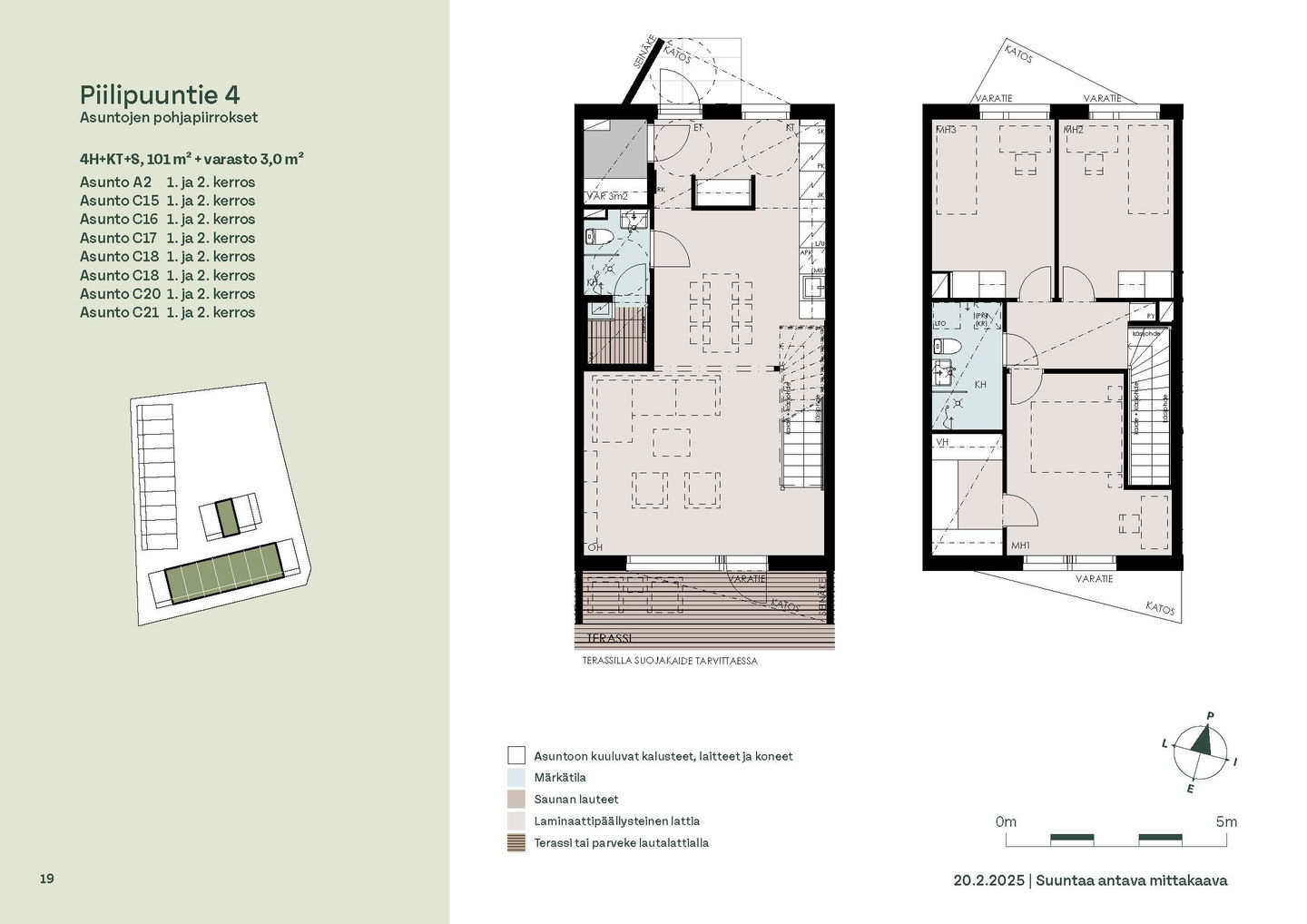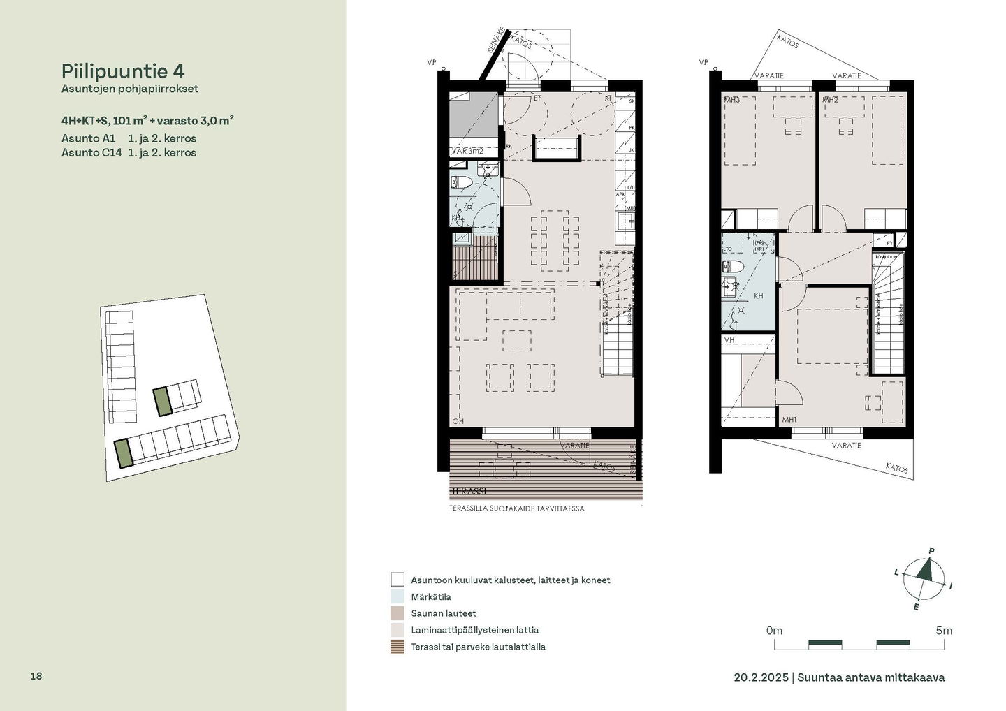 Asunnon sisäänkäynti sijaitsee Kirjakadun puolella. Alakerran keittiö ja olohuone ovat yhtenäistä, avointa tilaa, jonne on mukava kerääntyä viettämään aikaa perheen kesken. Olohuoneesta on kulku asunnon aurinkoiselle, etelään päin avautuvalle terassille. Eteisessä on irtainvarasto.