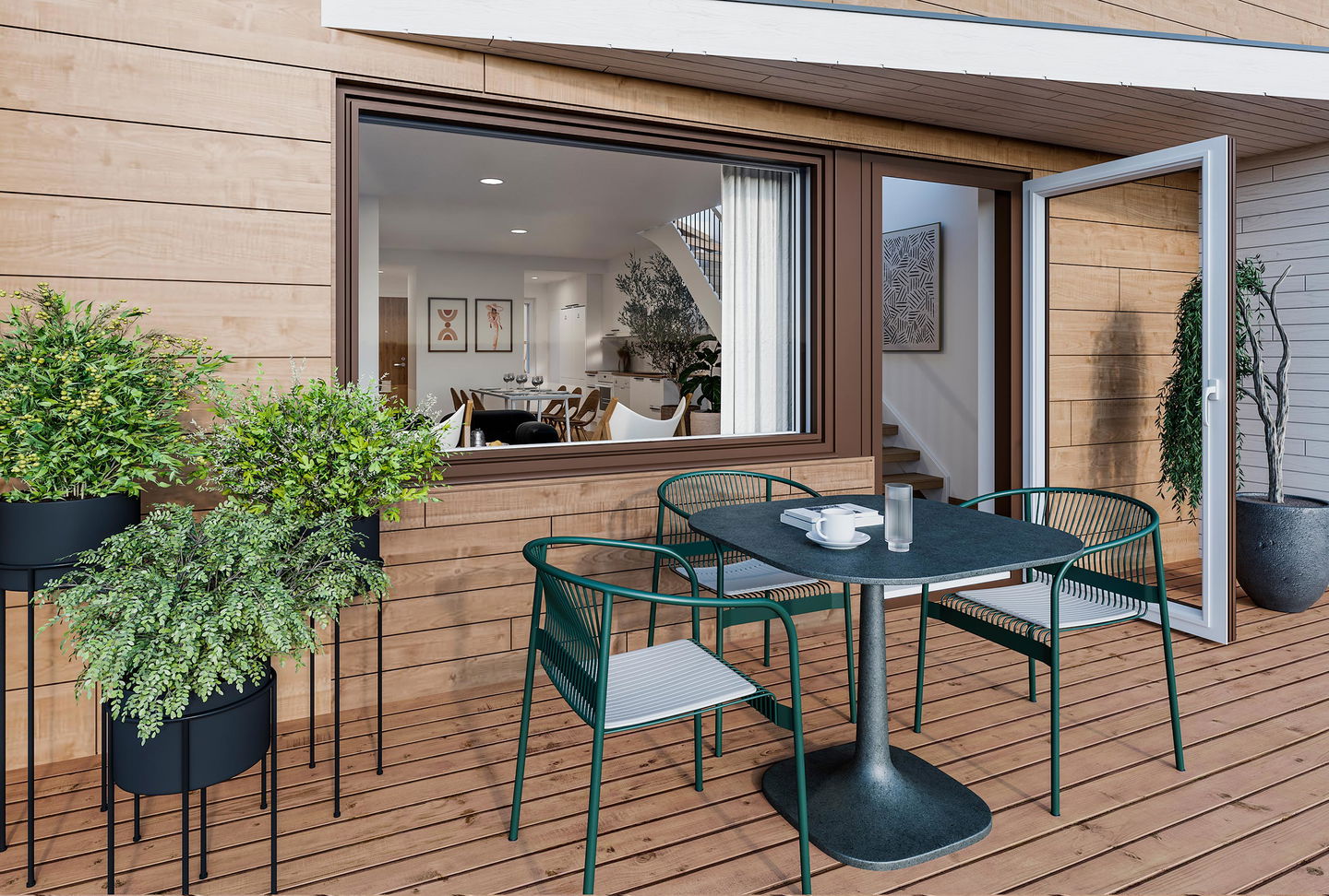 Hyvin suunnitellut kodit ovat valoisia, kaksikerroksisia kolmioita ja neliöitä, joissa on reilun kokoiset asuinhuoneet. Kaikissa huoneistoissa on oma sauna, josta astelet suoraan omalle terassille tai pihalle vilvoittelemaan. Arkea sujuvoittavat toimivat keittiöt, wc-tila kummassakin asuinkerroksessa sekä erillinen pyykkikaappi yläkerrassa. Jokaiseen asuntoon kuuluu myös oma irtaimistovarasto sekä lämmityspistorasialla varustettu autopaikka.