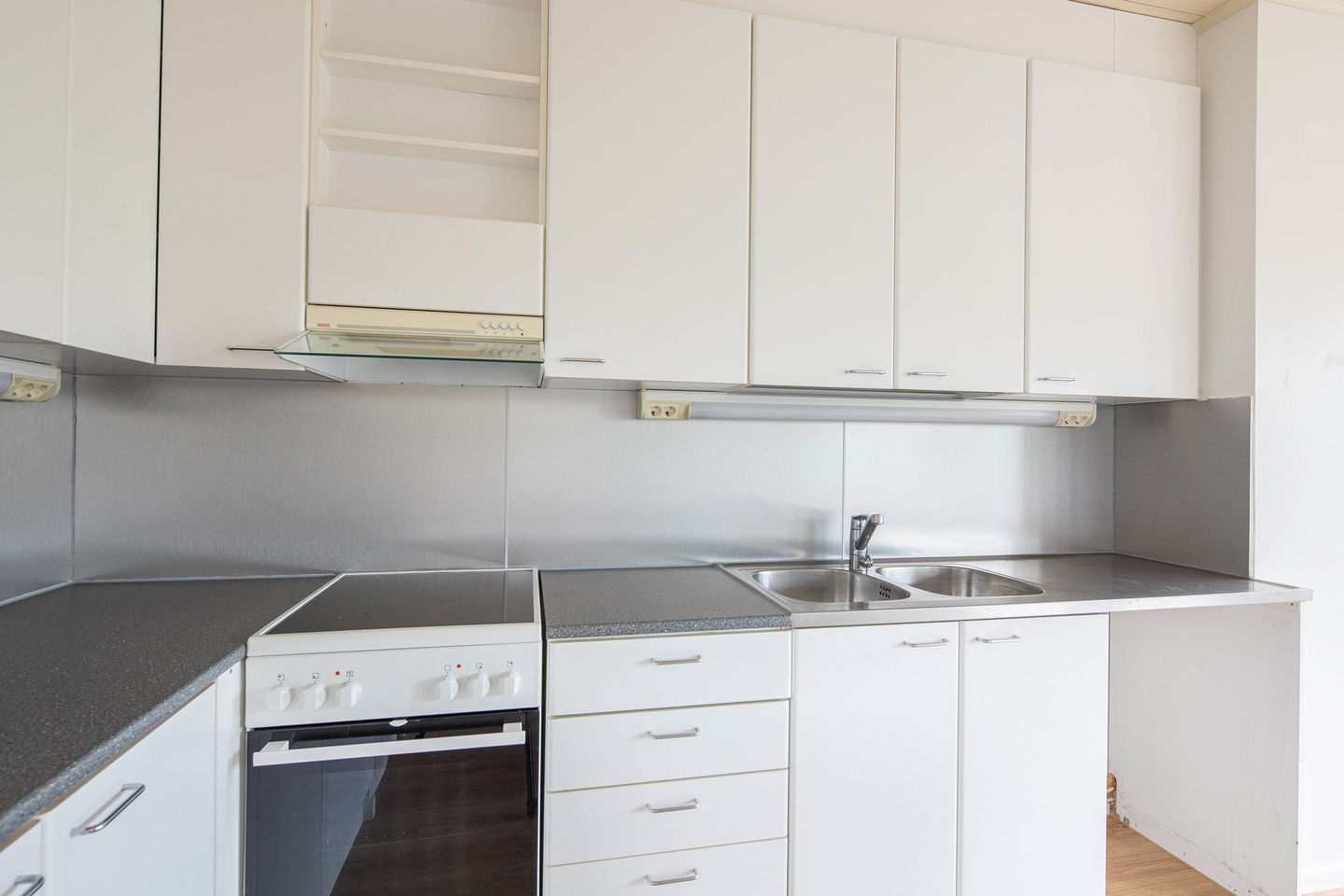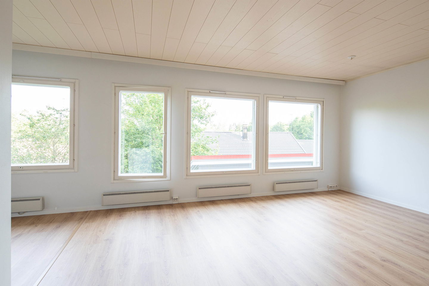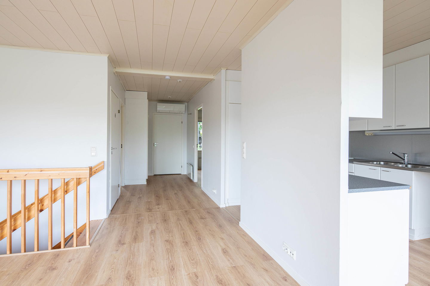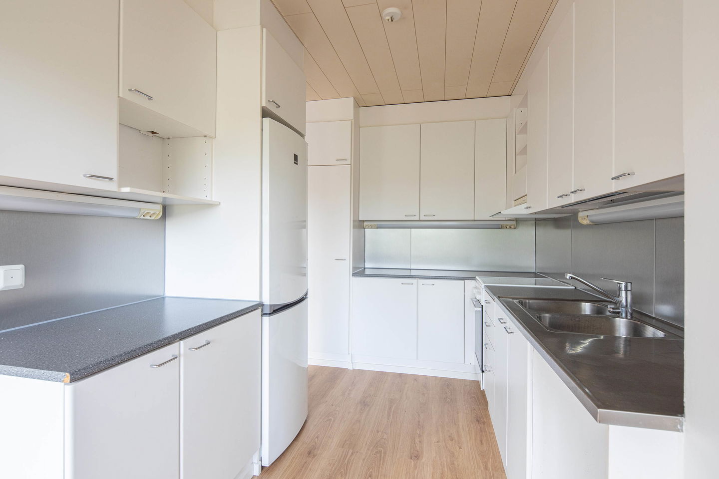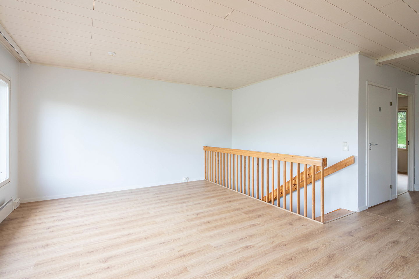 Asunnon yläkerrassa sijaitsevat keittiö, jossa on runsaasti kaappitilaa, erillinen ruokailutila ja tilava olohuone, jotka yhdistyvät saumattomasti yhdeksi avoimeksi tilaksi. Yläkerrasta löytyvät asunnon kaksi makuuhuonetta. Lisäksi löydät yläkerrasta wc/suihkutilan.
