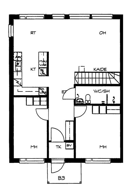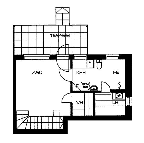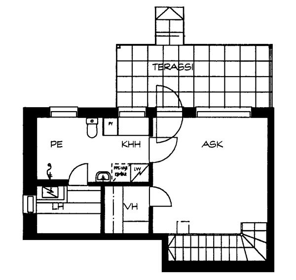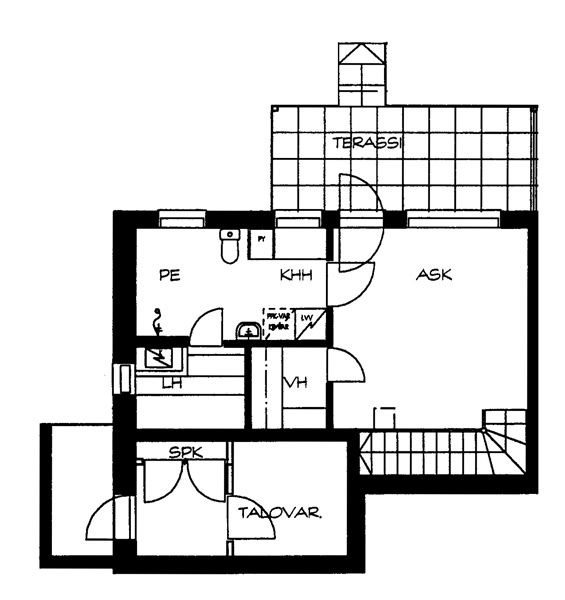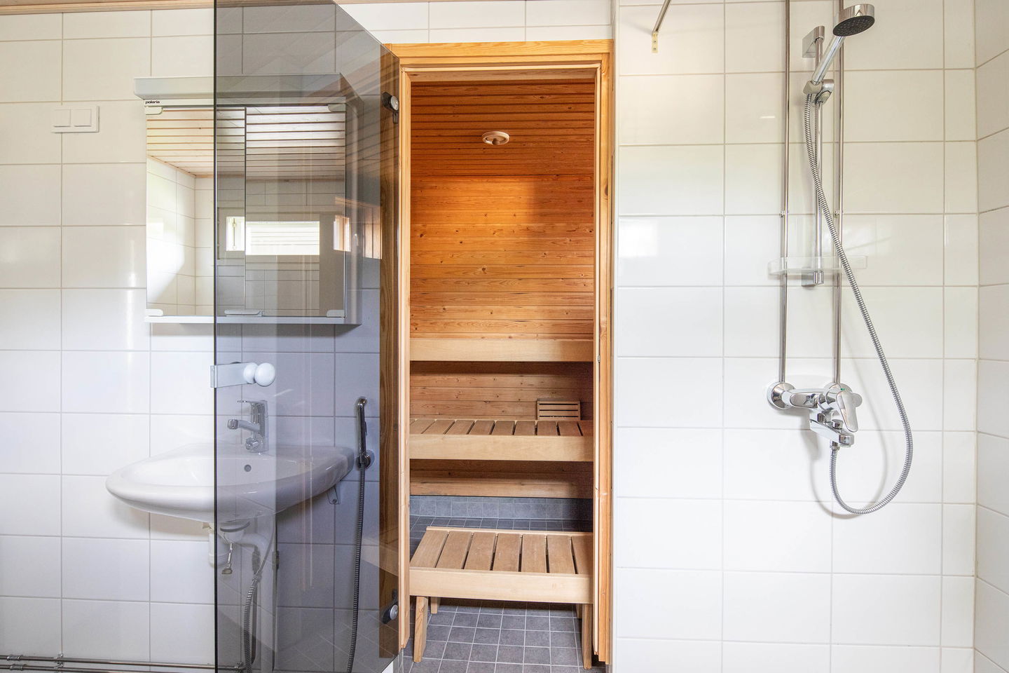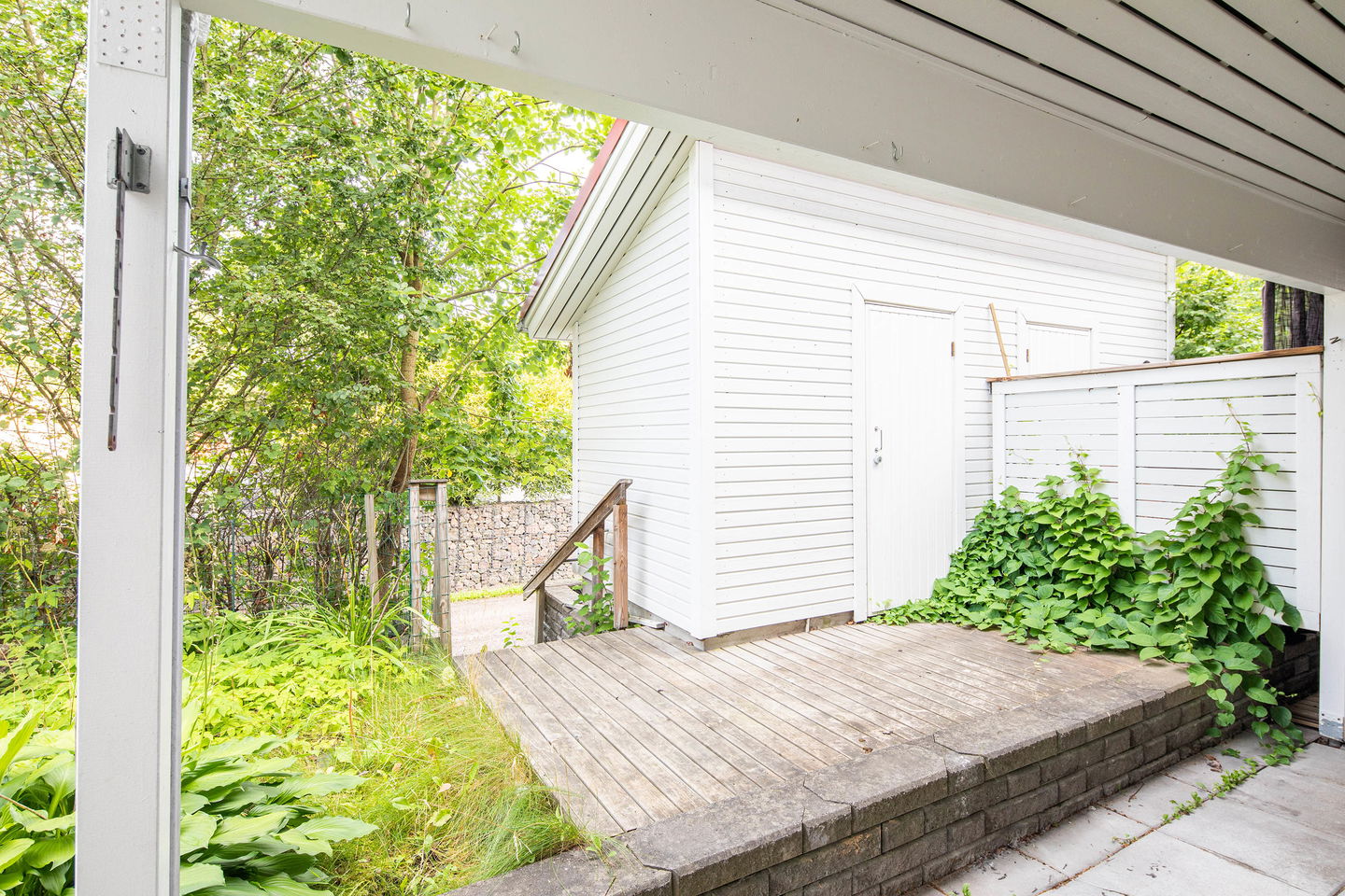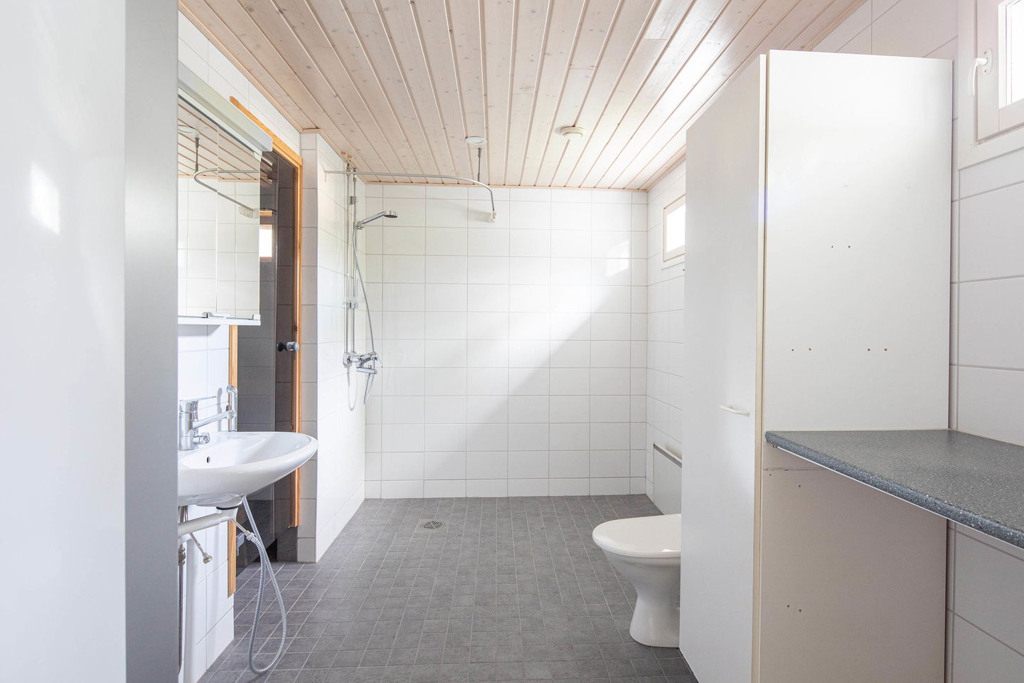 Alakerrassa on tilava askarteluhuone joka muuntautuu helposti isommaksi makuu- tai vierashuoneeksi, miksei myös työtilaksi. Alakerrasta löytyy myös tilava kylpyhuone ja sauna, sekä käynti takapihalle vilvoittelemaan saunan jälkeen.