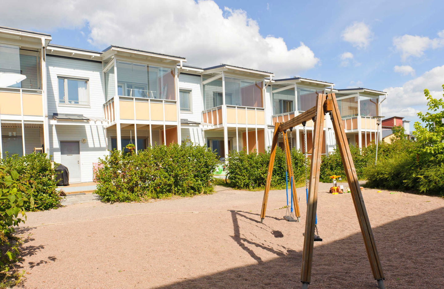 Kolmikerroksinen luhtikäytävätalo Viikin puutarhakaupunginosassa. Vehreä yhteinen piha-alue, jossa asukkaiden omat viljelypalstat. Alimmassa kerroksessa pienet omat pihat. Kaukolämpö.