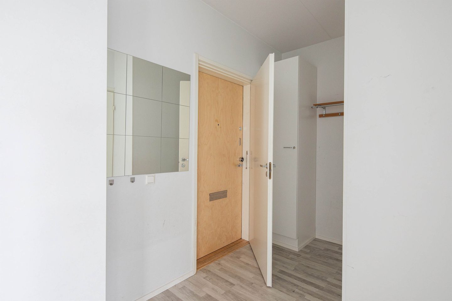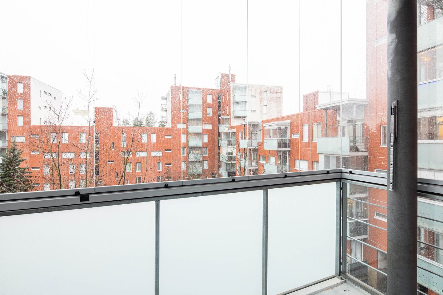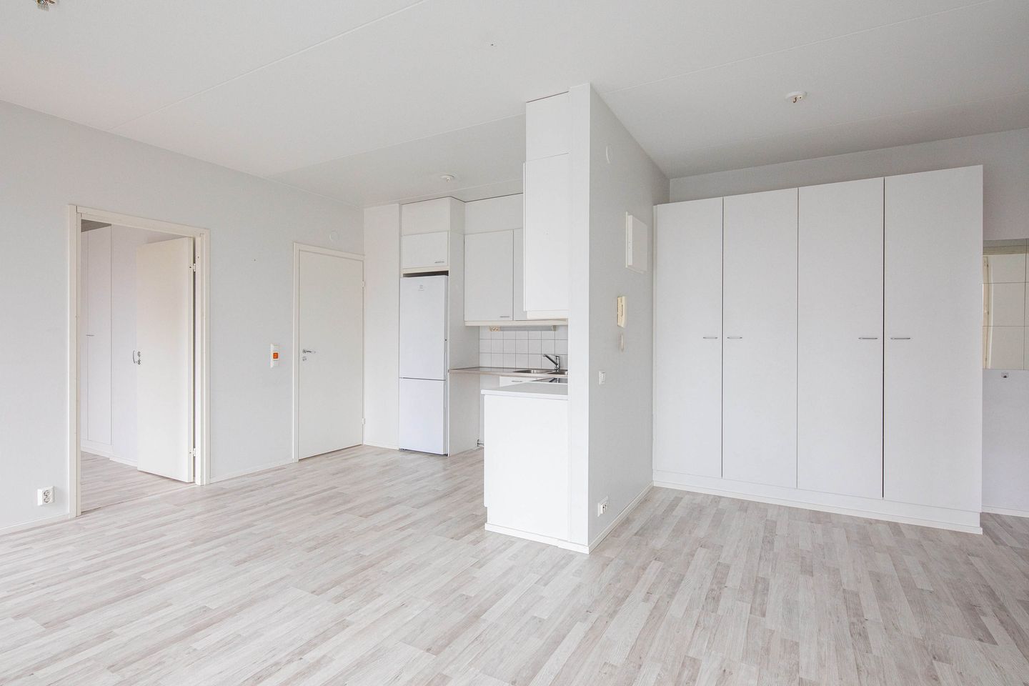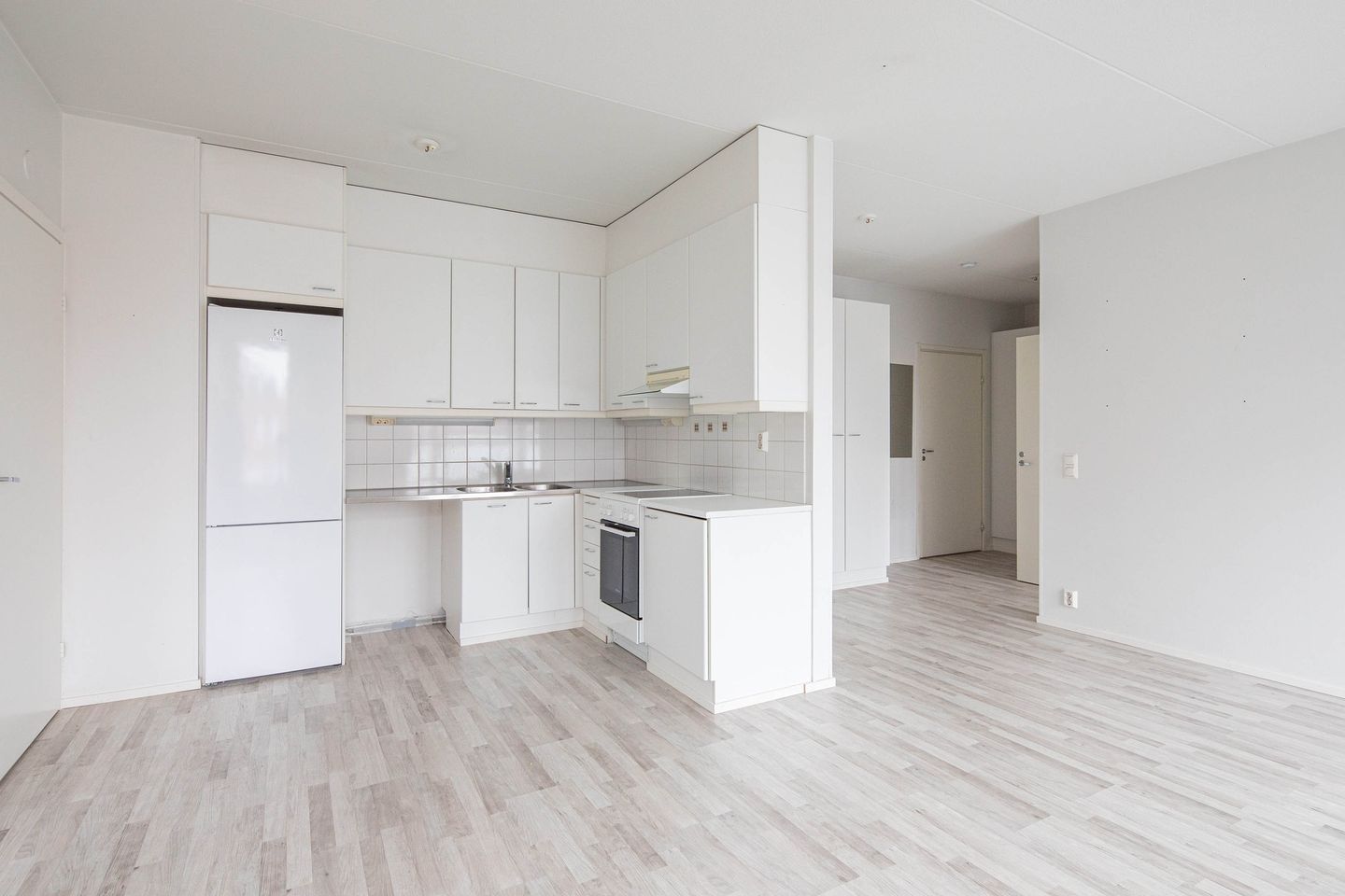 Sisäänkäynnin yhteydessä on käytännöllinen eteinen ja säilytystila. Keittiö on sijoitettu pitkälle seinälle ja avautuu olohuoneeseen, mikä luo yhtenäisen ja avaran oleskelutilan. Olohuoneesta on käynti lasitetulle parvekkeelle, joka tuo asuntoon lisää tilaa ja luonnonvaloa.