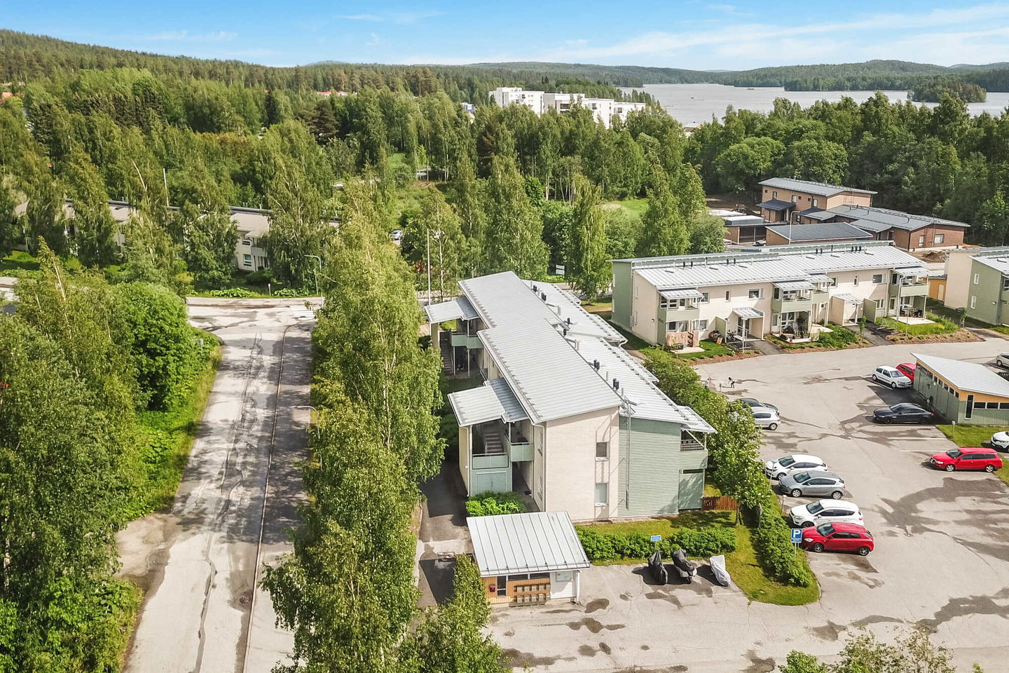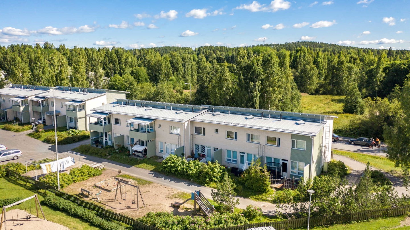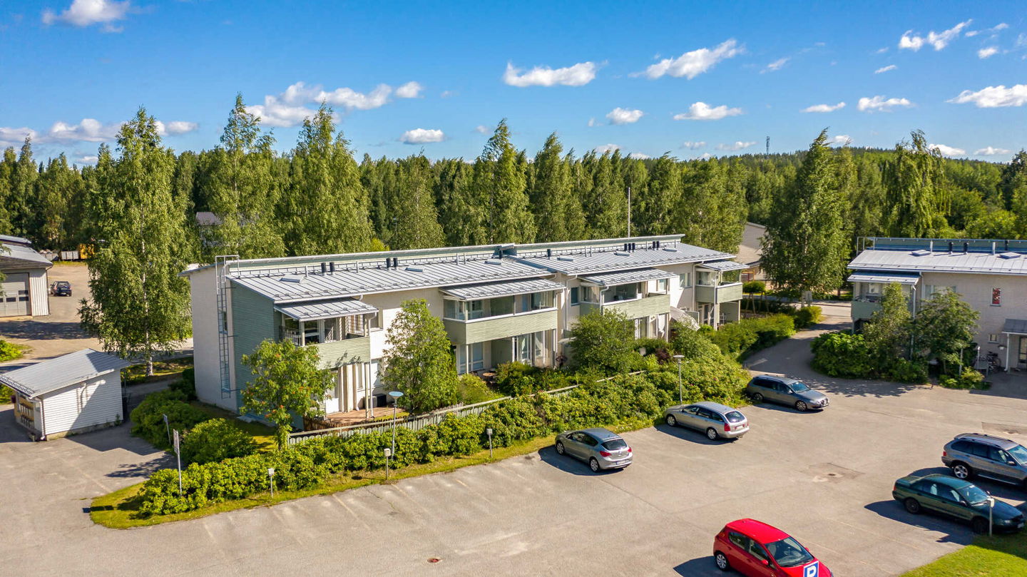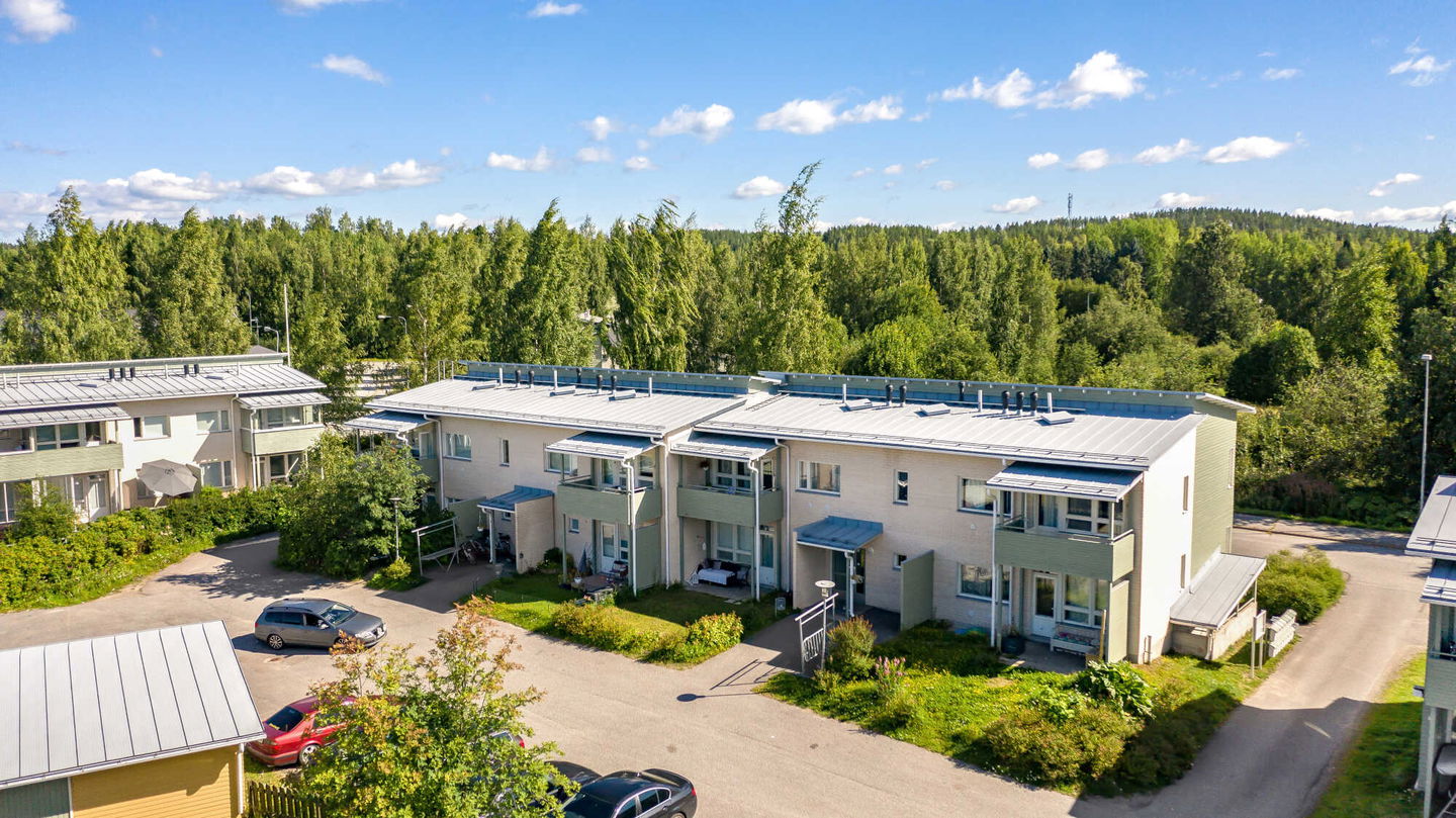Kodikas rivi-/pienkerrostalo vettä rakastavalle: Talo sijaitsee Jyväsjärven eri osat yhdistävän Äijälänsalmen rannan tuntumassa, Äijälänsalmen vanhan sillan lähellä. Salmen toisella puolella on Kuokkalankartano puulajistopuistoineen ja pienvenesatama.