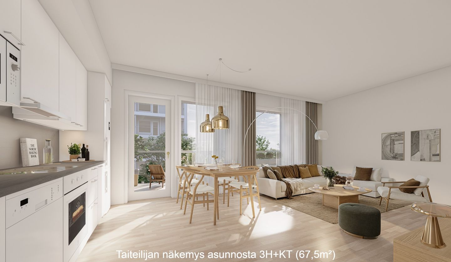 Keittiö on omassa rauhassaan ja avautuu olohuoneeseen. Keittiössä on hyvin kaappi- ja laskutilaa, ruokapöydälle löytyy oma paikkansa. Olohuoneesta on käynti asunnon levyiselle lasitetulle länsiparvekkeelle.