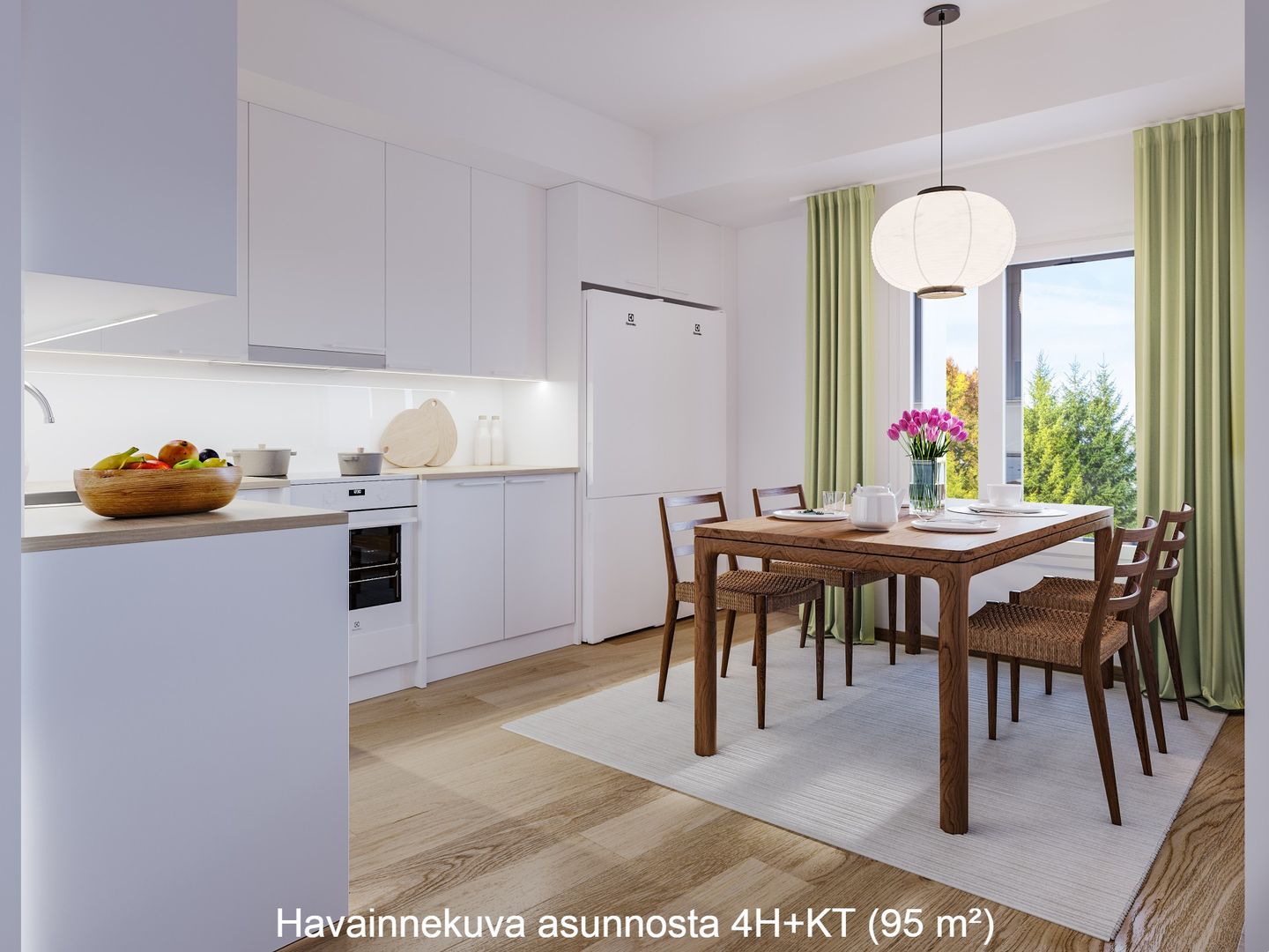 Keittiö on erillään omassa rauhassaan ja siellä on paljon kaappi- ja laskutilaa. Keittiöstä löytyy myös isommallekin ruokapöydälle oma paikkansa. Olohuoneesta on käynti asunnon toiselle huoneiston levyiselle lasitetulle parvekkeelle, joka aukeaa etelään.