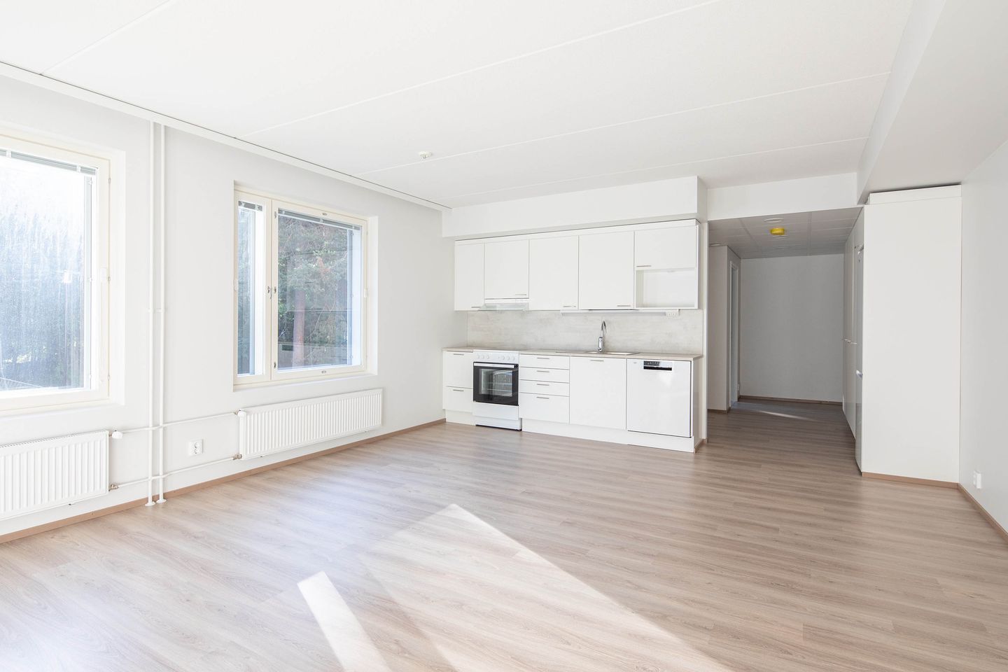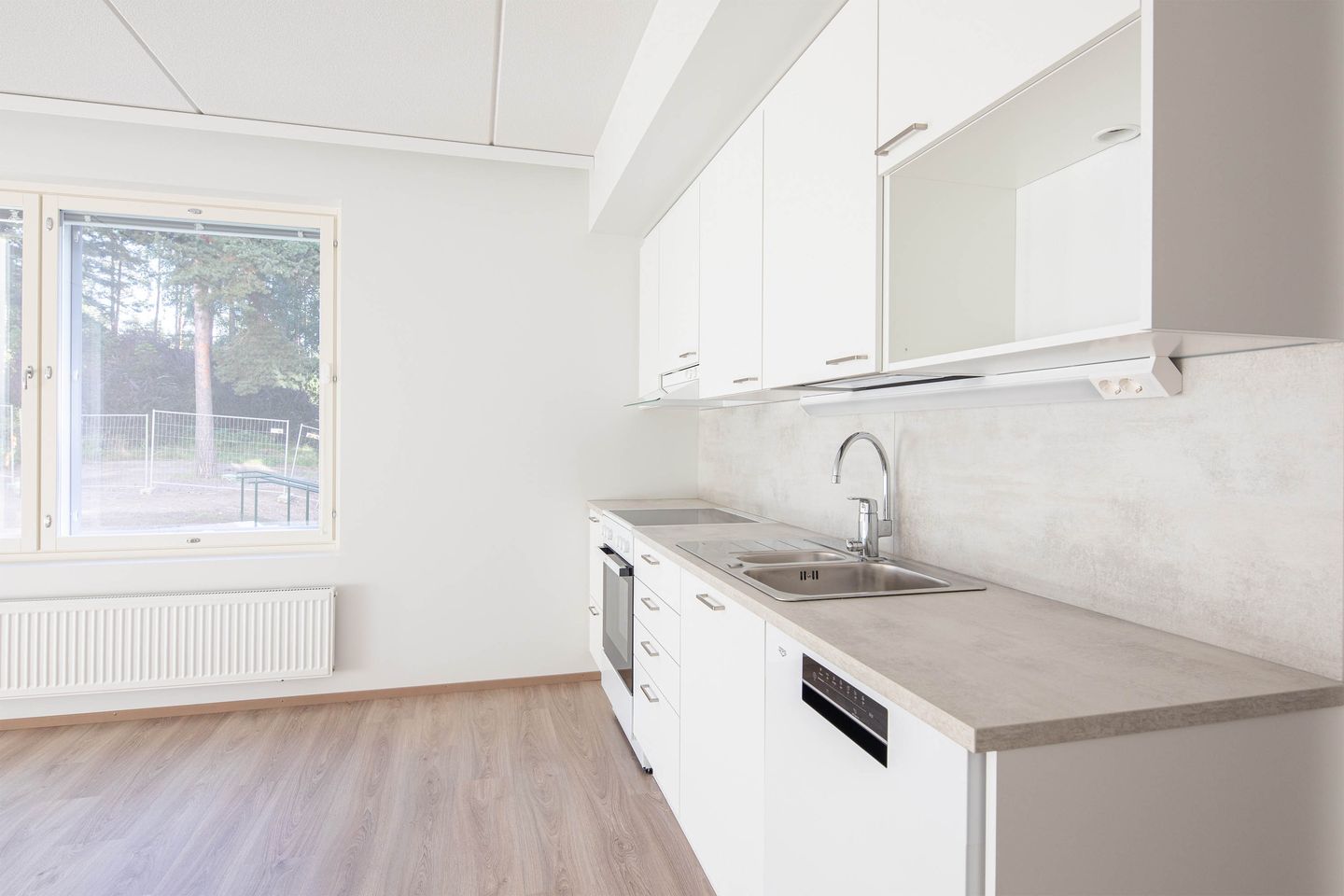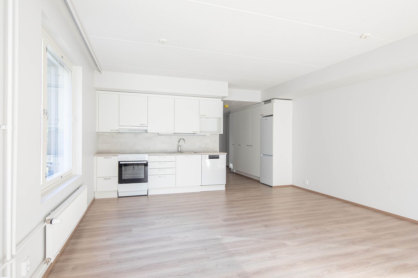 Keittiö on yhtenäistä tilaa olohuoneen kanssa, myös ruokapöydälle löytyy oma paikkansa ikkunan edustalta.