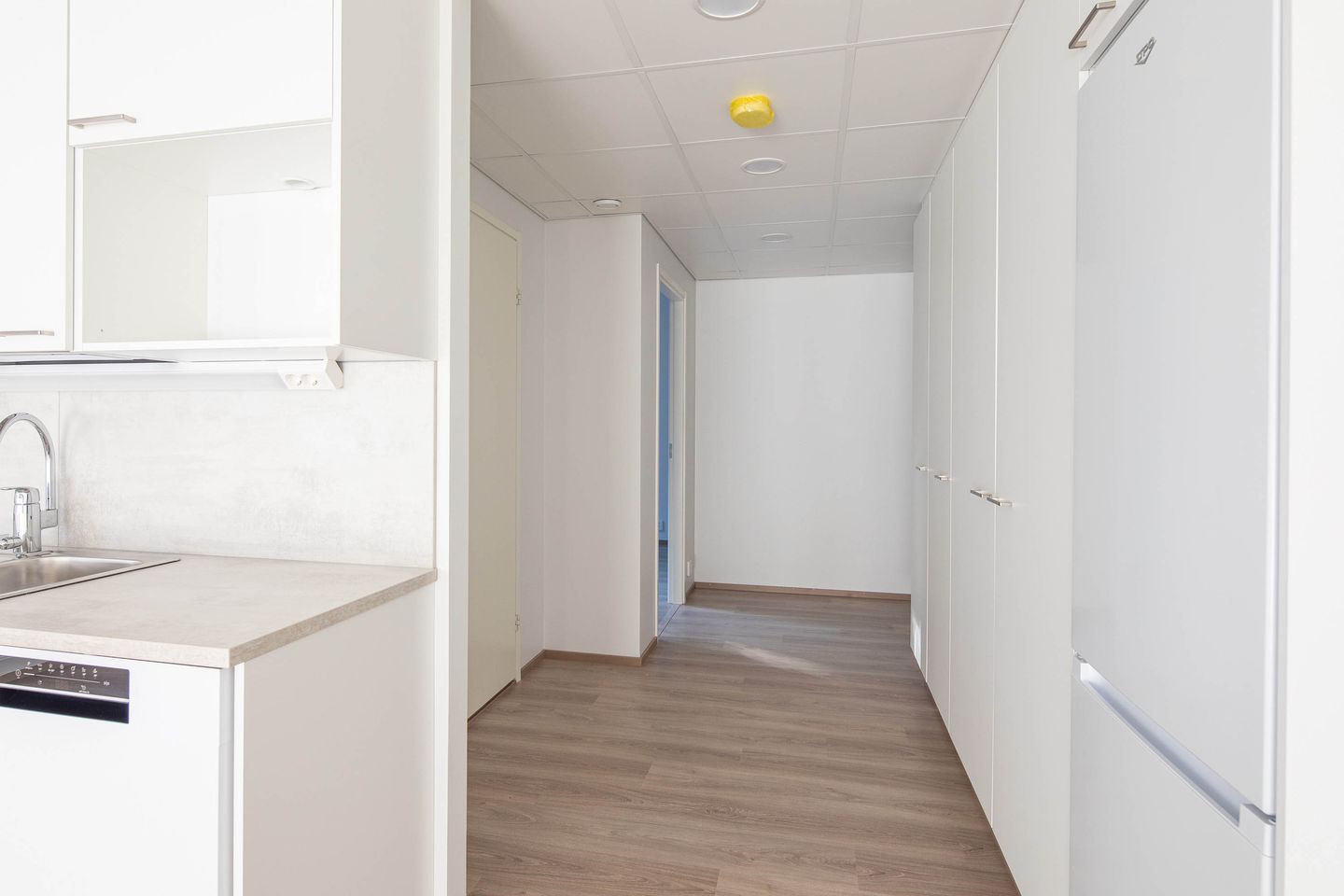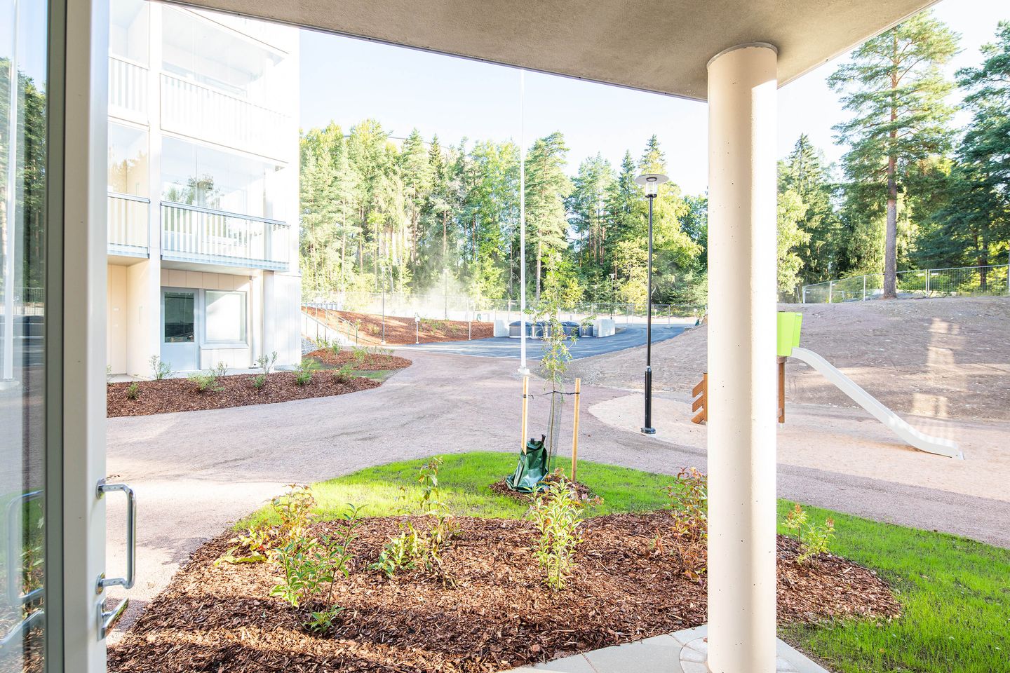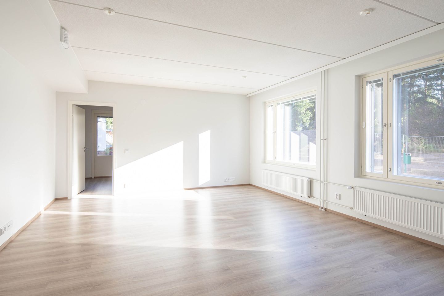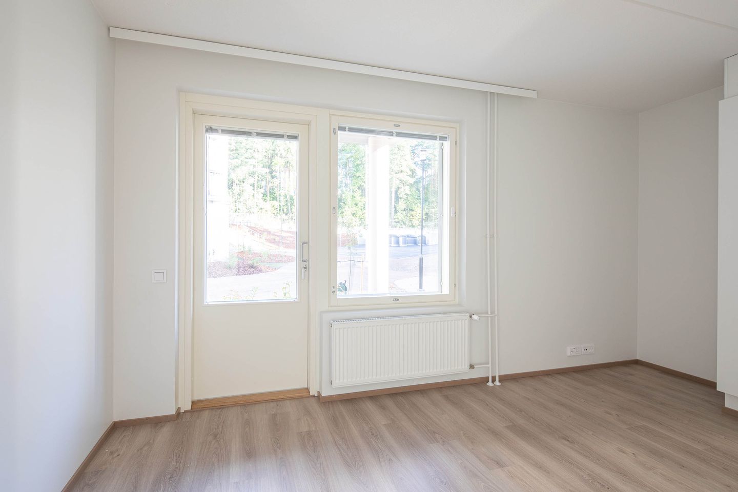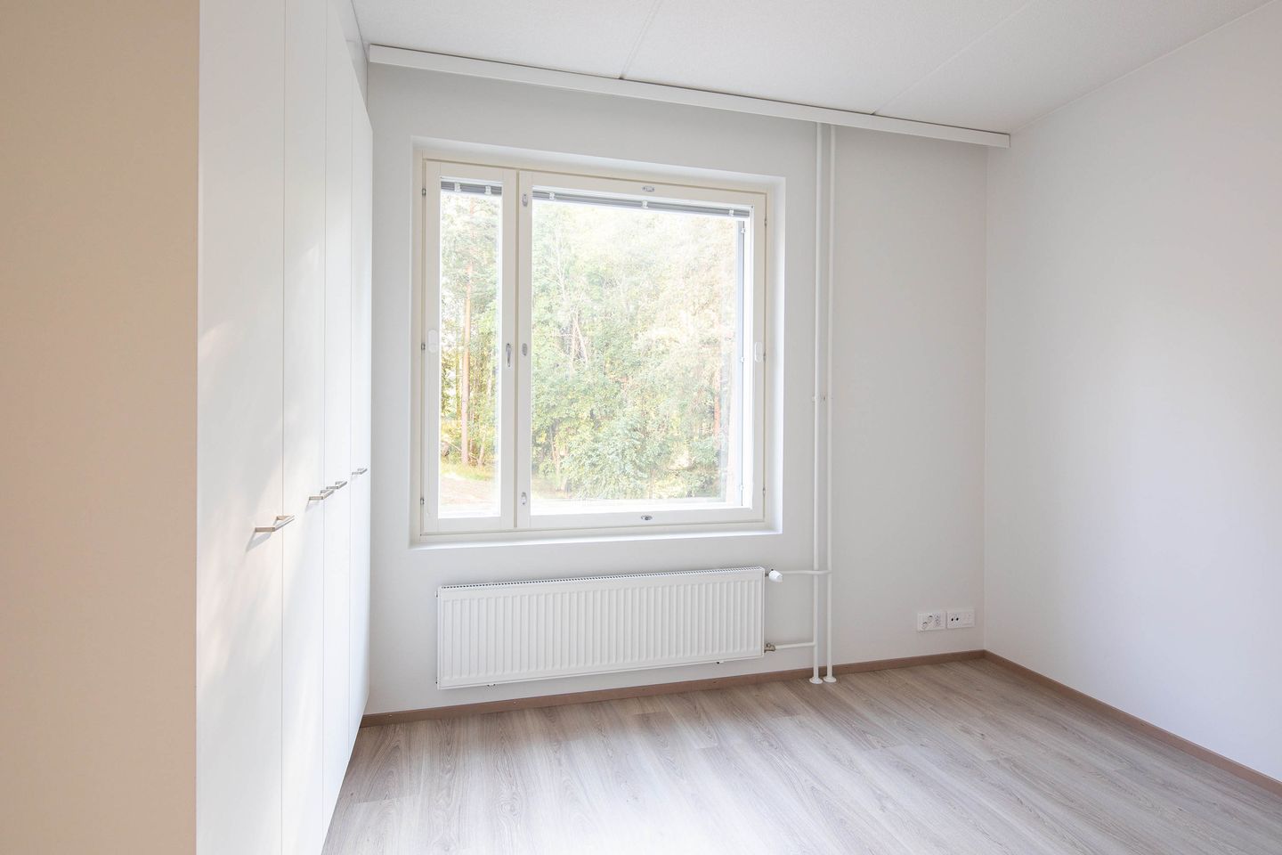 Makuuhuoneet ovat erillään toisistaan ja niissä on hyvinä säilytystiloina vaatekaapit. Isommasta makuuhuoneesta käynti omalle terassille, joka avautuu pohjoiseen. Koulut ja kaupat löytyvät ihan nurkan takaa. Autolle löytyy vapaana lämpötolpallinen parkkipaikka pihasta. Lähialueen vehreät ulkoilumaastot kutsuvat virkistäytymään.