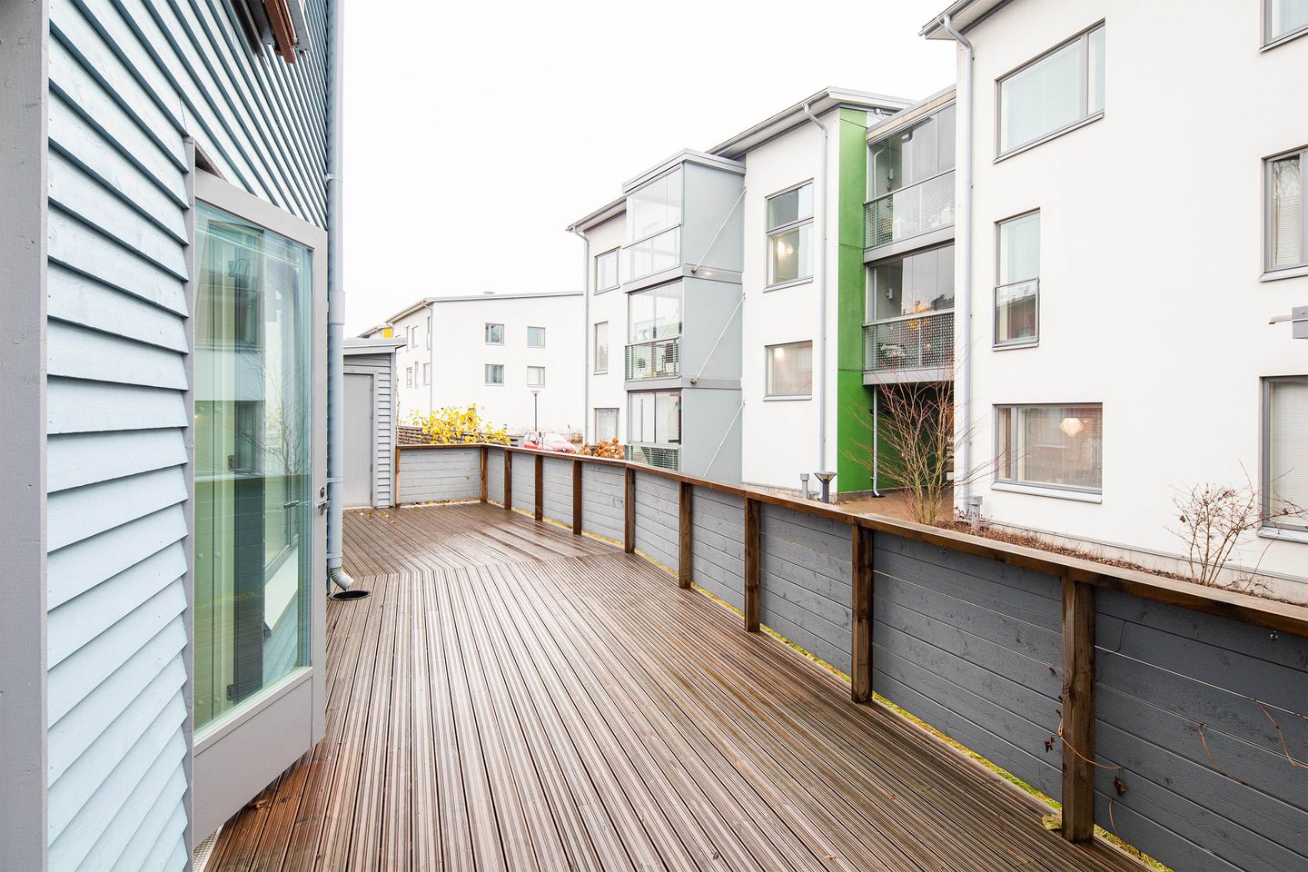 Asunto on valoisa, hyväkuntoinen, siisti ja vaaleasävyinen. Lattiat ovat vaaleanharmaata laminaattia. Kylpyhuoneissa on suuret valkoiset seinälaatat ja tummanharmaat lattialaatat. Asunnon erityinen piirre lienee pihapiirin suurin, etelään ja länteen avautuva terassi (15 x 3m).