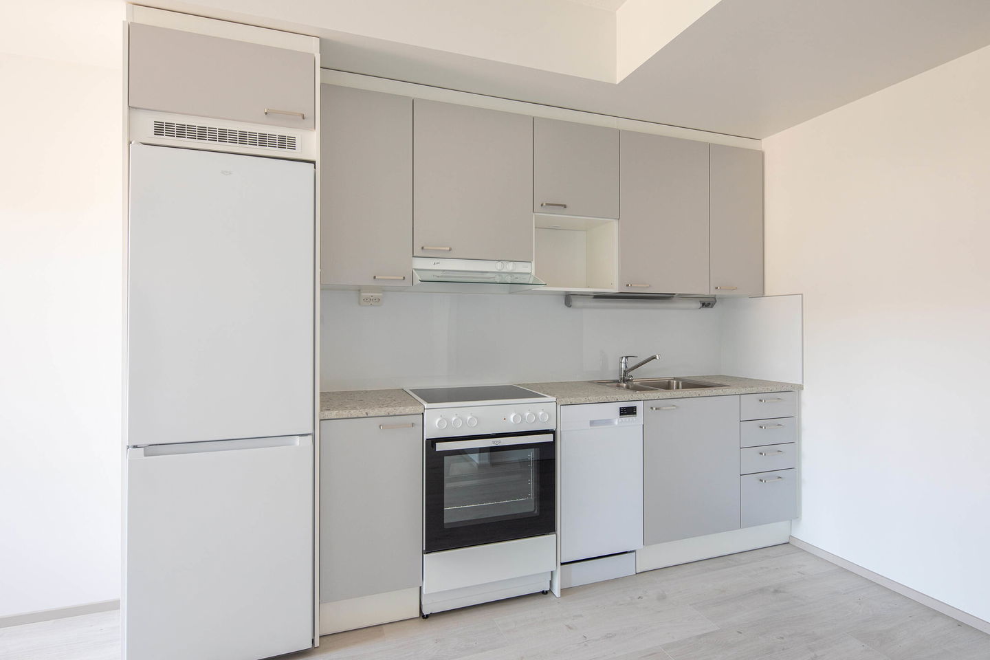 Keittiö on yhtenäistä tilaa olohuoneen kanssa ja ruokapöydälle / työpöydälle löytyy oma paikka olohuoneen yhteydessä esimerkiksi ikkunan alta.