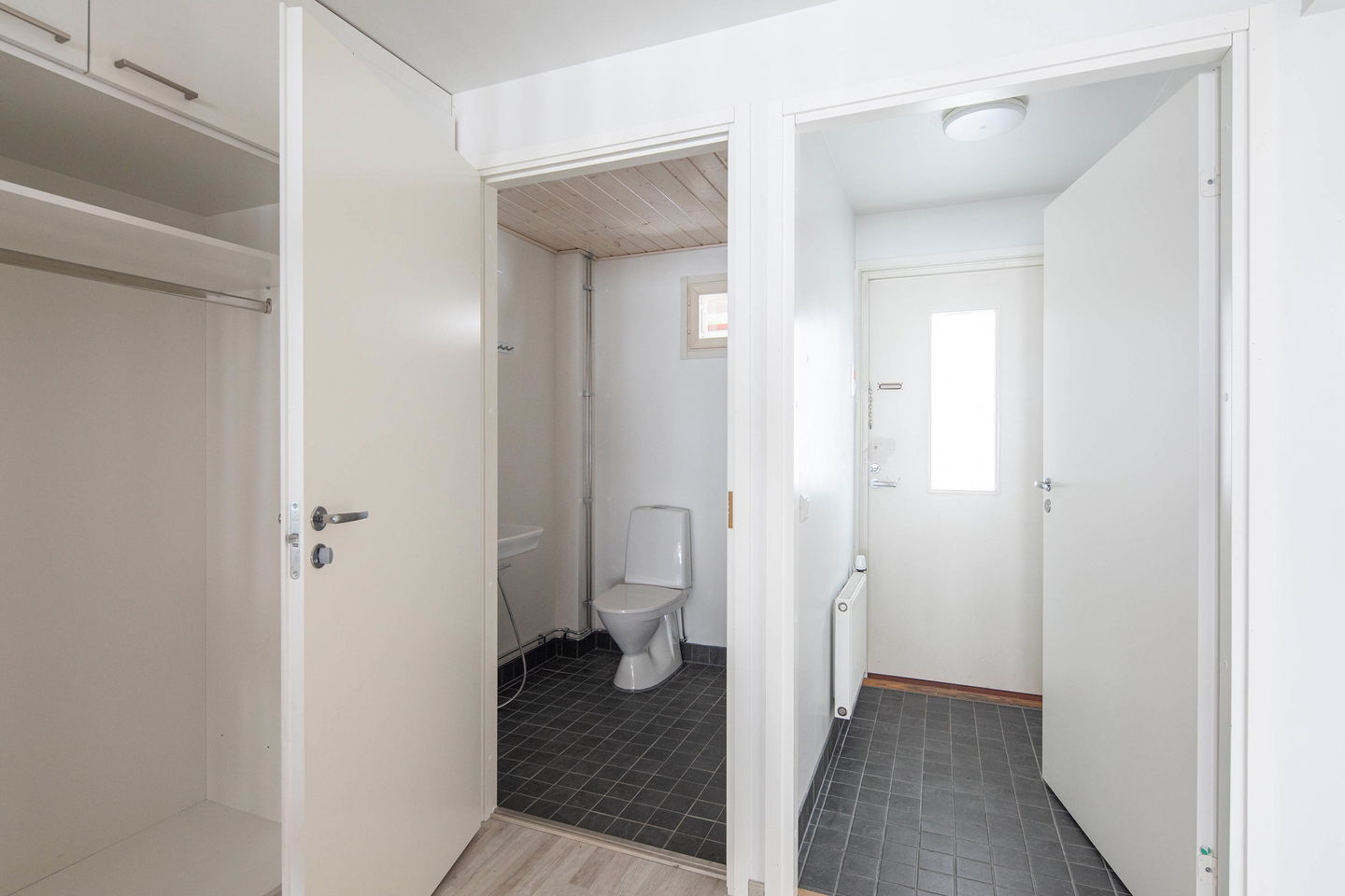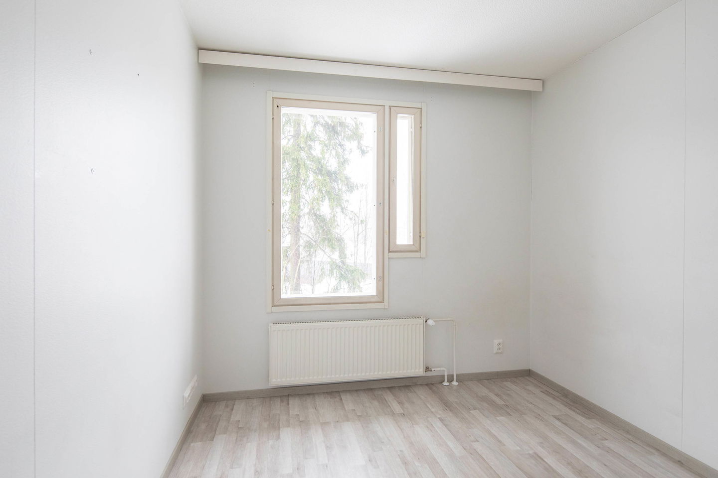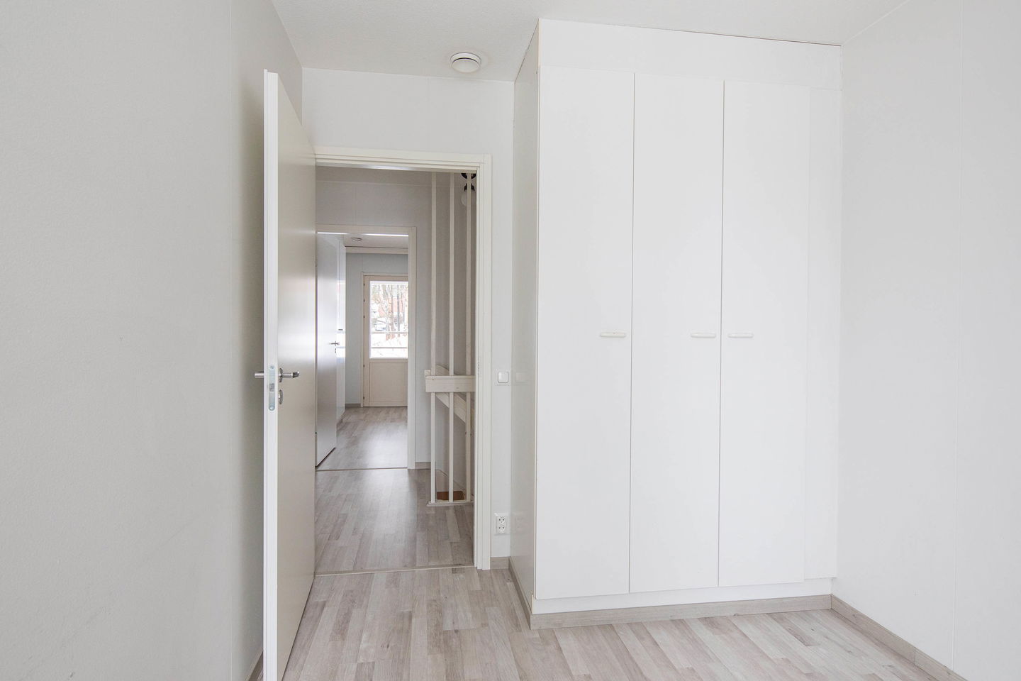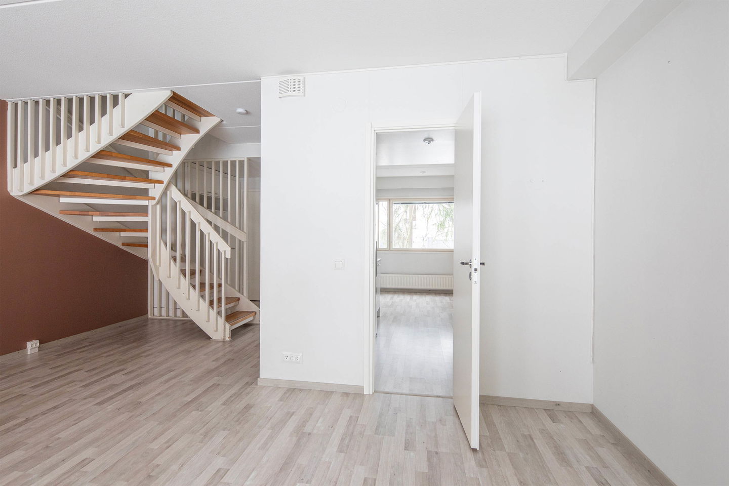 Asunto on kahdessa kerroksessa, alakerrassa on keittiö, olohuone- josta kulku takapihalle sekä erillis wc ja yläkerrasta löytyy makuuhuoneet, sekä saunallinen kylpyhuone.