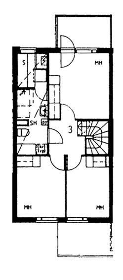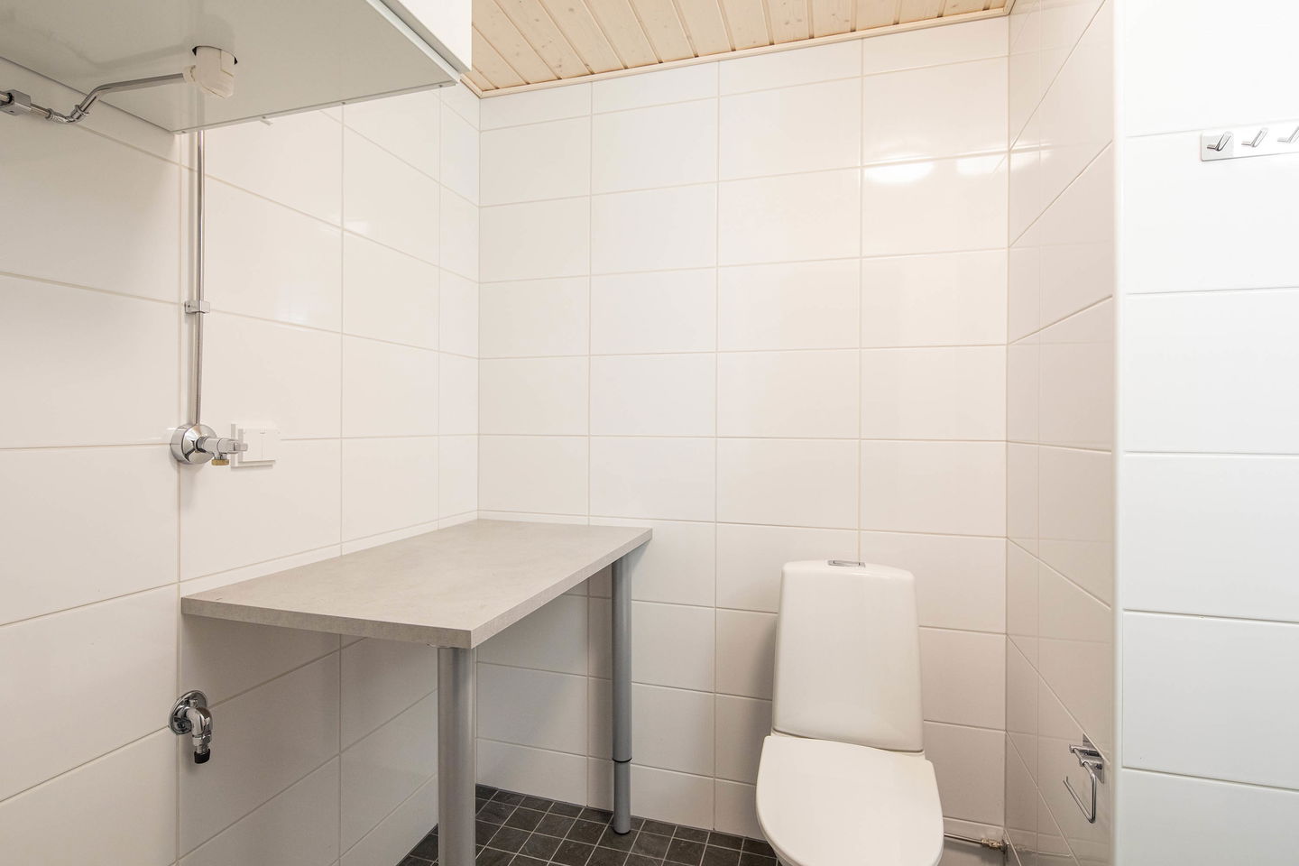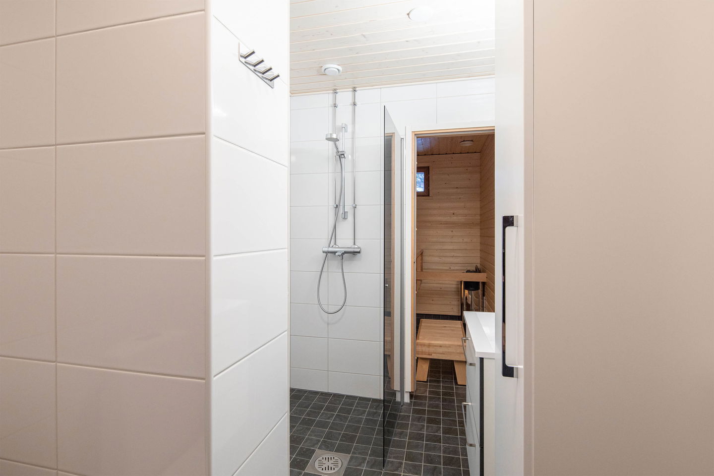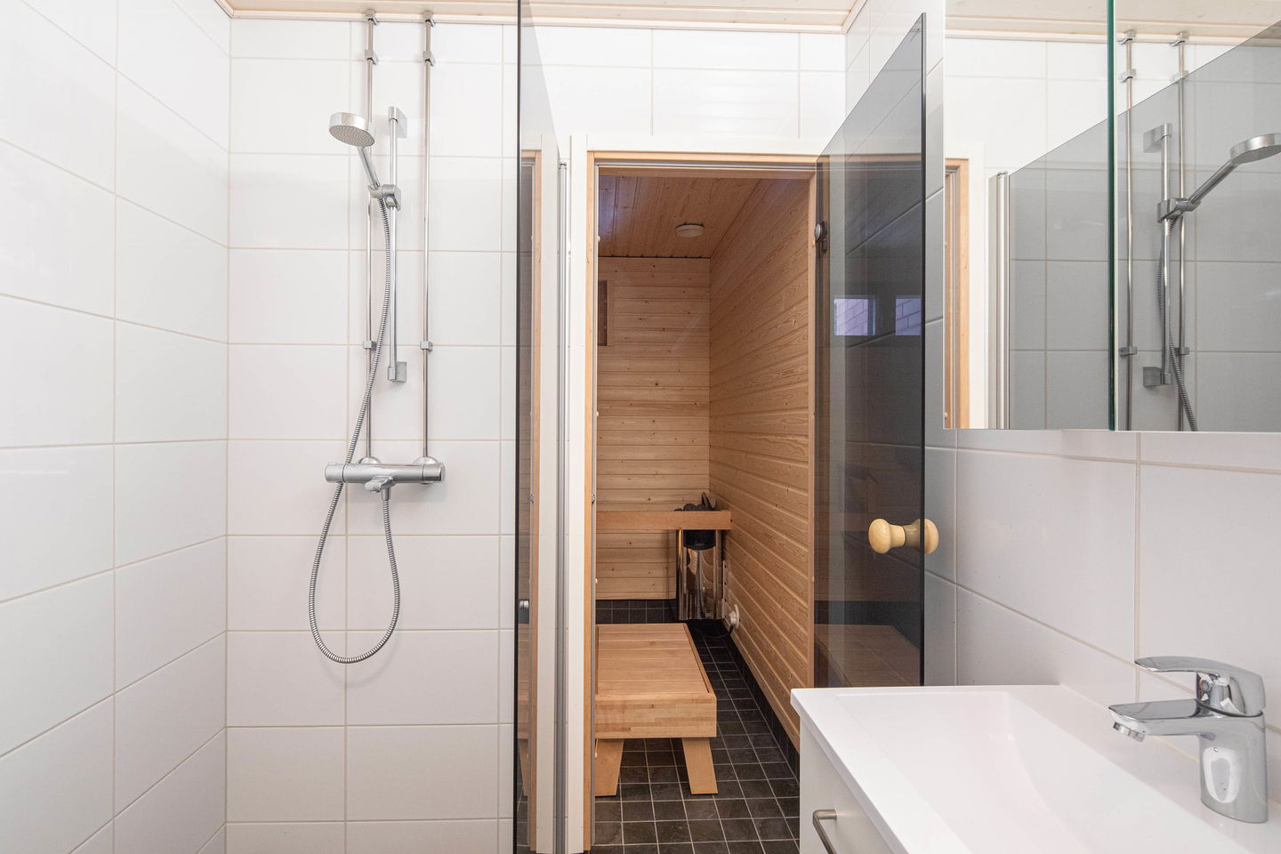 Asunto on kahdessa kerroksessa, alakerrassa on keittiö, olohuone- josta kulku takapihalle sekä erillis wc ja yläkerrasta löytyy makuuhuoneet, sekä saunallinen kylpyhuone.