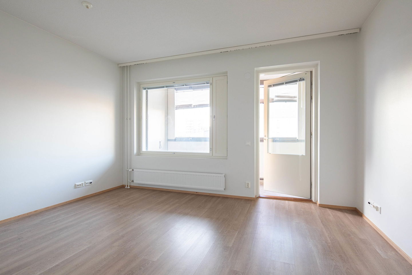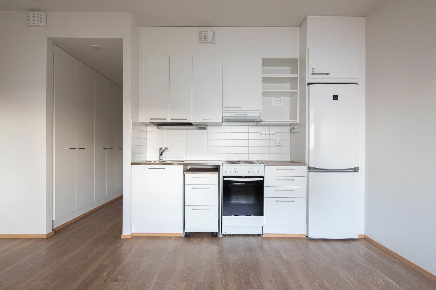 Tässäpä kompakti yksiö, vähiin neliöihin saatu tehokkaasti tuotua kaikki mitä tarvitset asumiseen. Keittiö, olohuone ja makuuhuone ovat yhtä tilaa ja sen saa kätevästi sisustettua.