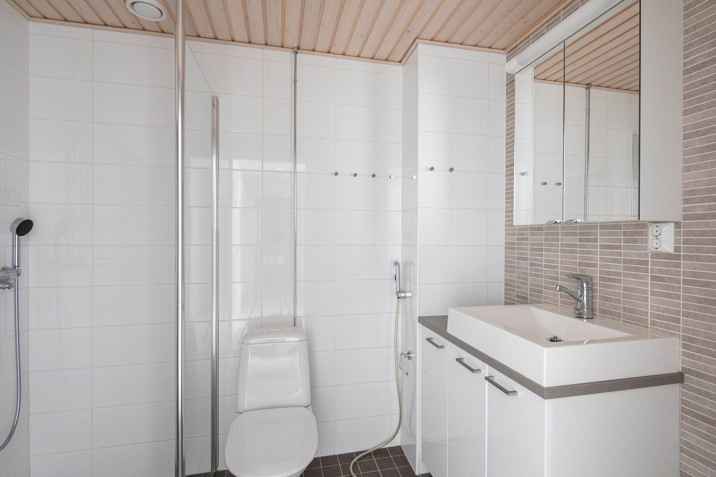 Lattiapäällysteet asuinhuoneessa ovat lautalaminaattia ja kosteat tilat on laatoitettu.