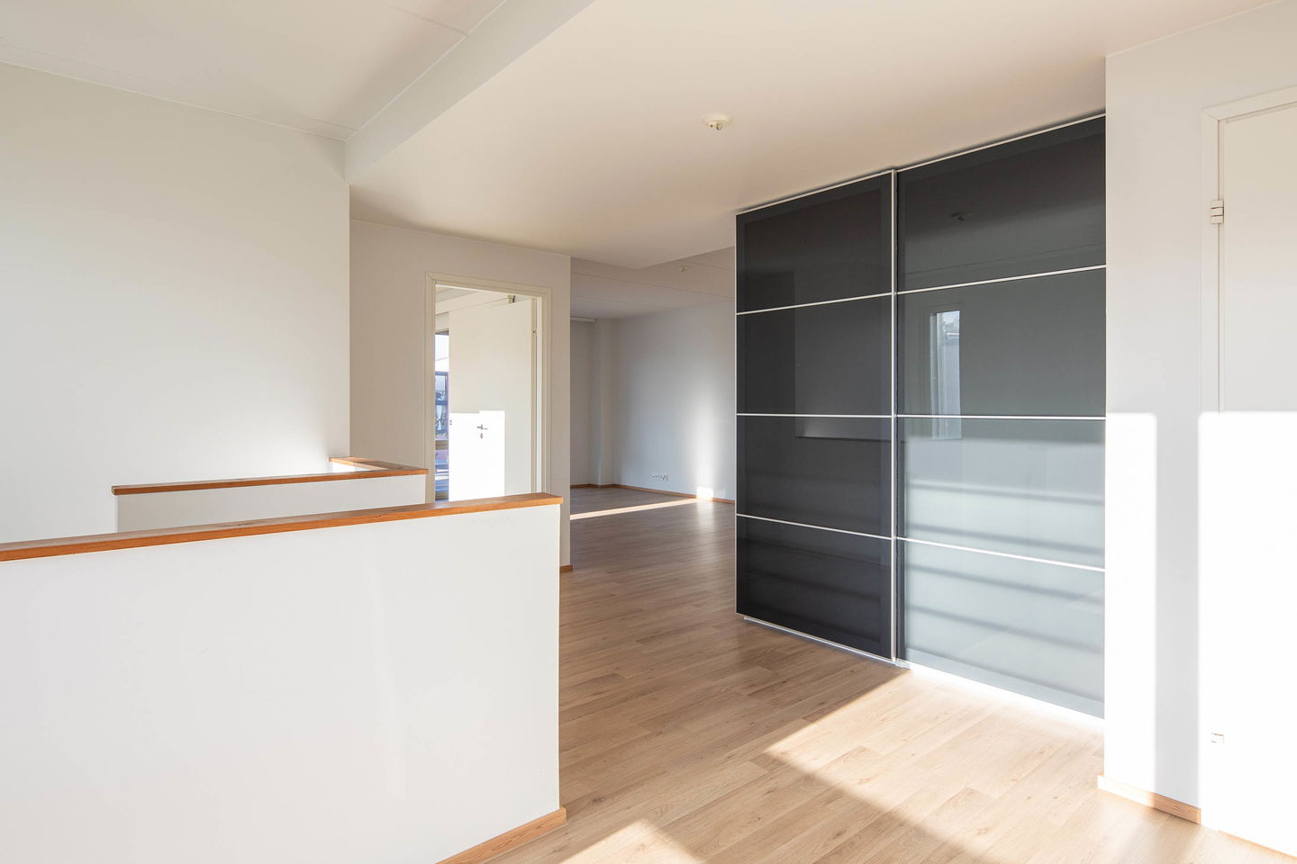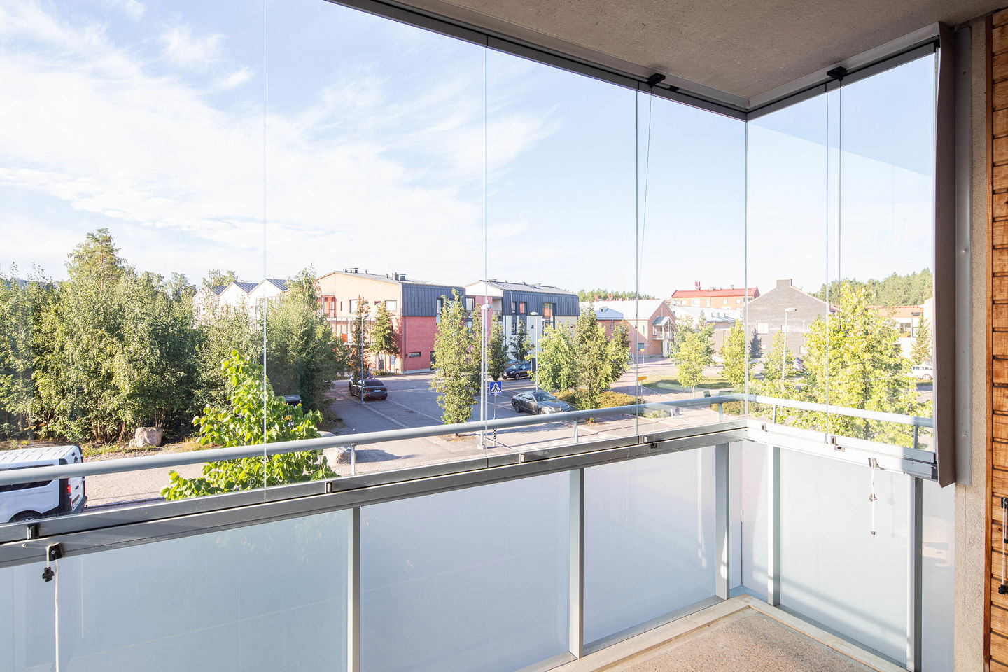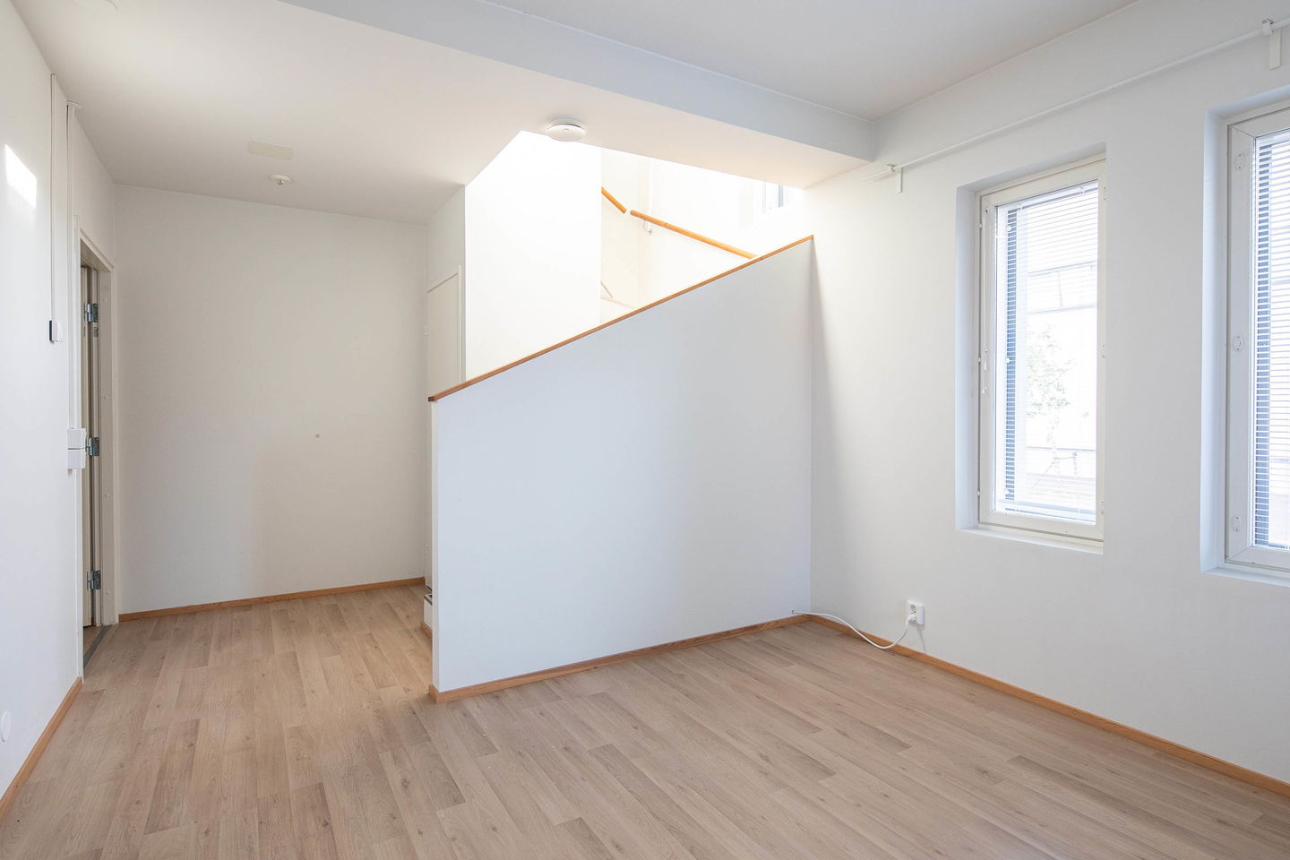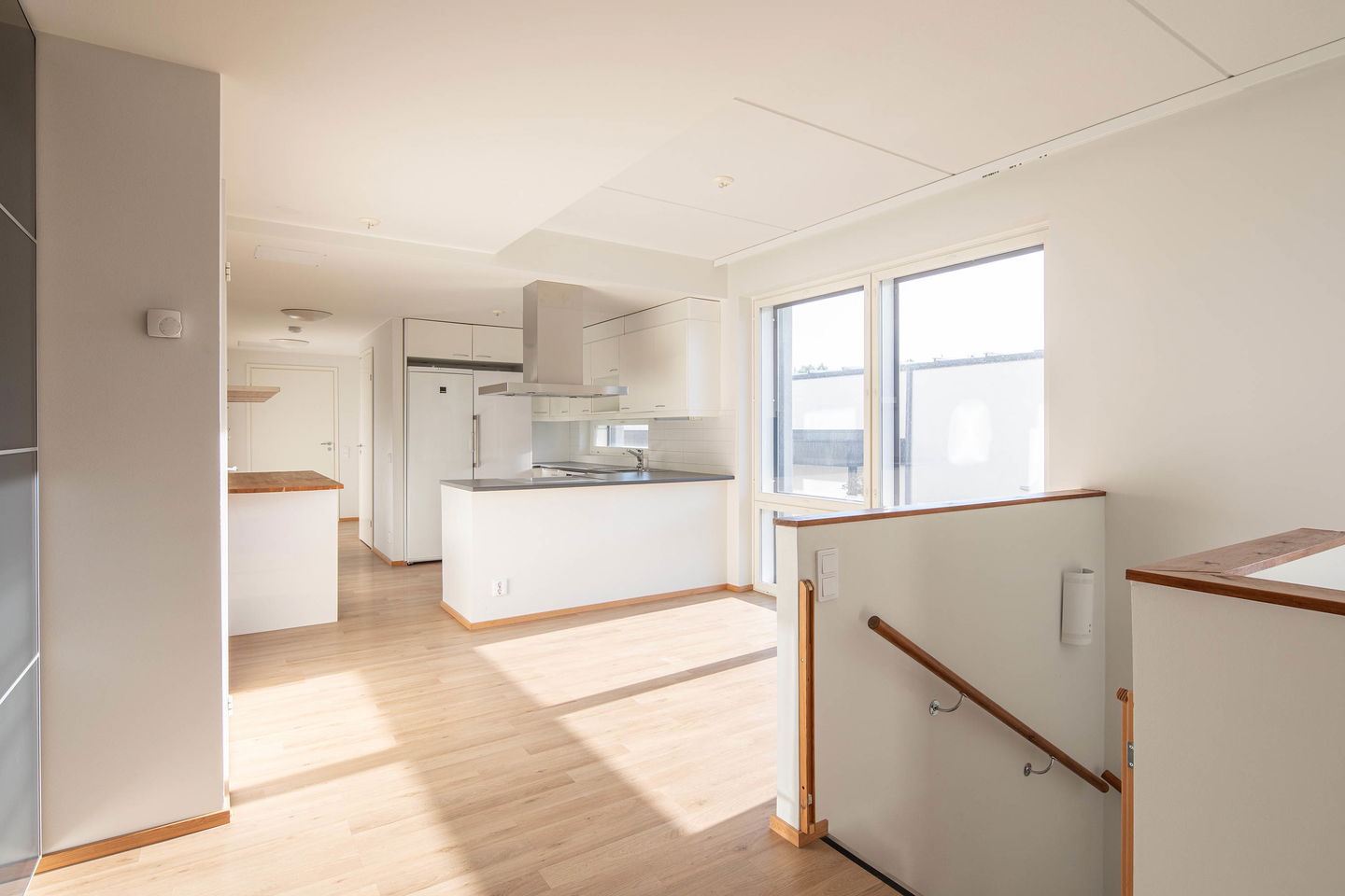 Huoneisto jakautuu kaikkiaan kolmeen tasoon. Ylimmästä kerroksesta löytyy tilava perheasunto - siellä sijaitsee kolme makuuhuonetta, helposti sisustettavat olohuone ja keittiö/ruokailutila sekä asunnon kodinhoitohuone, sauna ja pesutilat. Ikkunat on asunnossa kolmeen eri suuntaan tehden tiloista mukavan valoisat. Olohuone jatkuu aurinkoiselle lasitetulle eteläparvekkeelle. Sisäänkäynti ylimpään kerrokseen on kohteen rappukäytävästä.