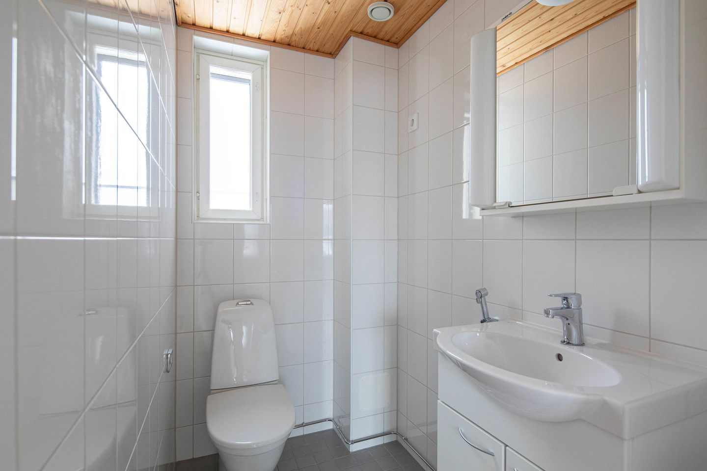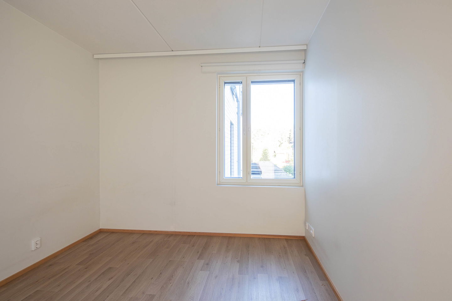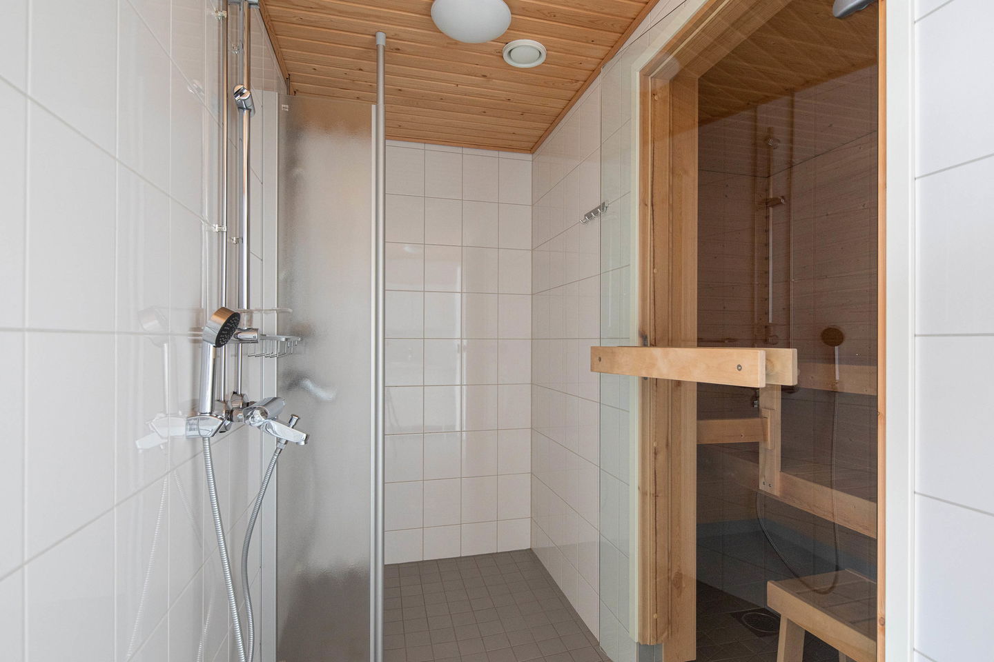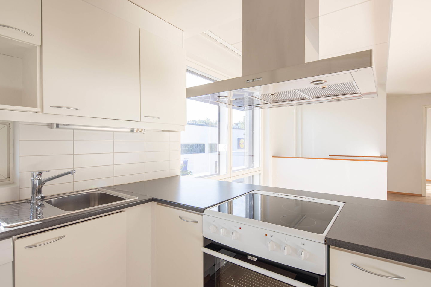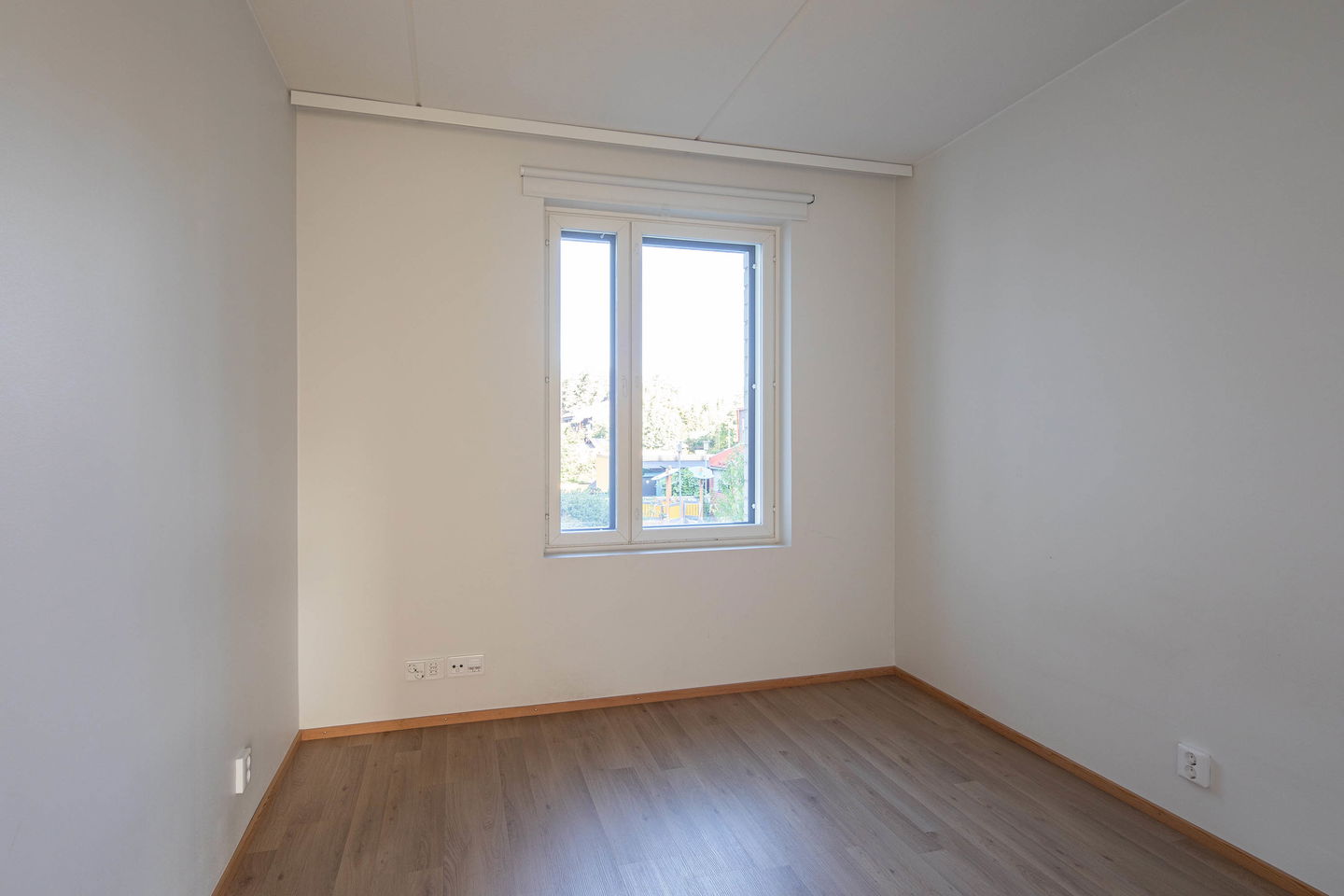 Huoneisto jakautuu kaikkiaan kolmeen tasoon. Ylimmästä kerroksesta löytyy tilava perheasunto - siellä sijaitsee kolme makuuhuonetta, helposti sisustettavat olohuone ja keittiö/ruokailutila sekä asunnon kodinhoitohuone, sauna ja pesutilat. Ikkunat on asunnossa kolmeen eri suuntaan tehden tiloista mukavan valoisat. Olohuone jatkuu aurinkoiselle lasitetulle eteläparvekkeelle. Sisäänkäynti ylimpään kerrokseen on kohteen rappukäytävästä.