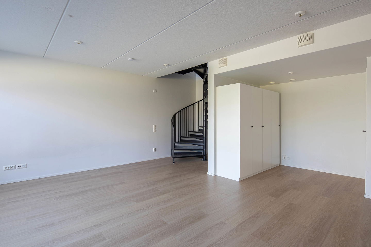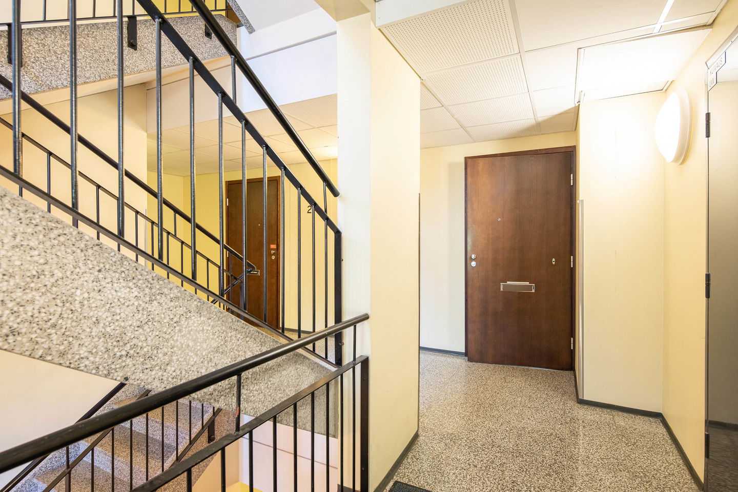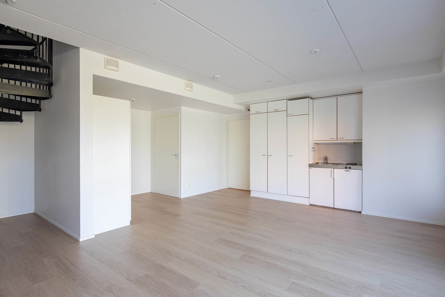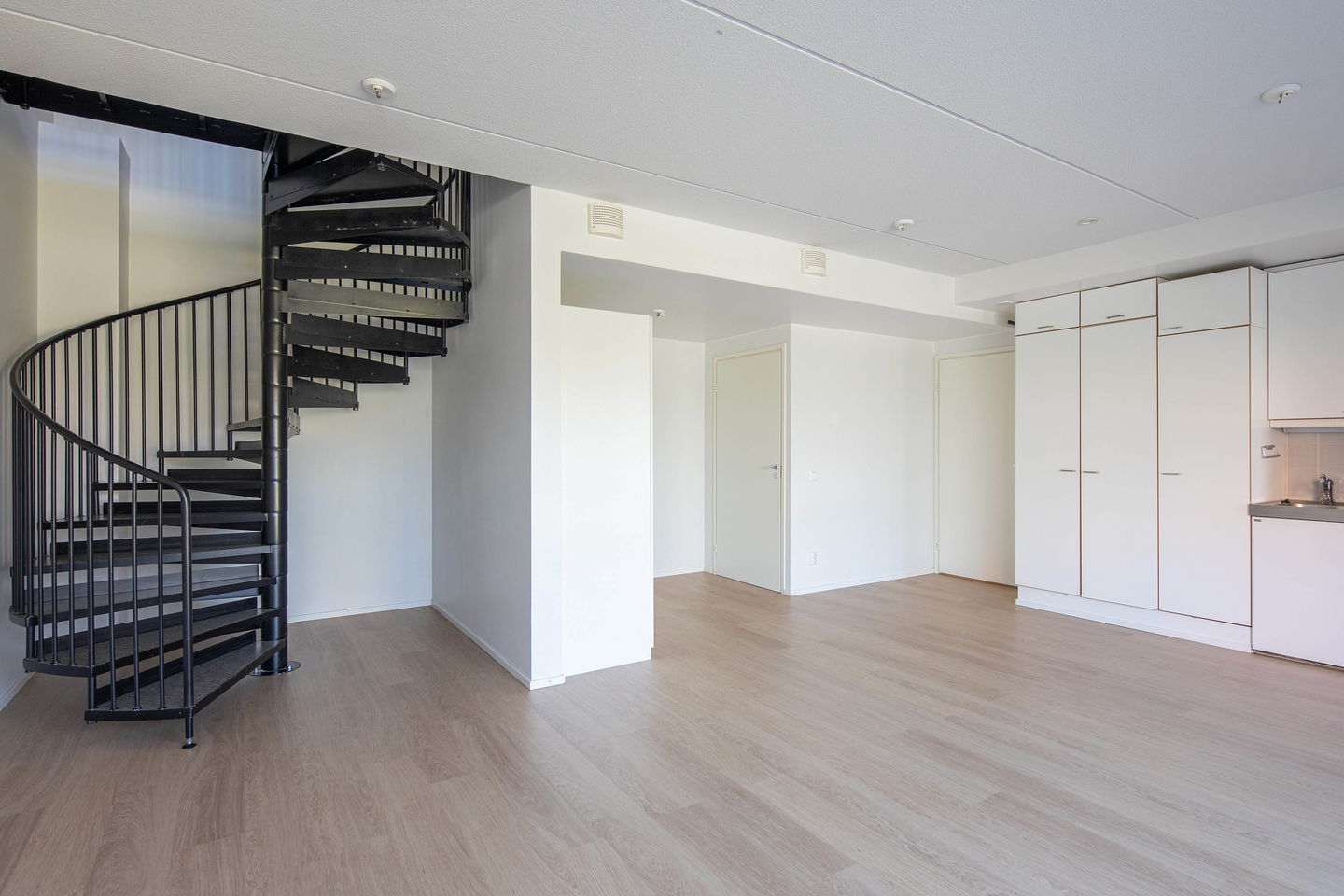 Kokonaisuus on kahdessa kerroksessa, kahdella sisäänkäynnillä. Asuntoja yhdistää kierreportaat. Yksityisyrittäjälle loistopaikka, työpaikka alhaalla, koti ylhäällä. Tai kahdelle kaverukselle yhteinen koti, omissa kerroksissaan. Moneen taipuva kokonaisuus!