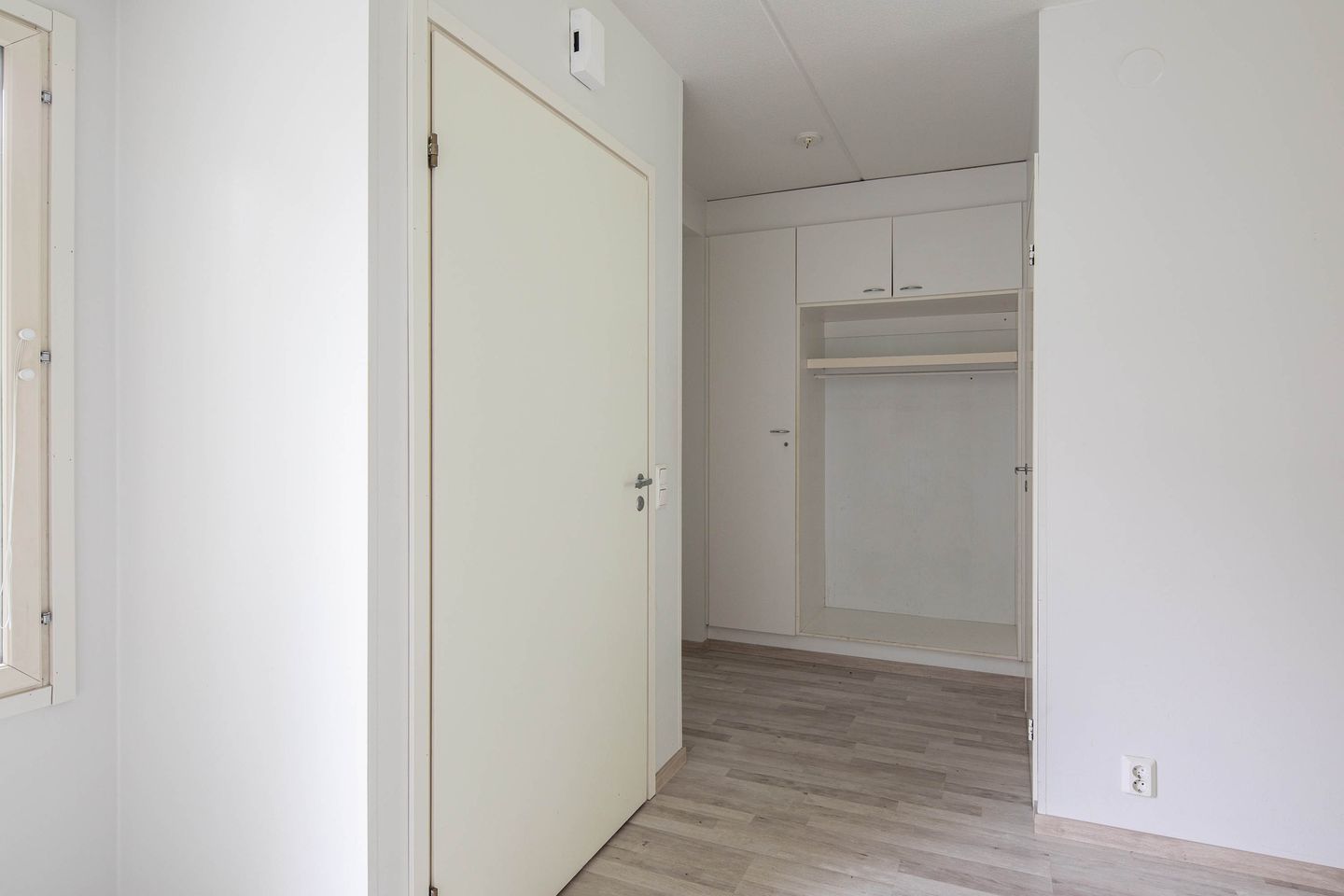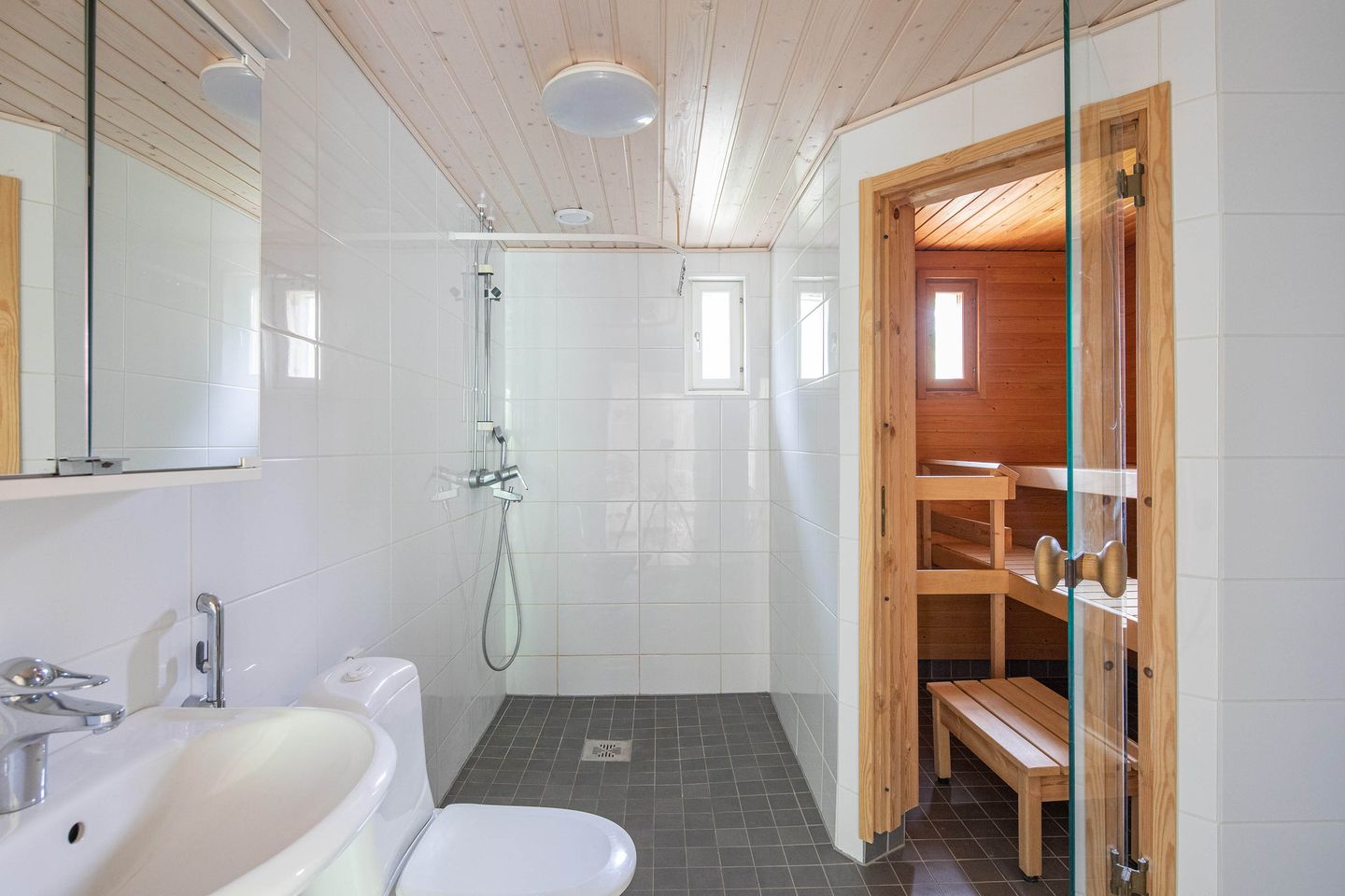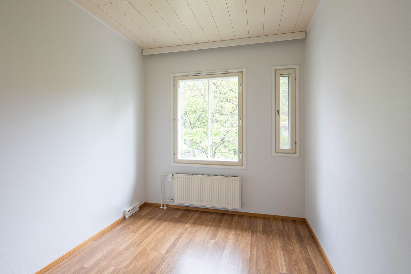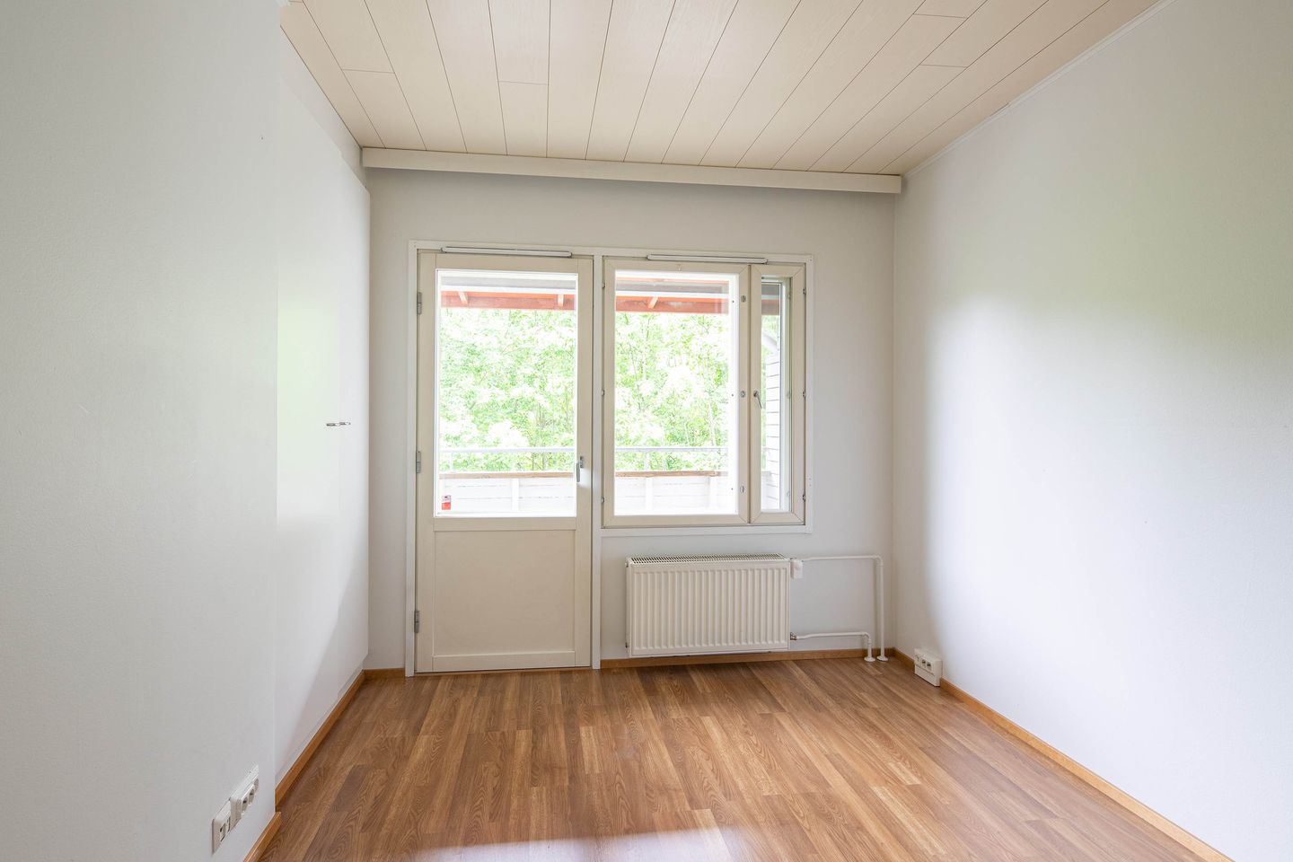 Yläkerrasta löytyvät makuuhuoneet, joissa on runsaasti säilytystilaa. Oma sauna ja kylpyhuone tuovat arkeen mukavuutta. Asunto sopii hyvin perheelle, joka arvostaa käytännöllisiä tiloja ja rivitaloasumisen rauhaa.