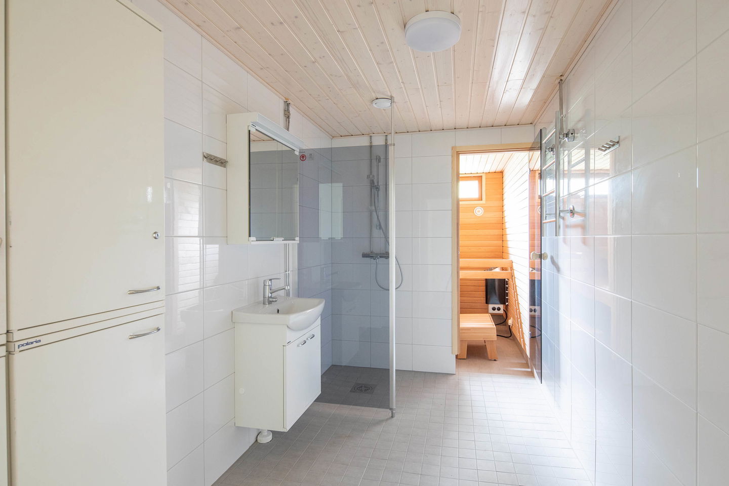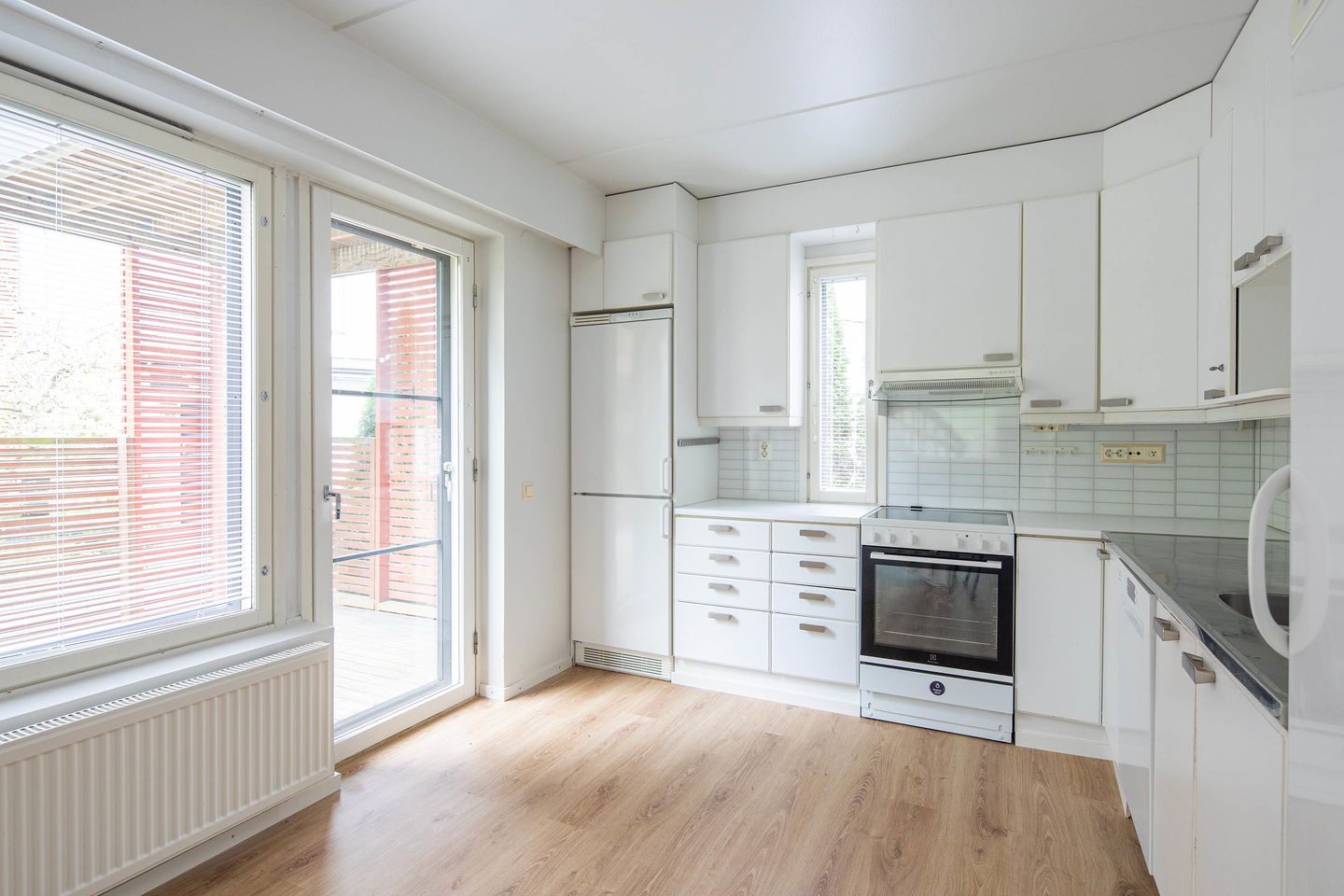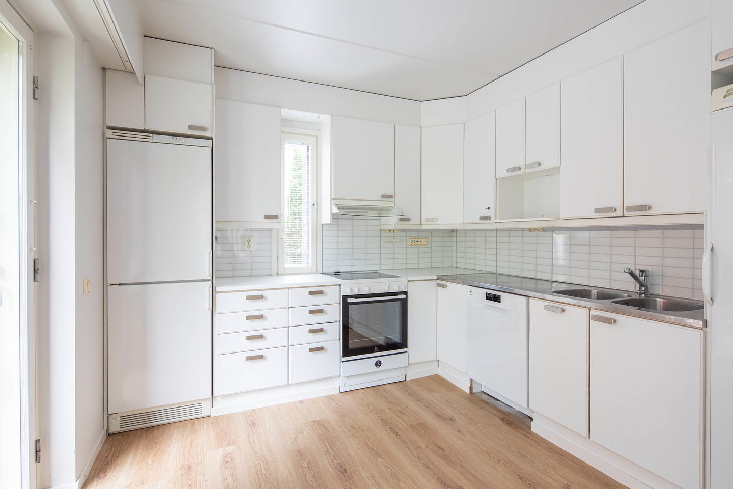 Tilavassa keittiössä on tilaa kaikille perheenjäsenille tai esimerkiksi työ- ja harrastustilaa kotitoimistolle. Hyvin suunniteltu keittiö tarjoaa runsaasti kaappi- ja laskutilaa sekä erinomaiset puitteet ruoanlaittoon.