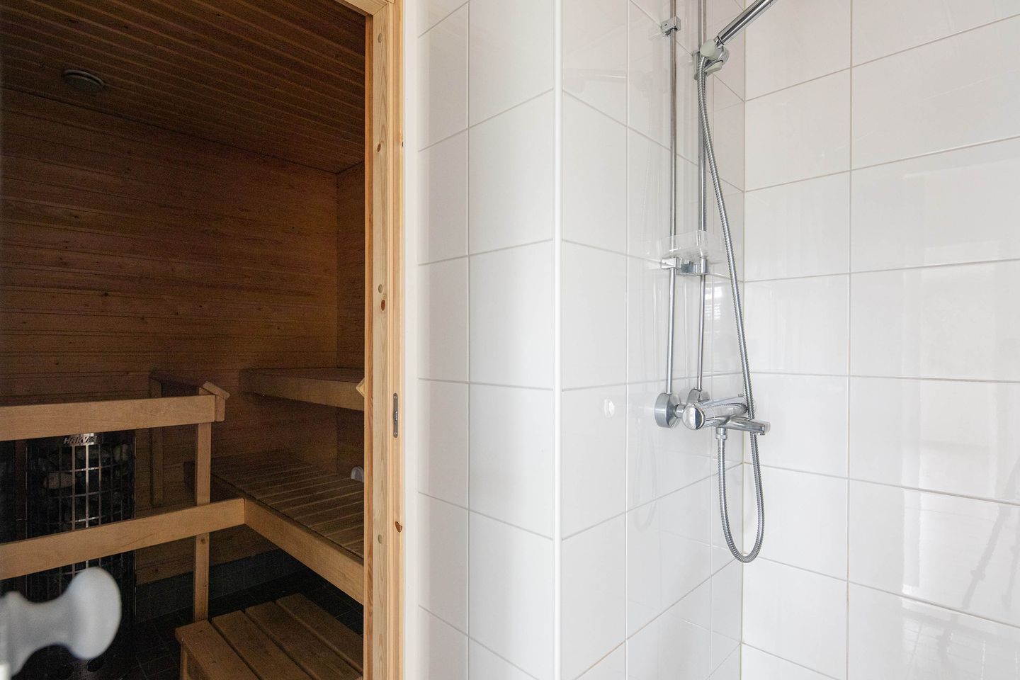 Yläkerrassa on kolme makuuhuonetta, joissa jokaisessa on hyvin säilytystilaa. Yläkerran kylpyhuoneessa on suihku ja oma sauna. Pieni aula yläkerrassa toimii joustavasti esimerkiksi työtilana, leikkialueena tai vaikka lukusopena.