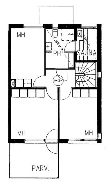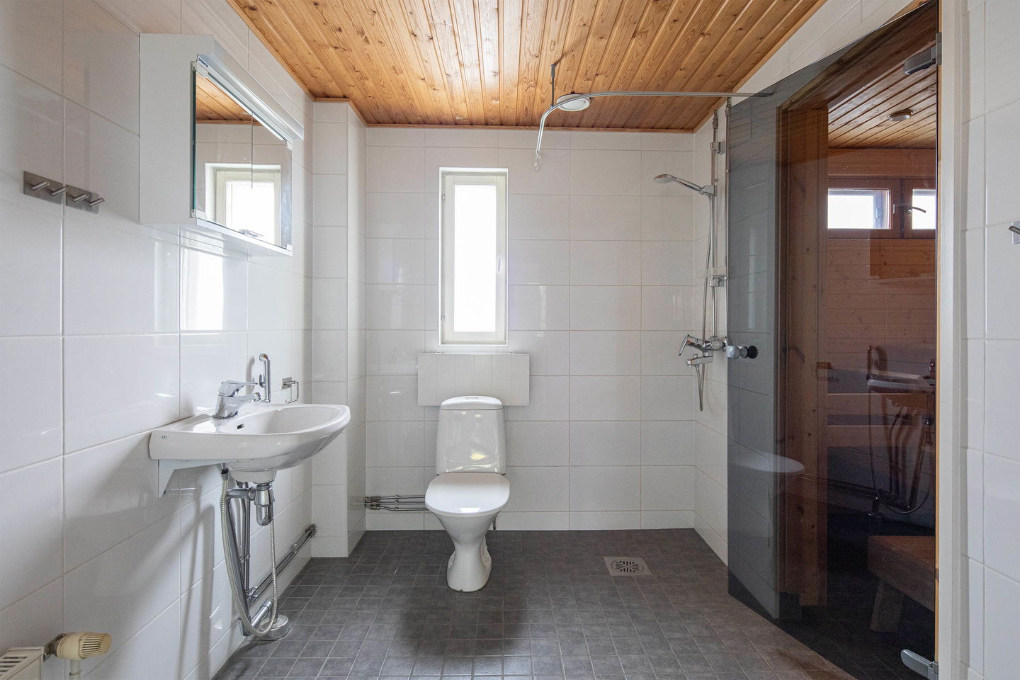 Yläkersrasta löytyy kolme tilavaa makuuhuonetta, joista päämakuuhuoneessa on oma vaatehuone. Lisäksi yläkerrassa sijaitsee sauna ja kylpyhuone