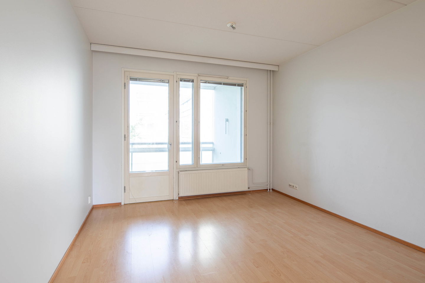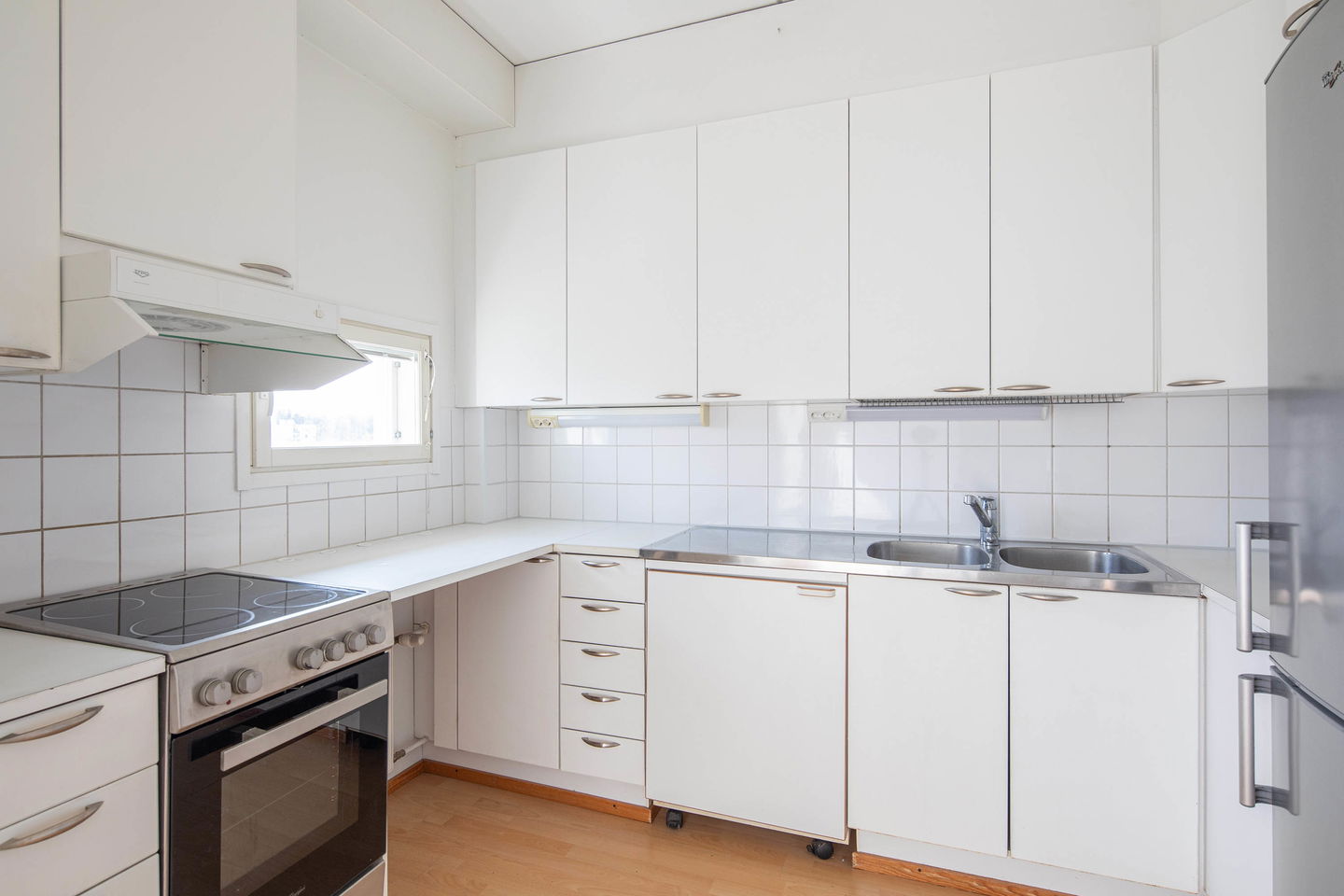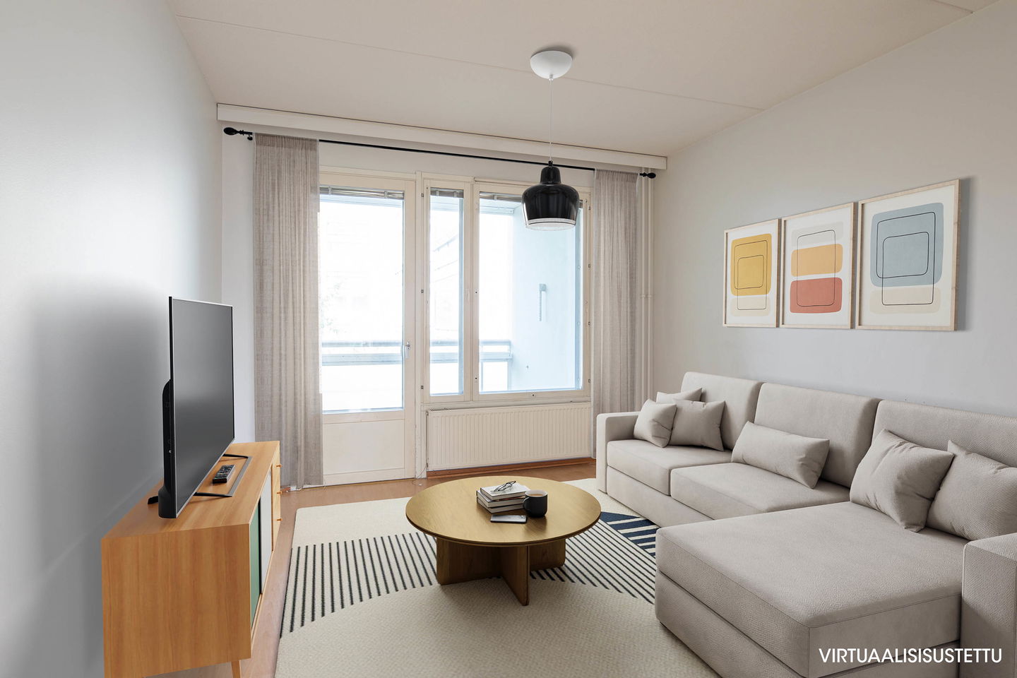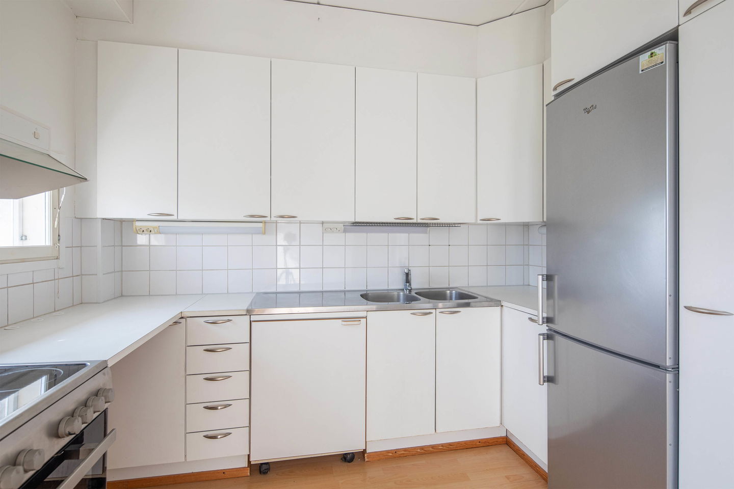 Kodissa on erillinen keittiö, johon mahtuu ruokapöytä, sekä tilava olohuone, josta on kulku lasitetulle parvekkeelle. Kaksi makuuhuonetta sijoittuvat vierekkäin, ja molemmissa on vaatekaapit säilytystilaa varten. Asunnossa on erillinen WC sekä kylpyhuone, jossa tilaa myös pesukoneelle.