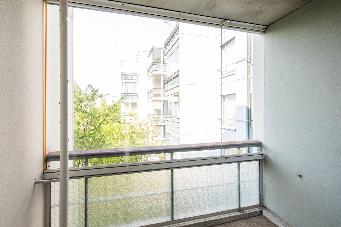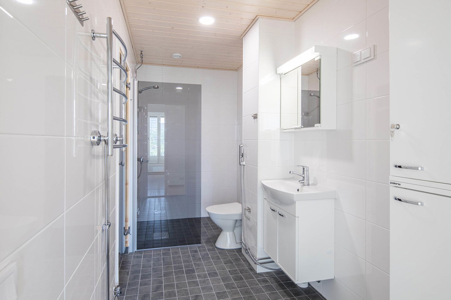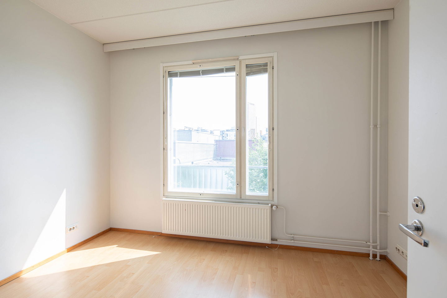 Kodissa on erillinen keittiö, johon mahtuu ruokapöytä, sekä tilava olohuone, josta on kulku lasitetulle parvekkeelle. Kaksi makuuhuonetta sijoittuvat vierekkäin, ja molemmissa on vaatekaapit säilytystilaa varten. Asunnossa on erillinen WC sekä kylpyhuone, jossa tilaa myös pesukoneelle.