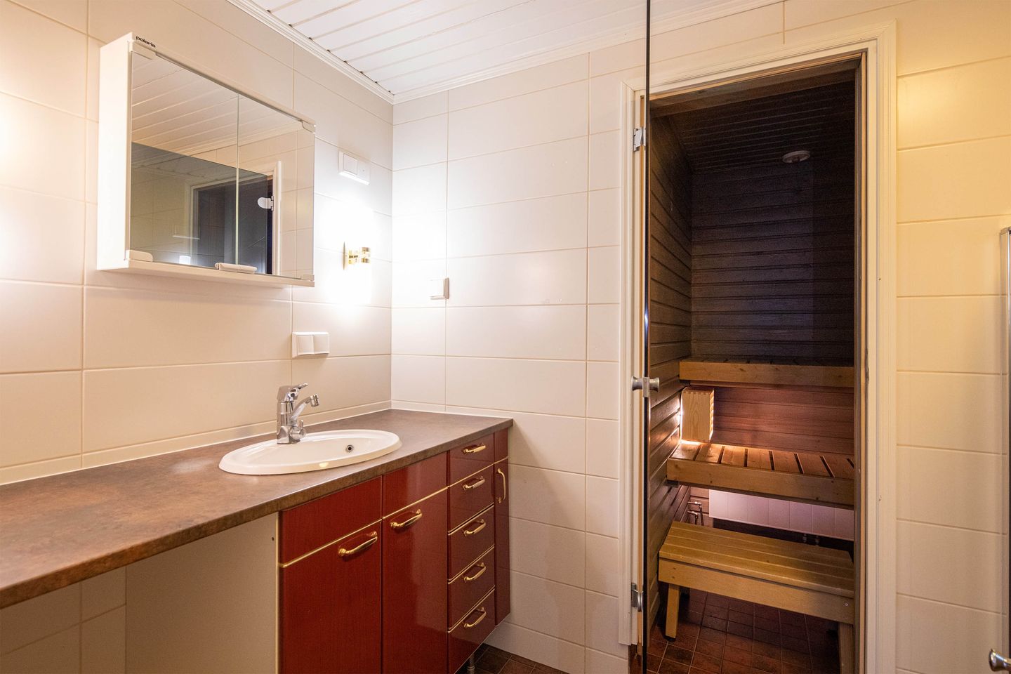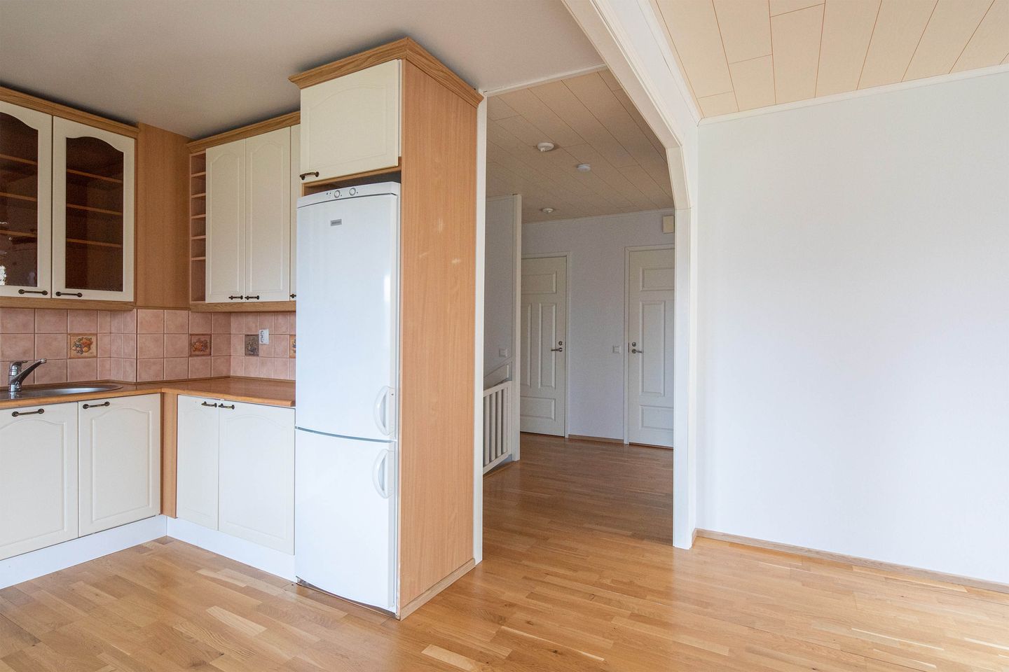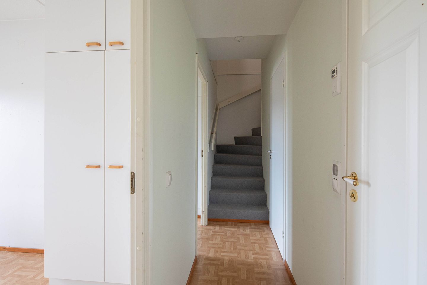 Asunnon parveke on lasitettu ja huoneistoon on asennettu ilmalämpöpumppu. Näiden muutostöiden kunnossapitovastuu on asukkaalla. Astianpesukone ei kuulu tämän asunnon varusteisiin mutta tilavaraus löytyy. Keittiön kalustekaapit on myös vaihdettu kermansävyisin kohokuvioituihin oviin ja osa ovista on lasiovia. Yläkerrassa on parkettilattia ja alakerrassa hyväkuntoinen parkettijäljitelmä muovimatto. Kylpyhuone on laatoitettu, ja suihkun ja wc-istuimen väliin on lisätty matala seinäke. Yläkerrasta pääsee lasitetulle parvekkeelle ja alakerran makuuhuoneesta terssiparvekkeelle josta on portti piha-alueelle. Alakerrassa on iso khh/varastotila, koska asunnolla ei ole muita varastotiloja.