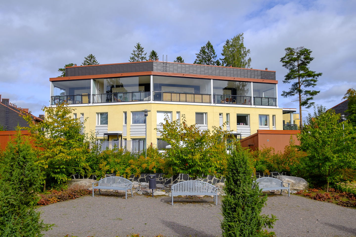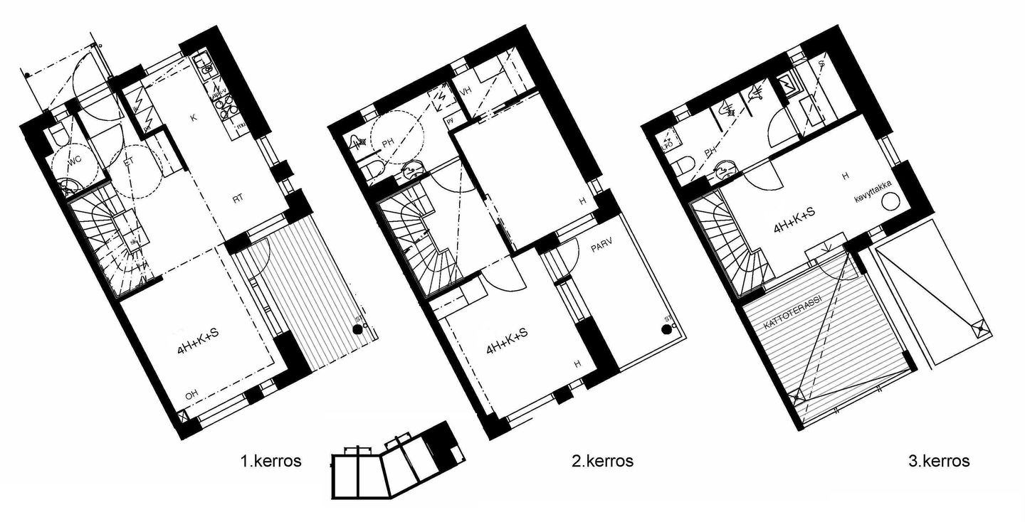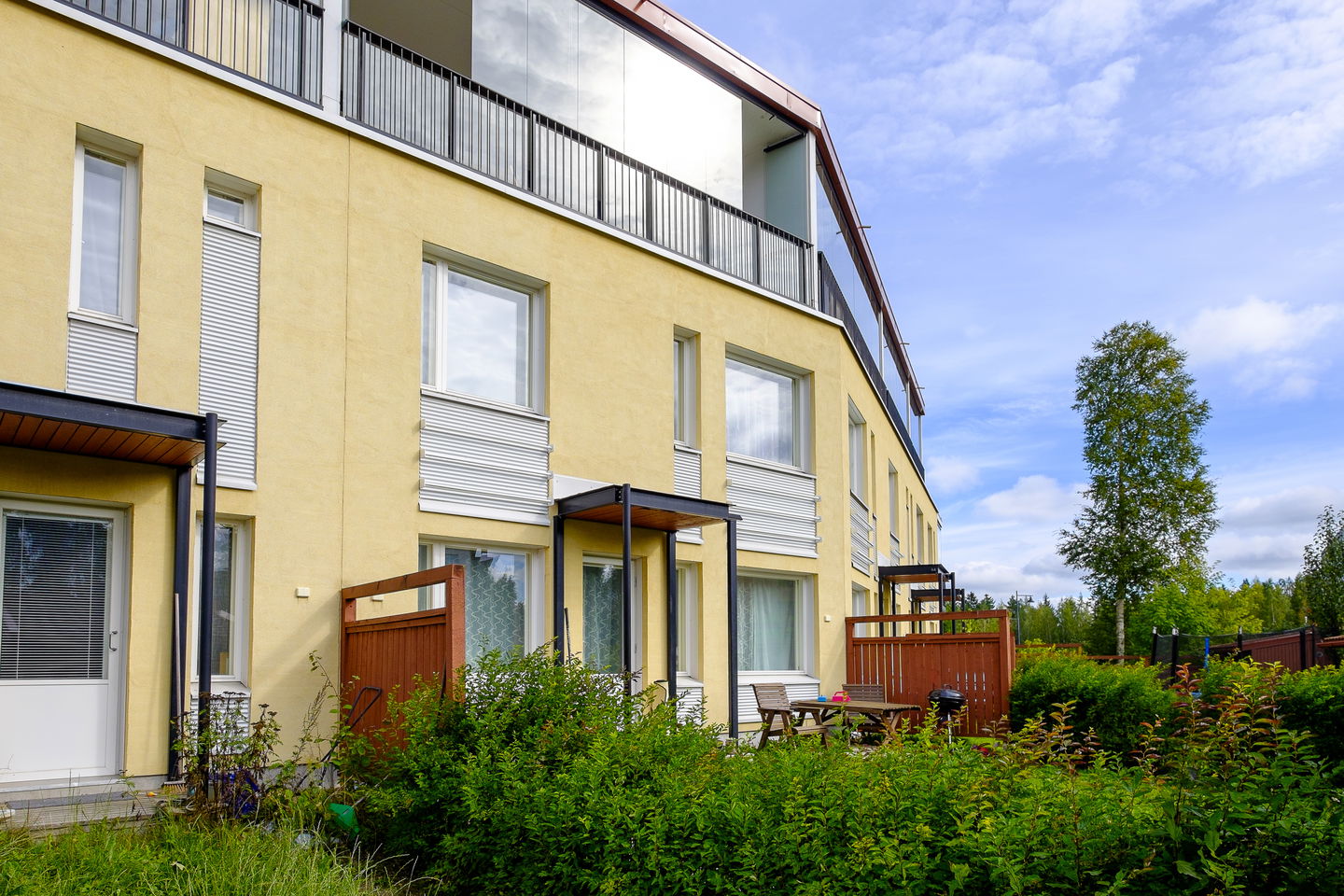 Valoisia vuokrakoteja alueen eteläosassa rauhallisella paikalla. Asunnot ovat kolmekerroksisia huoneistoja, joissa on mm. takkahuone ja suuri lasitettu kattoterassi. Asuintilojen lattiat parkettia, kylpyhuoneet laatoitettu. Keittiöissä on mm. astianpesukone ja keraaminen liesi.