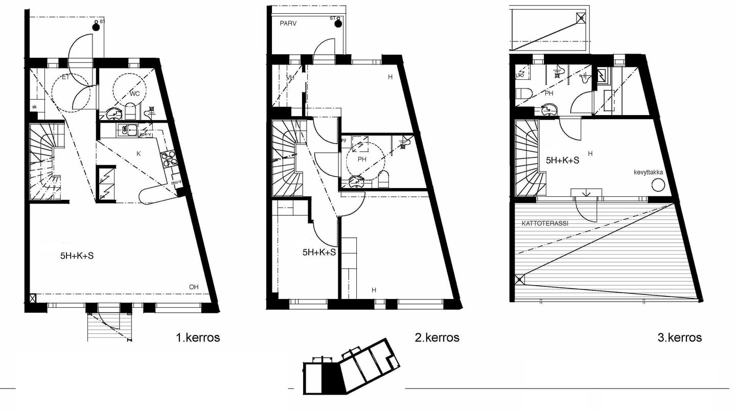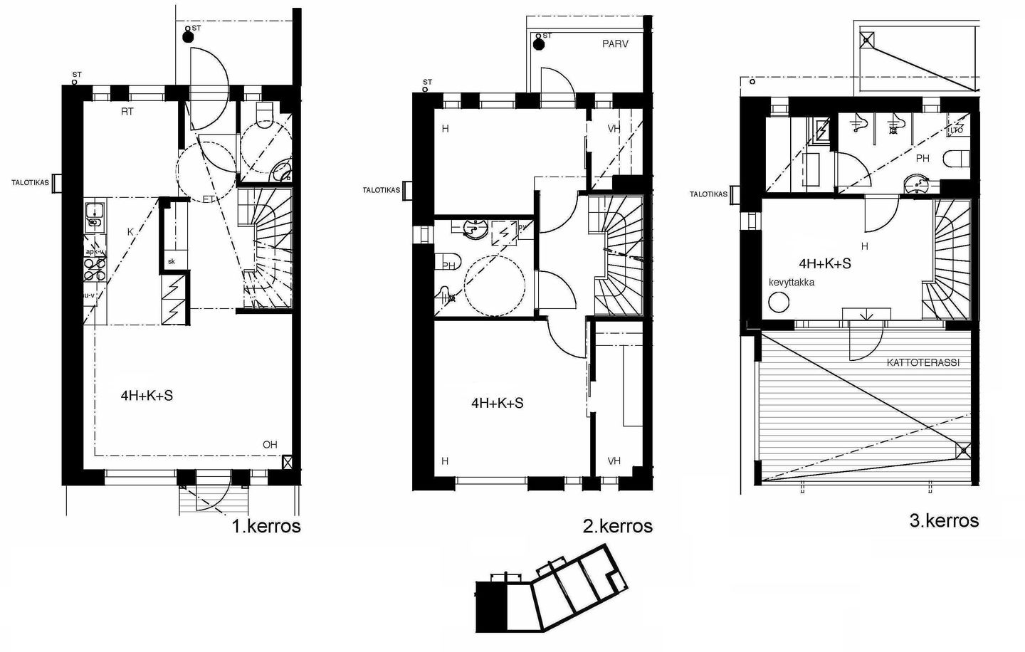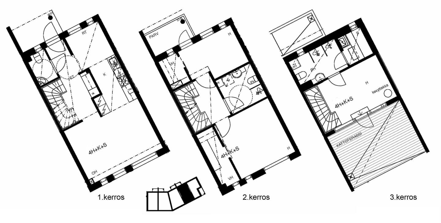 Valoisia vuokrakoteja alueen eteläosassa rauhallisella paikalla. Asunnot ovat kolmekerroksisia huoneistoja, joissa on mm. takkahuone ja suuri lasitettu kattoterassi. Asuintilojen lattiat parkettia, kylpyhuoneet laatoitettu. Keittiöissä on mm. astianpesukone ja keraaminen liesi.