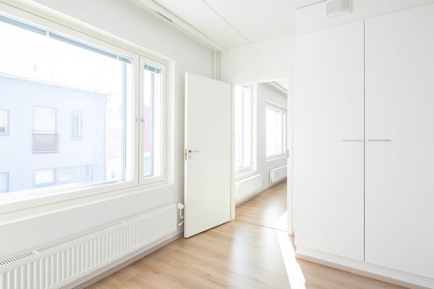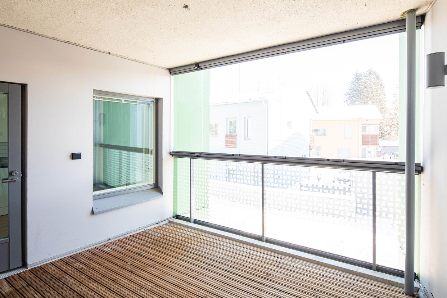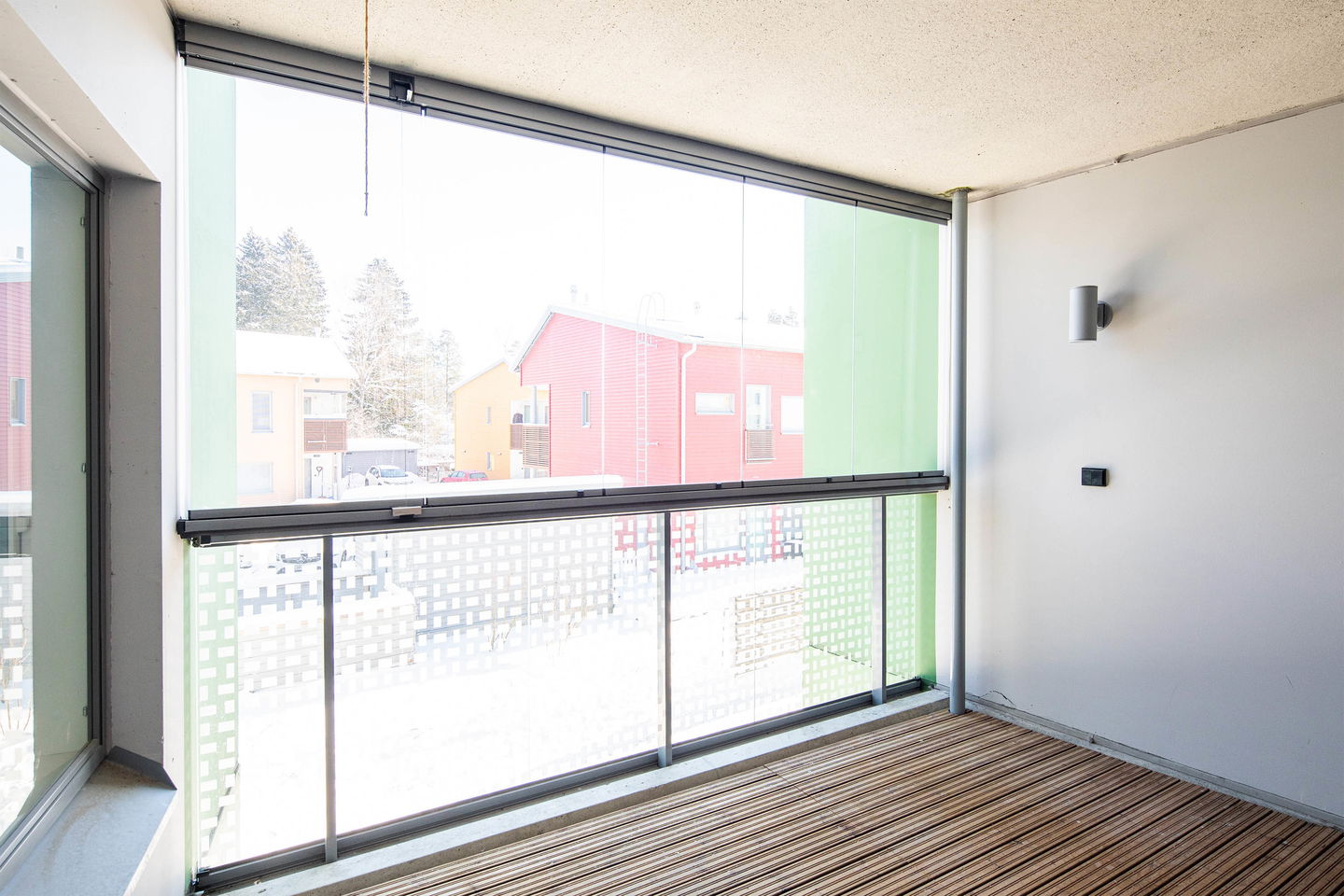 Toisen kerroksen kolmio, jossa neliöt käytetty todella tehokkaasti. Asuntoon tulet ensimmäisenä lasitetulle parvekkeelle, josta löytyy myös varastotila. Erillinen keittiö, tilava olohuone, kylpyhuone ja erillis-wc. Toisessa makuuhuoneessa on myös vaatehuone.