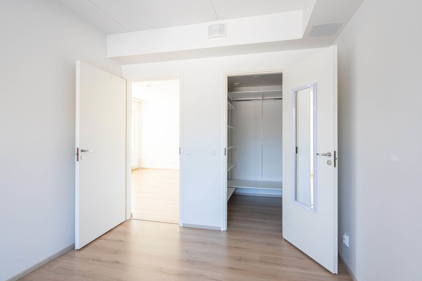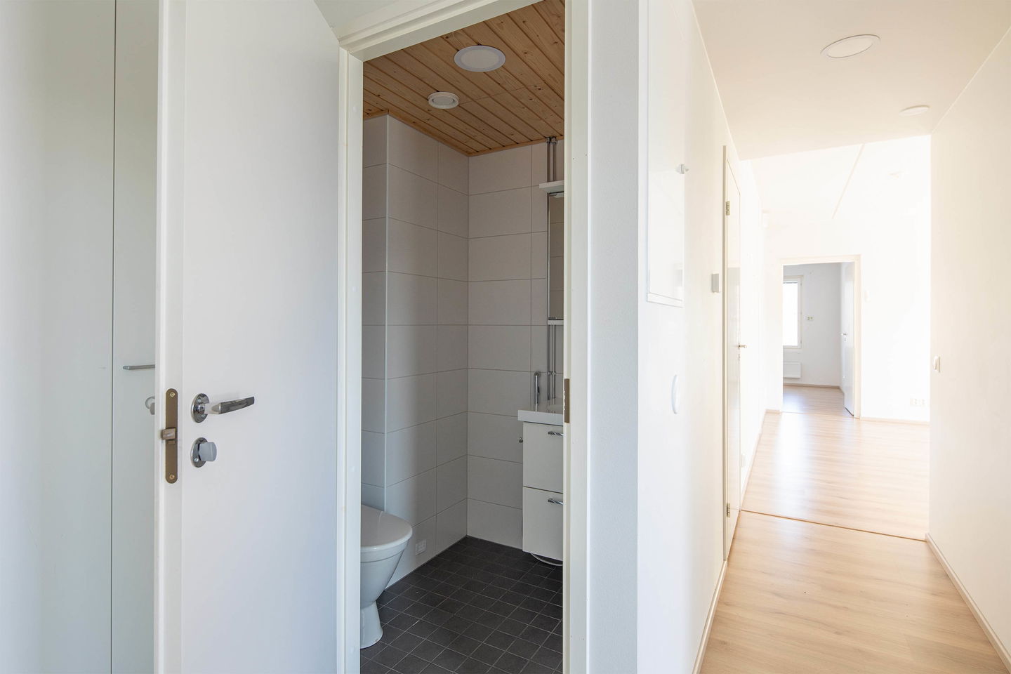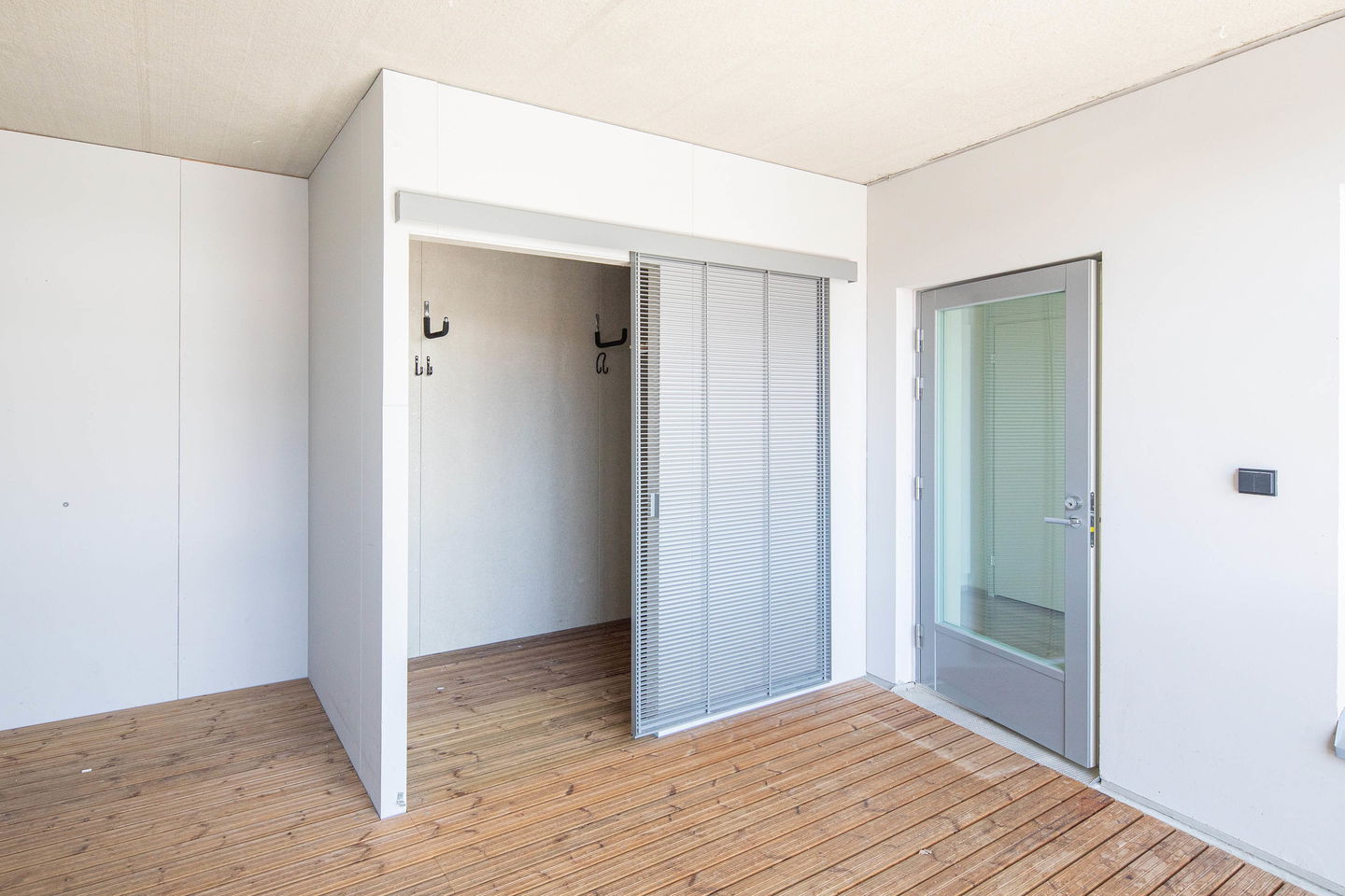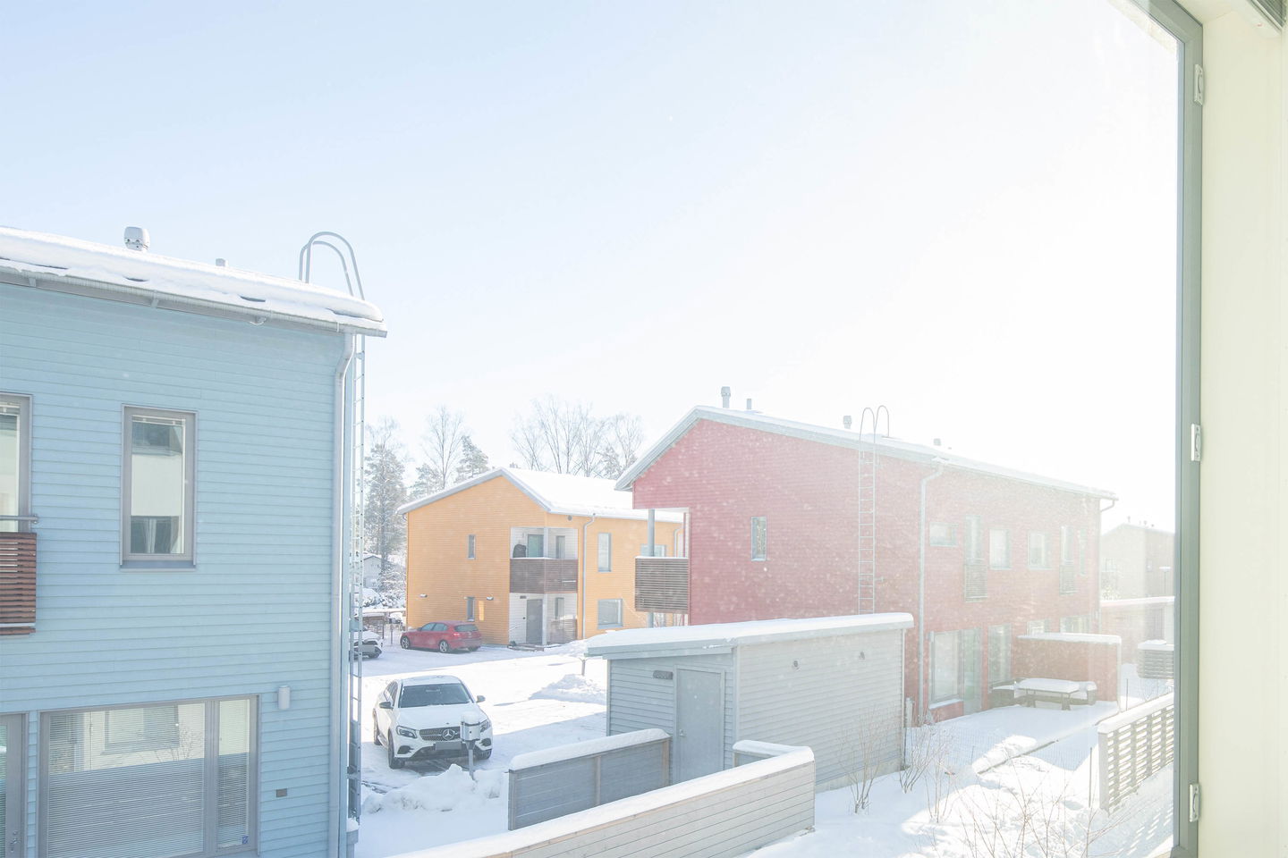 Toisen kerroksen kolmio, jossa neliöt käytetty todella tehokkaasti. Asuntoon tulet ensimmäisenä lasitetulle parvekkeelle, josta löytyy myös varastotila. Erillinen keittiö, tilava olohuone, kylpyhuone ja erillis-wc. Toisessa makuuhuoneessa on myös vaatehuone.