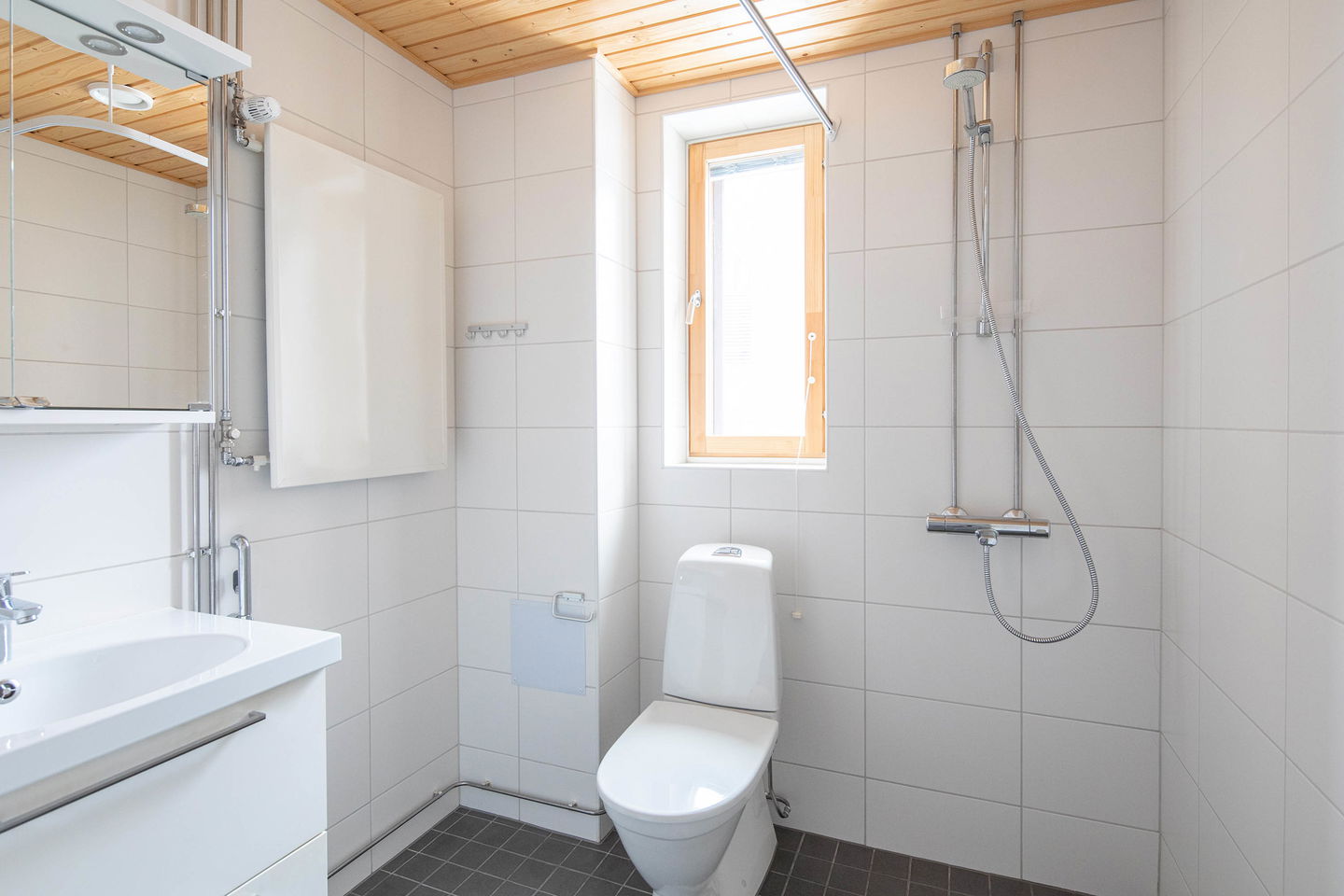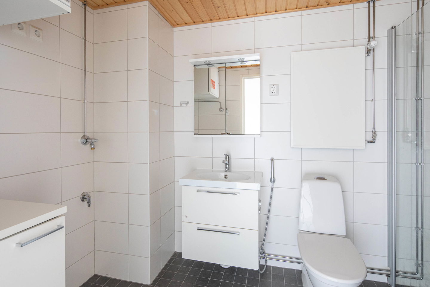 Asunto on valoisa, hyväkuntoinen, siisti ja vaaleasävyinen. Lattiat ovat vaaleanharmaata laminaattia. Kylpyhuoneissa on suuret valkoiset seinälaatat ja tummanharmaat lattialaatat. Asunnon erityinen piirre lienee pihapiirin suurin, etelään ja länteen avautuva terassi (15 x 3m).