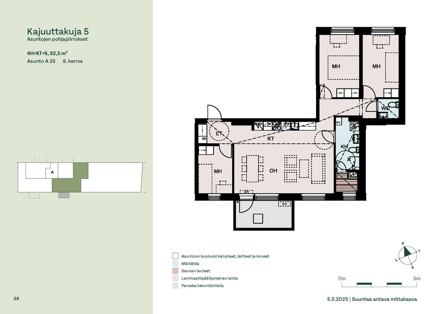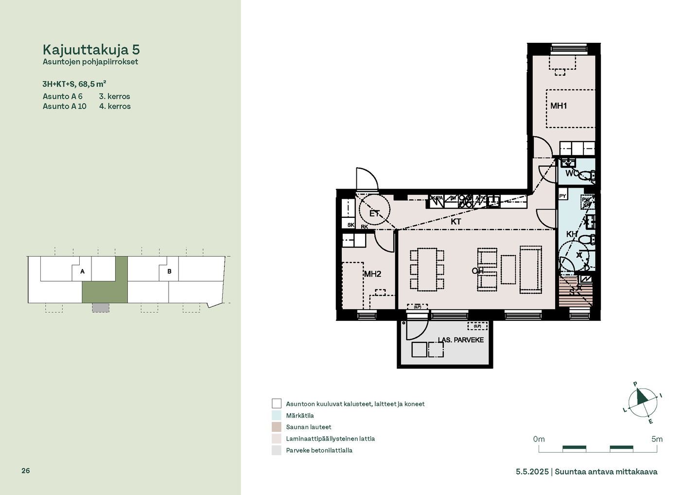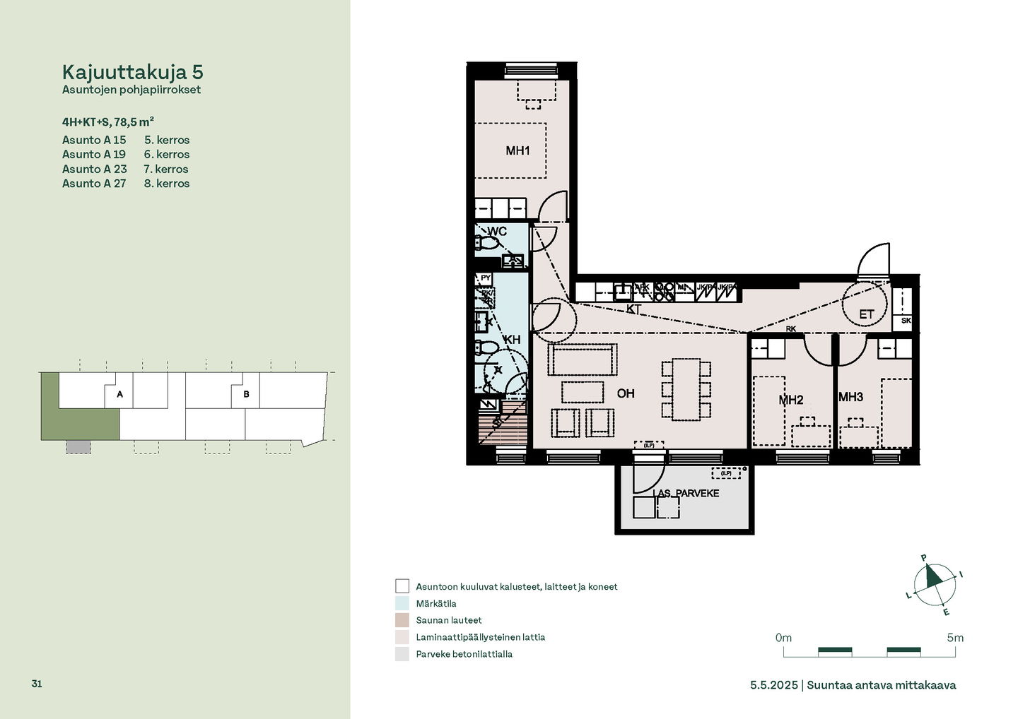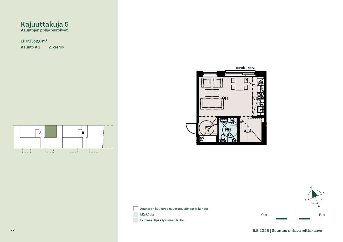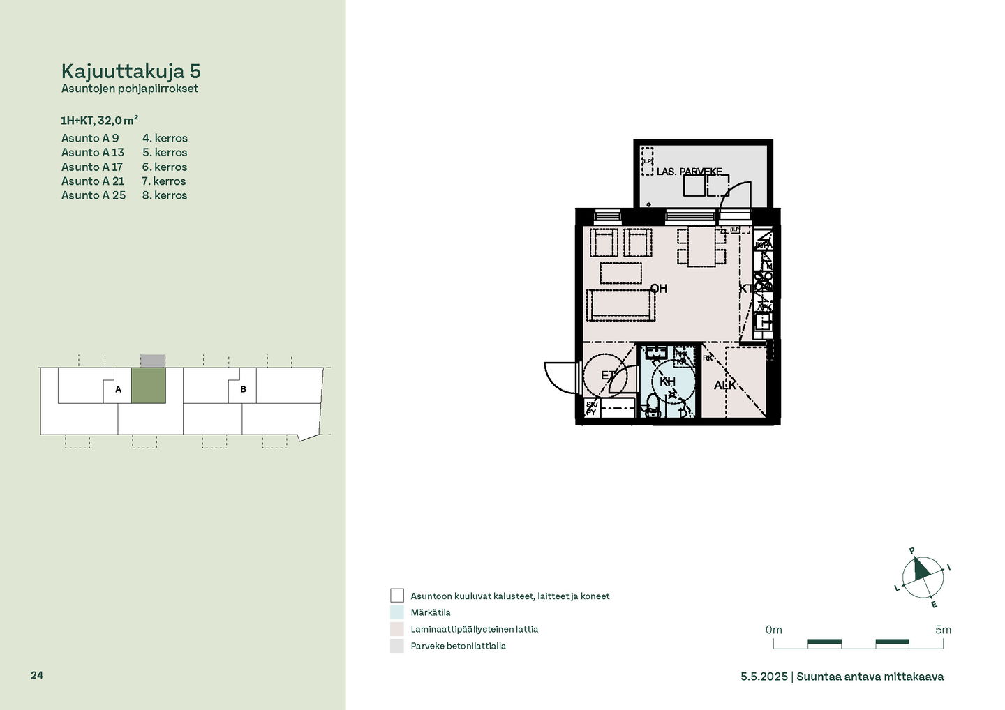 Kahdeksankerroksisen asuintaloon tulee yhteensä 50 kotia, joiden huoneistokoot vaihtelevat yksiöistä viisihuoneisiin perheasuntoihin. Pohjaratkaisuissa on valinnanvaraa ja hyvin suunnitellut tilat tuovat toimivuutta pienimpiinkin koteihin. Yksiöissä on kätevä alkovi, ja useissa kaksioissakin vaatehuone, joka voi palvella myös työtilana. Muutamissa kodeissa parvekkeelta on suorakäynti omalle, viherpeukaloa inspiroivalle terassipihalle. Asuntojen materiaalivalintoihin pääsee vaikuttamaan vielä tammikuun aikana.
