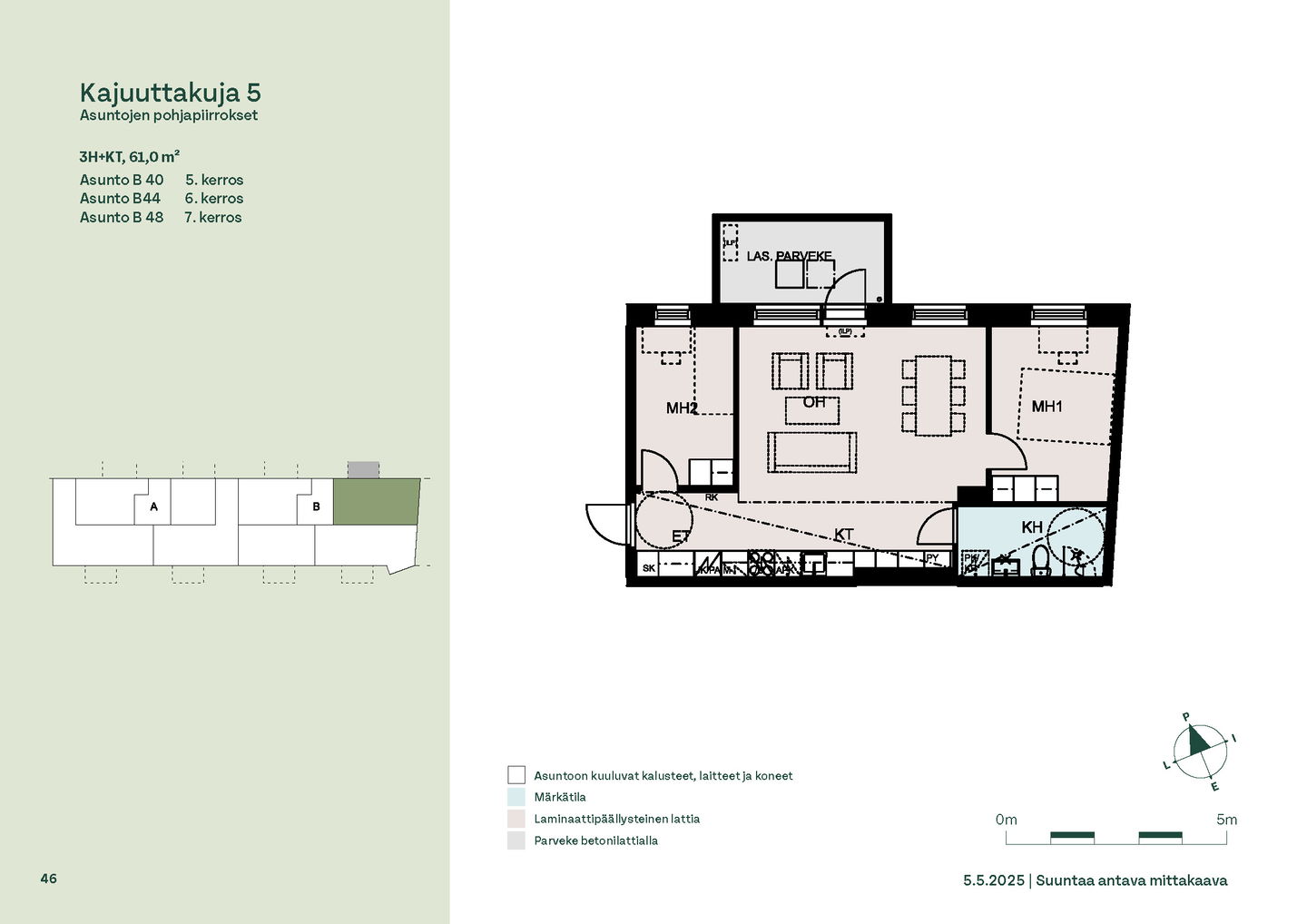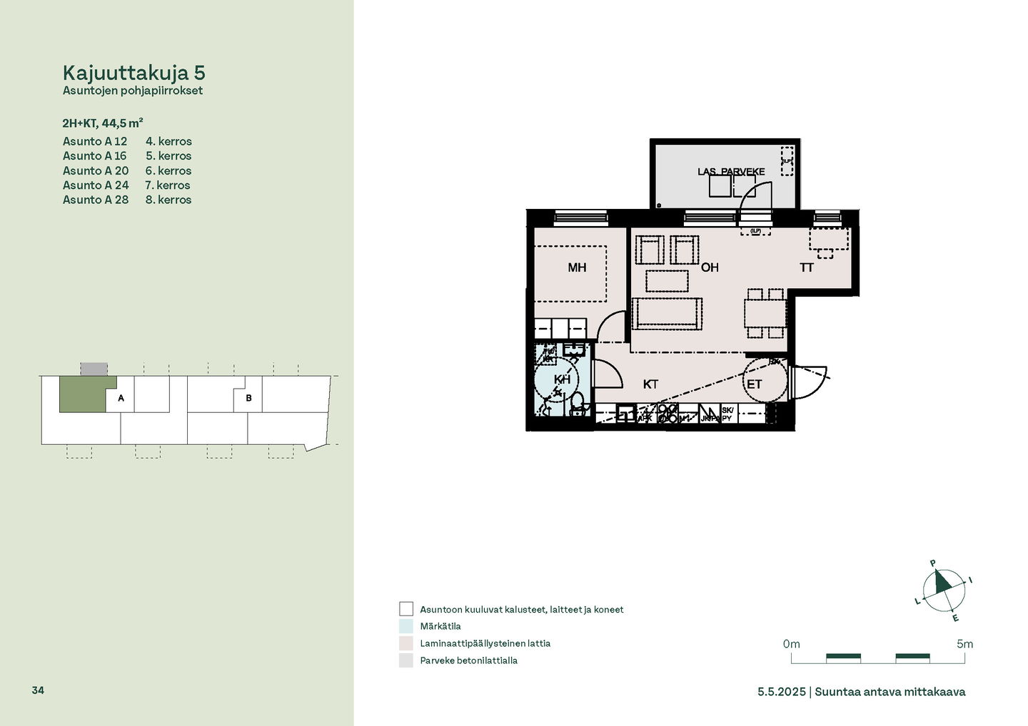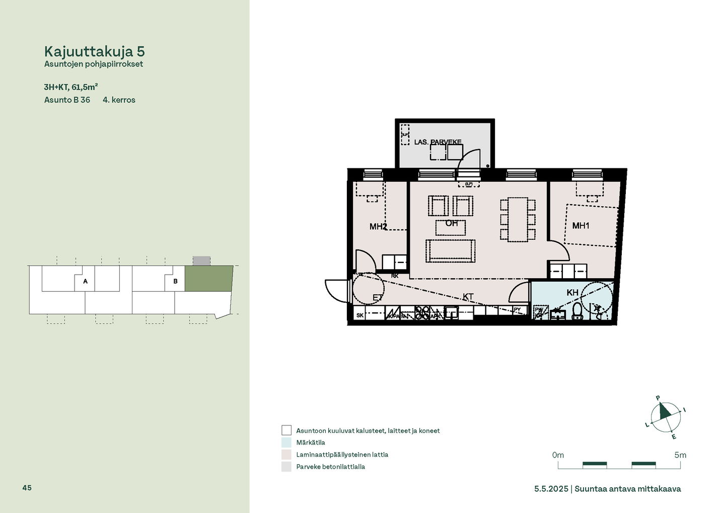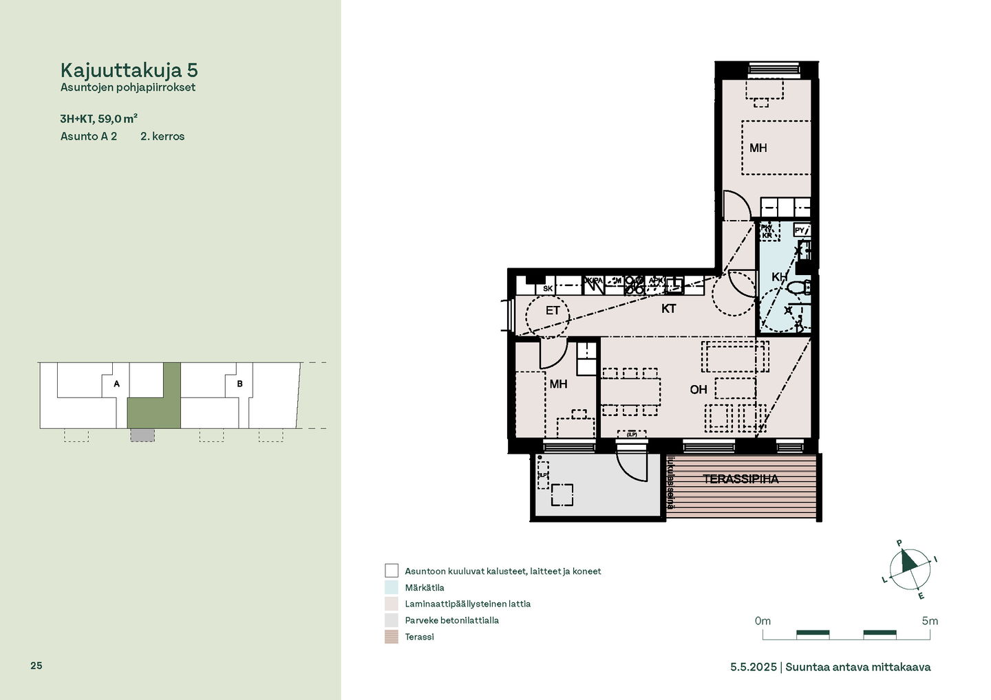 Kahdeksankerroksisen asuintaloon tulee yhteensä 50 kotia, joiden huoneistokoot vaihtelevat yksiöistä viisihuoneisiin perheasuntoihin. Pohjaratkaisuissa on valinnanvaraa ja hyvin suunnitellut tilat tuovat toimivuutta pienimpiinkin koteihin. Yksiöissä on kätevä alkovi, ja useissa kaksioissakin vaatehuone, joka voi palvella myös työtilana. Muutamissa kodeissa parvekkeelta on suorakäynti omalle, viherpeukaloa inspiroivalle terassipihalle. Asuntojen materiaalivalintoihin pääsee vaikuttamaan vielä tammikuun aikana.