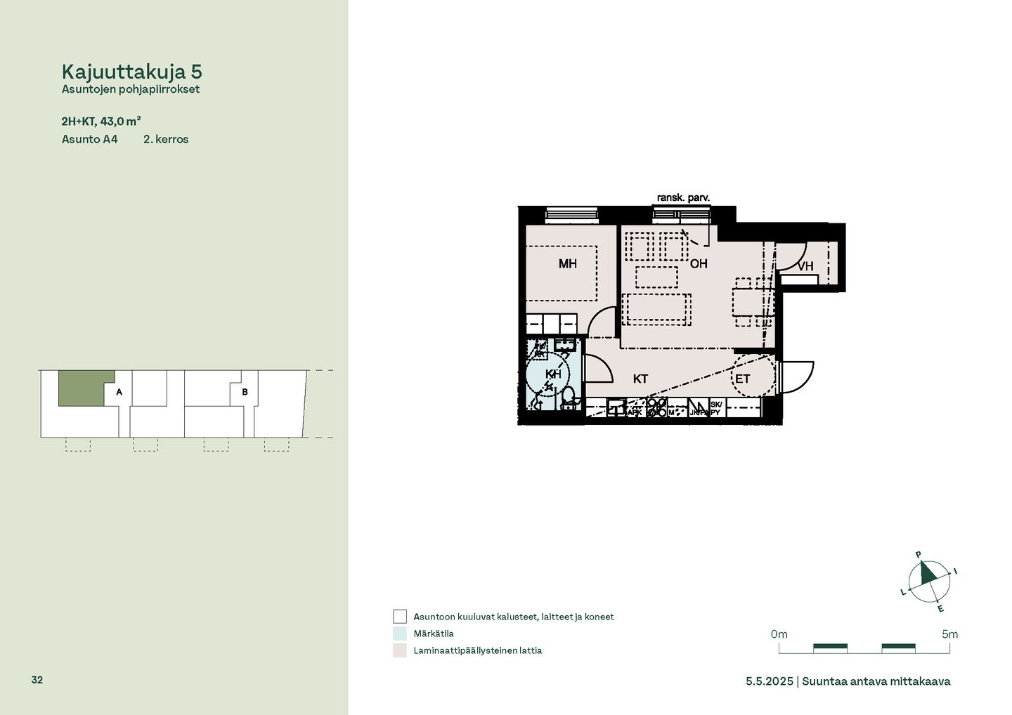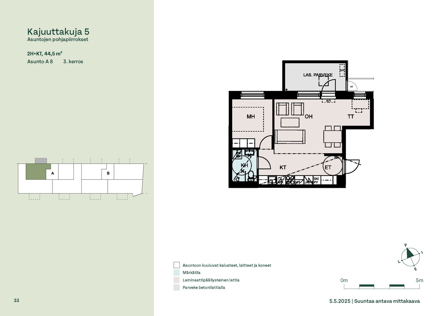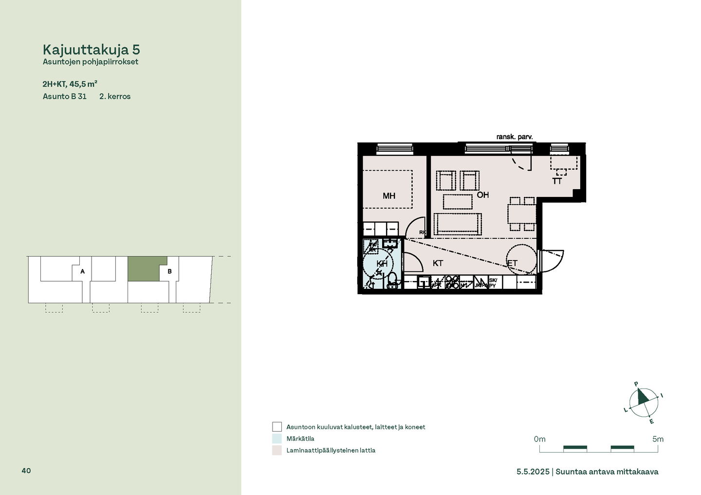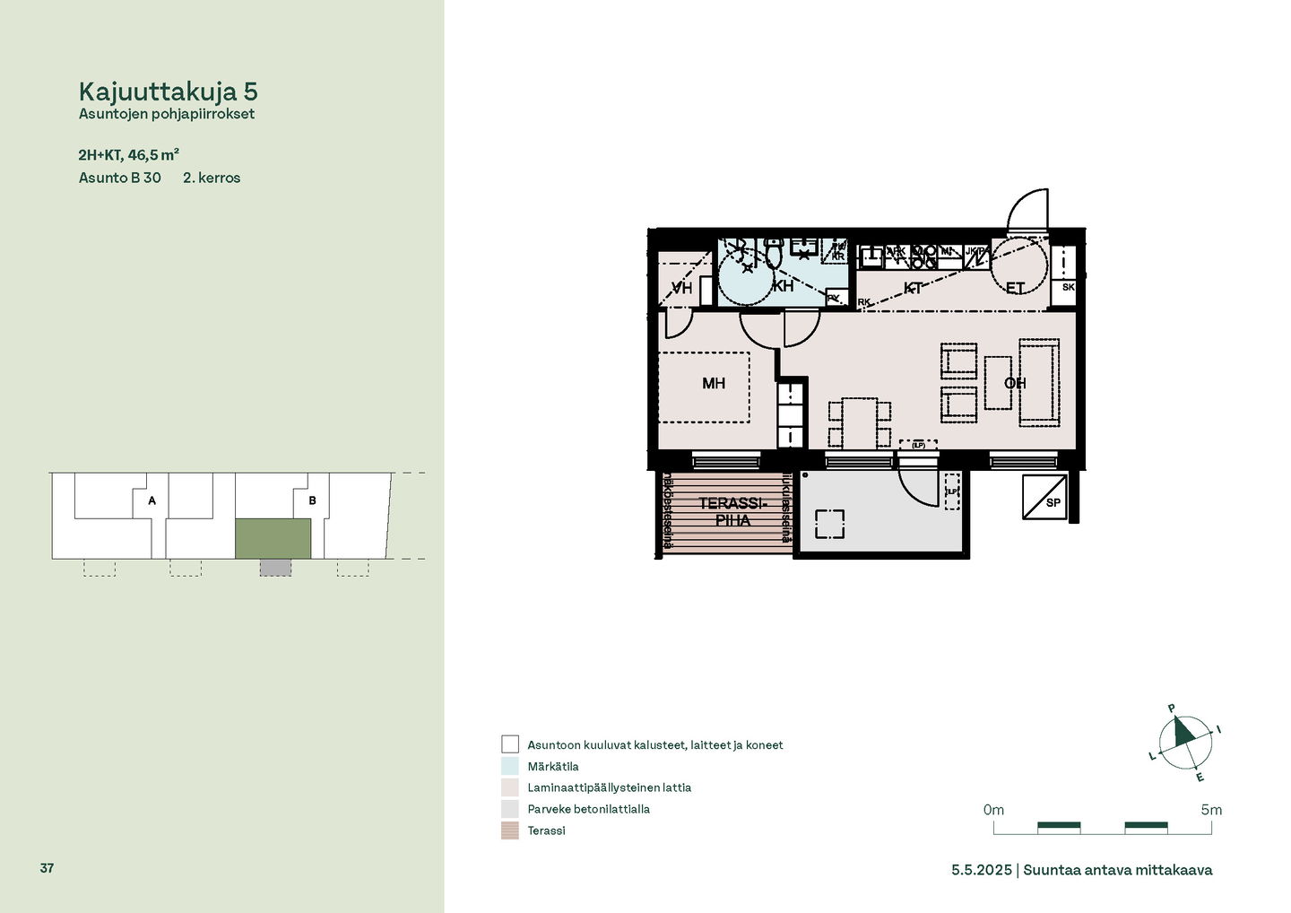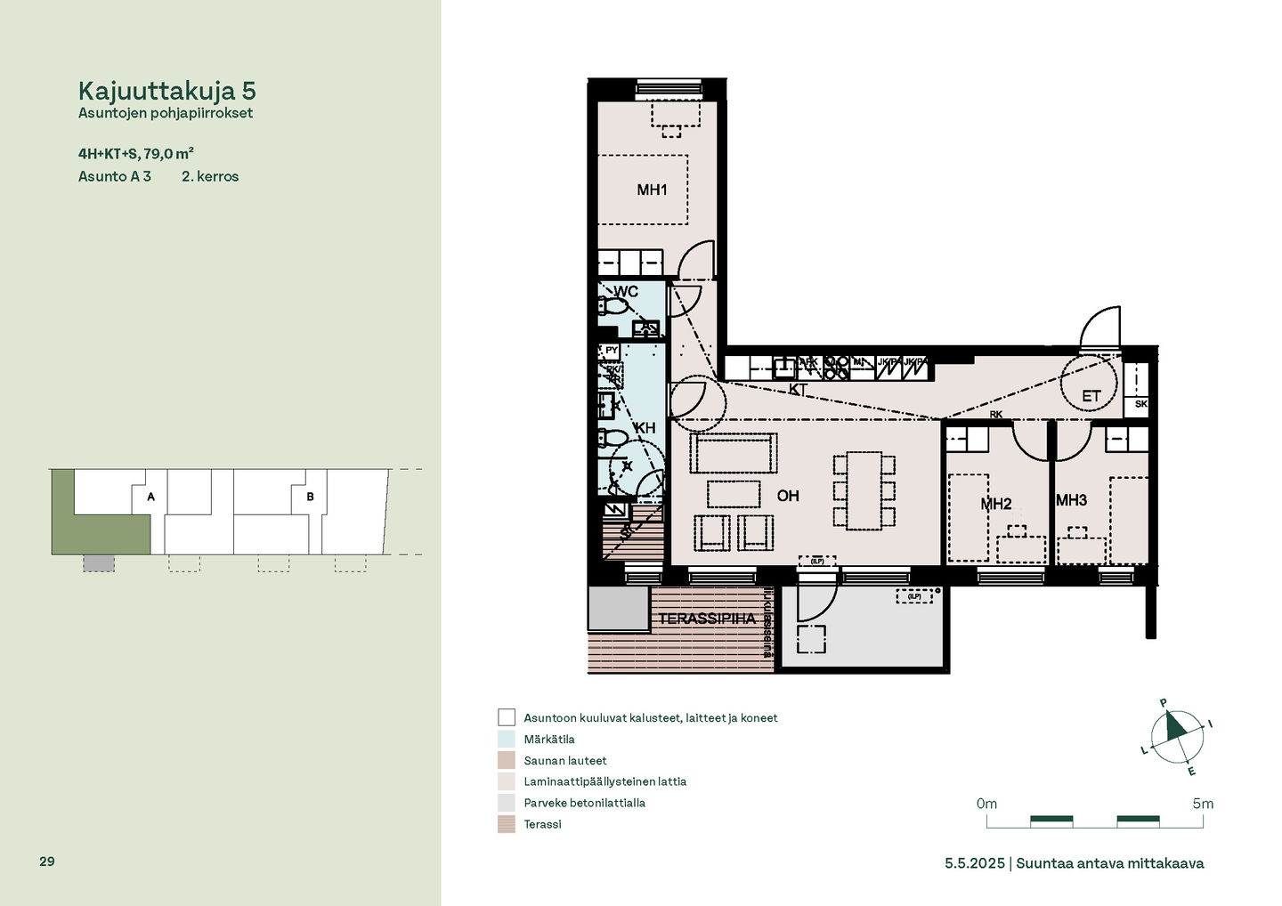 Kahdeksankerroksisen asuintaloon tulee yhteensä 50 kotia, joiden huoneistokoot vaihtelevat yksiöistä viisihuoneisiin perheasuntoihin. Pohjaratkaisuissa on valinnanvaraa ja hyvin suunnitellut tilat tuovat toimivuutta pienimpiinkin koteihin. Yksiöissä on kätevä alkovi, ja useissa kaksioissakin vaatehuone, joka voi palvella myös työtilana. Muutamissa kodeissa parvekkeelta on suorakäynti omalle, viherpeukaloa inspiroivalle terassipihalle. Asuntojen materiaalivalintoihin pääsee vaikuttamaan vielä tammikuun aikana.