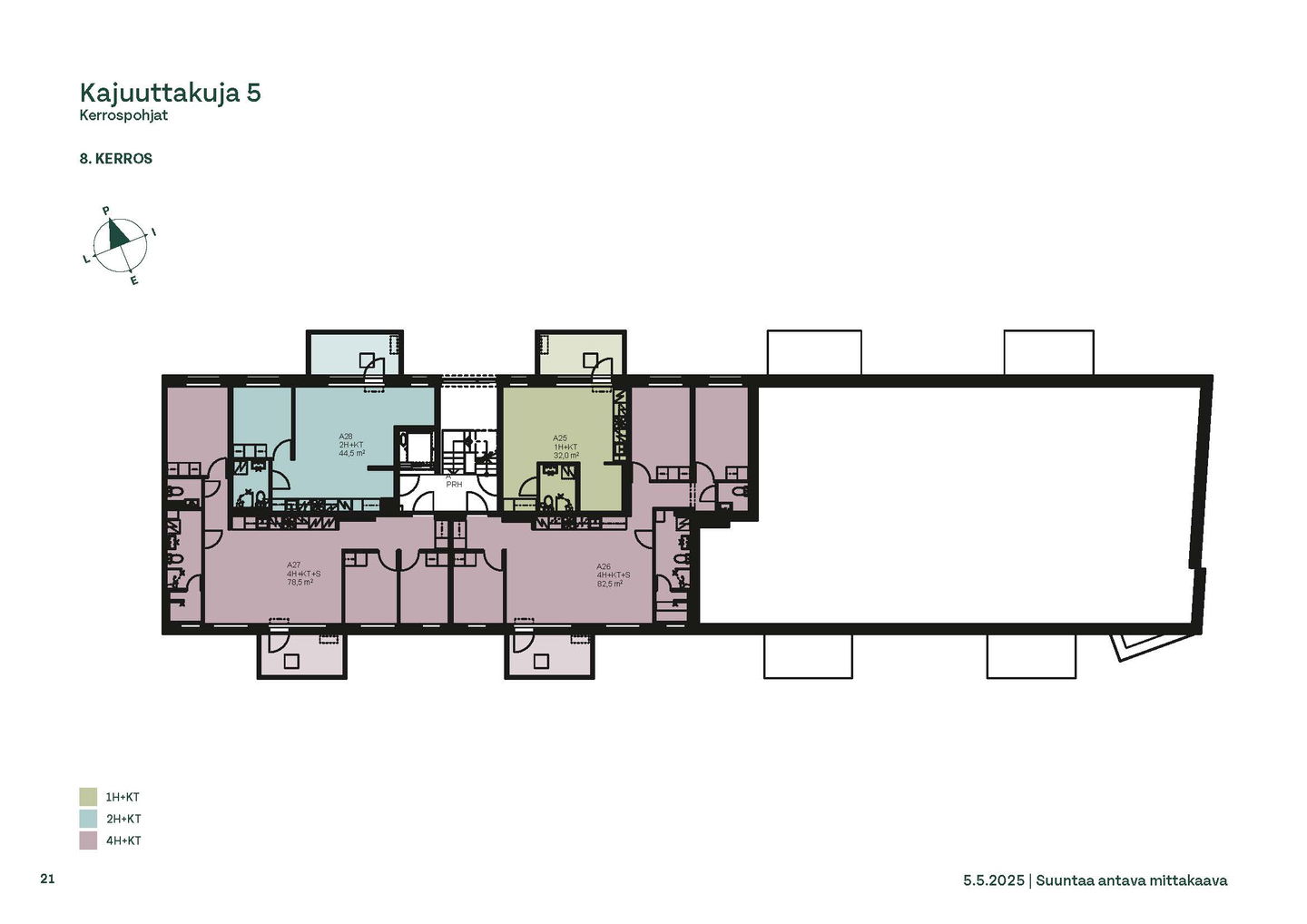 Kahdeksankerroksisen asuintaloon tulee yhteensä 50 kotia, joiden huoneistokoot vaihtelevat yksiöistä viisihuoneisiin perheasuntoihin. Pohjaratkaisuissa on valinnanvaraa ja hyvin suunnitellut tilat tuovat toimivuutta pienimpiinkin koteihin. Yksiöissä on kätevä alkovi, ja useissa kaksioissakin vaatehuone, joka voi palvella myös työtilana. Muutamissa kodeissa parvekkeelta on suorakäynti omalle, viherpeukaloa inspiroivalle terassipihalle. Asuntojen materiaalivalintoihin pääsee vaikuttamaan vielä tammikuun aikana.
