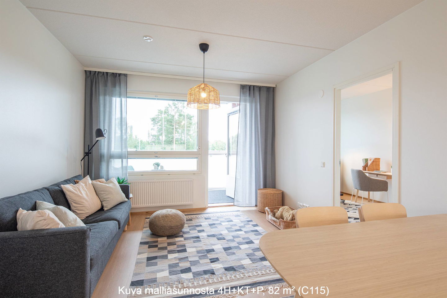 Luonnonvaloa tulvii kahdesta ilmansuunnasta: etelästä ja pohjoisesta. Asuntoon on valittu vaaleat ja maanläheiset värisävyt.