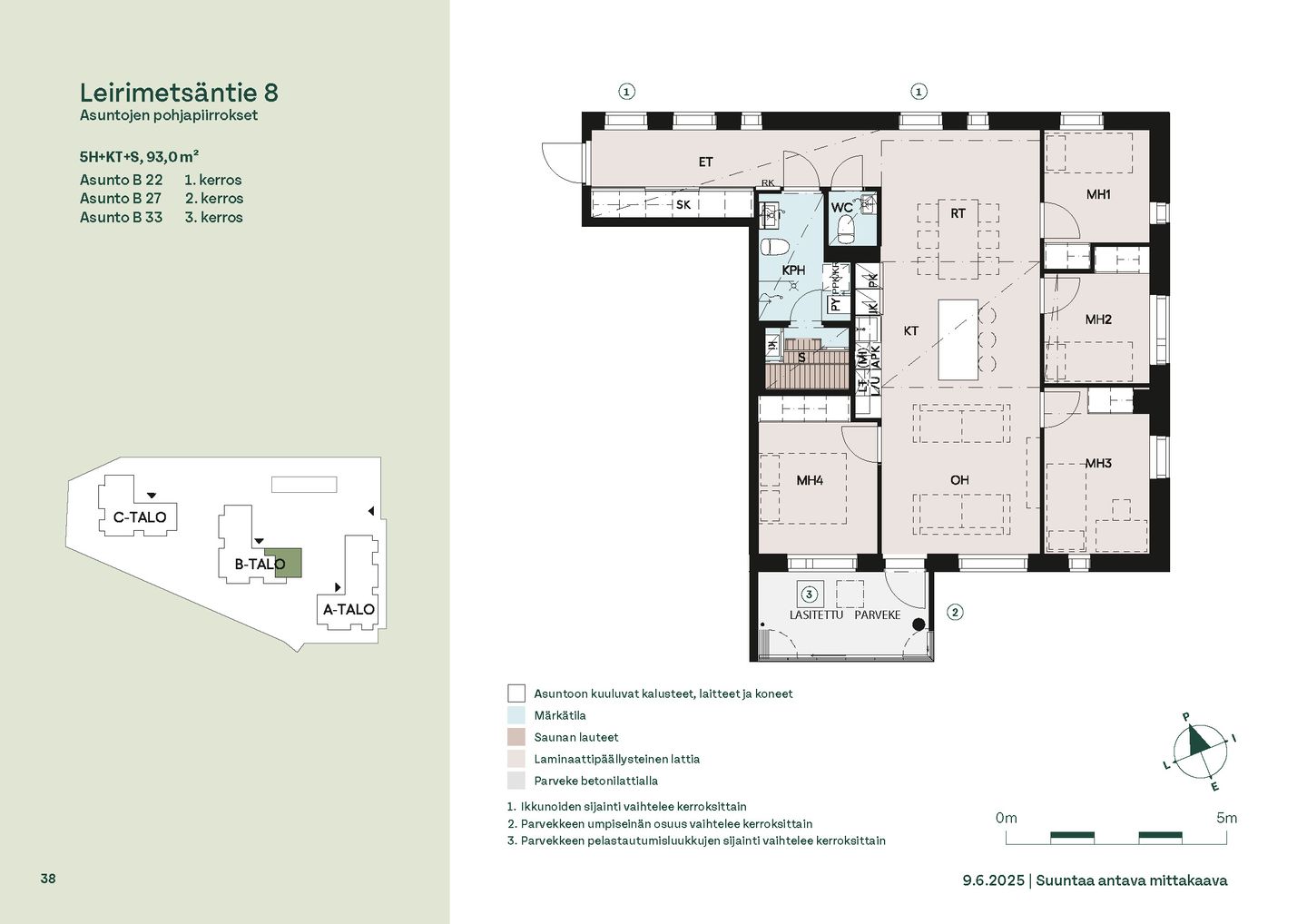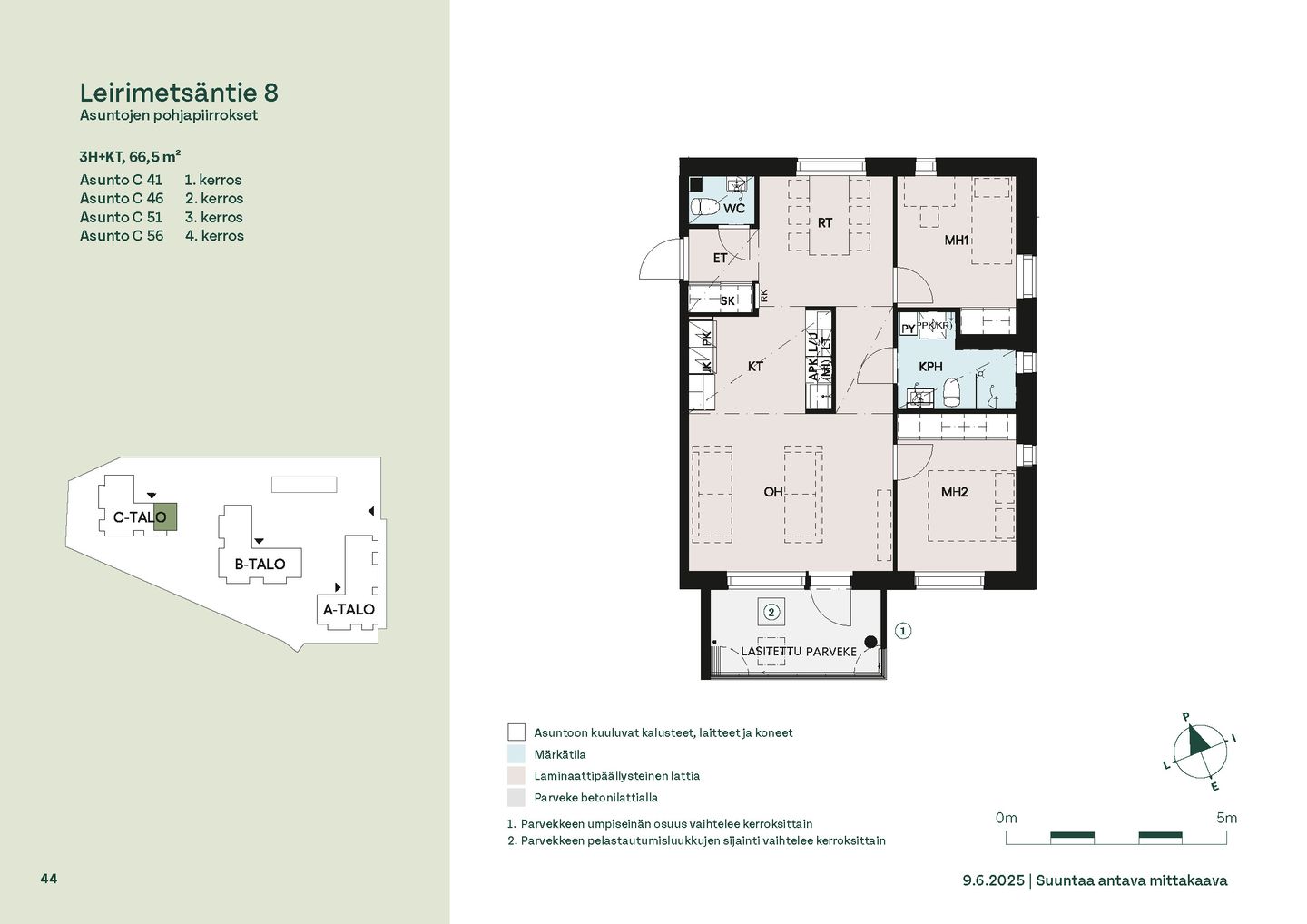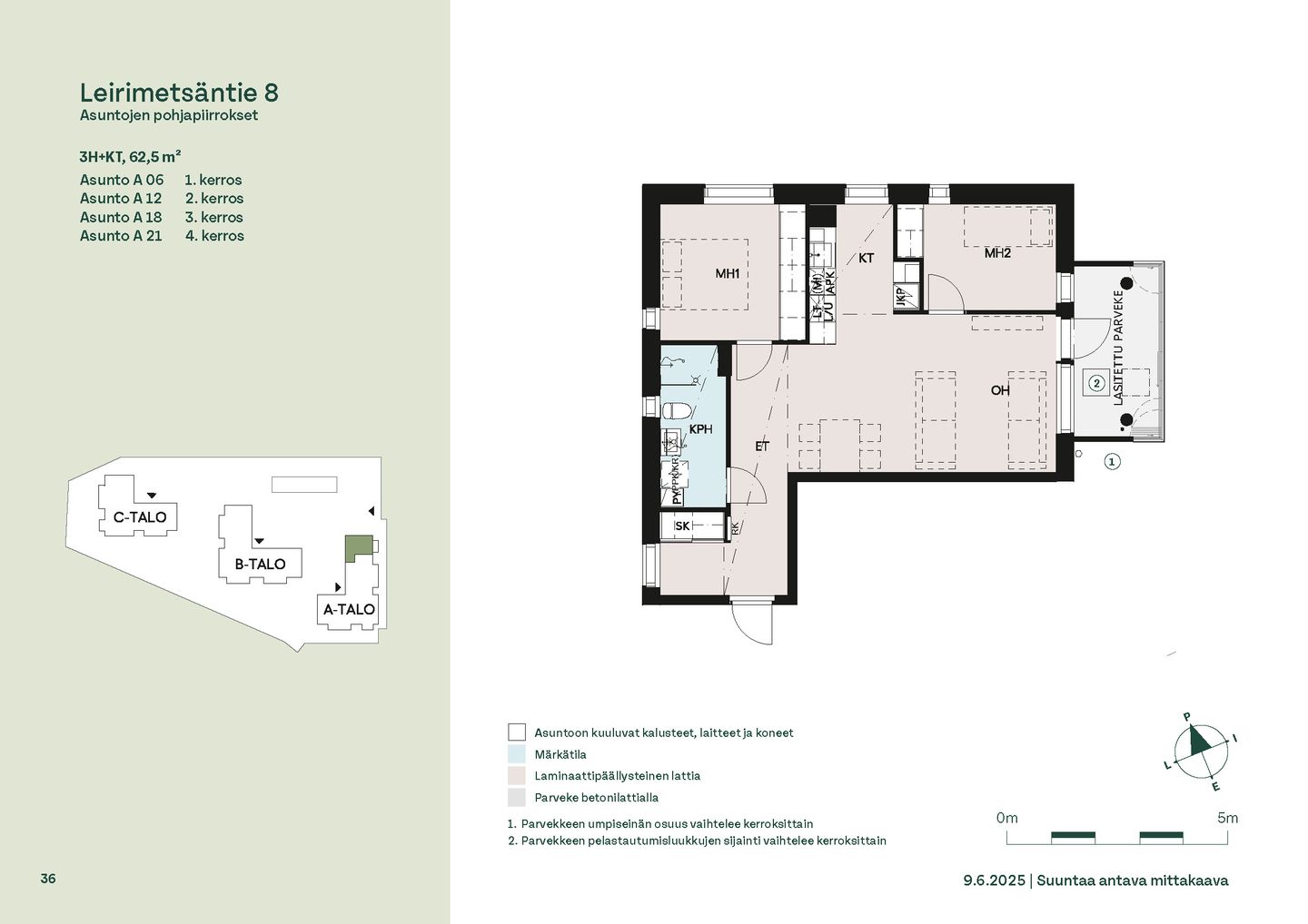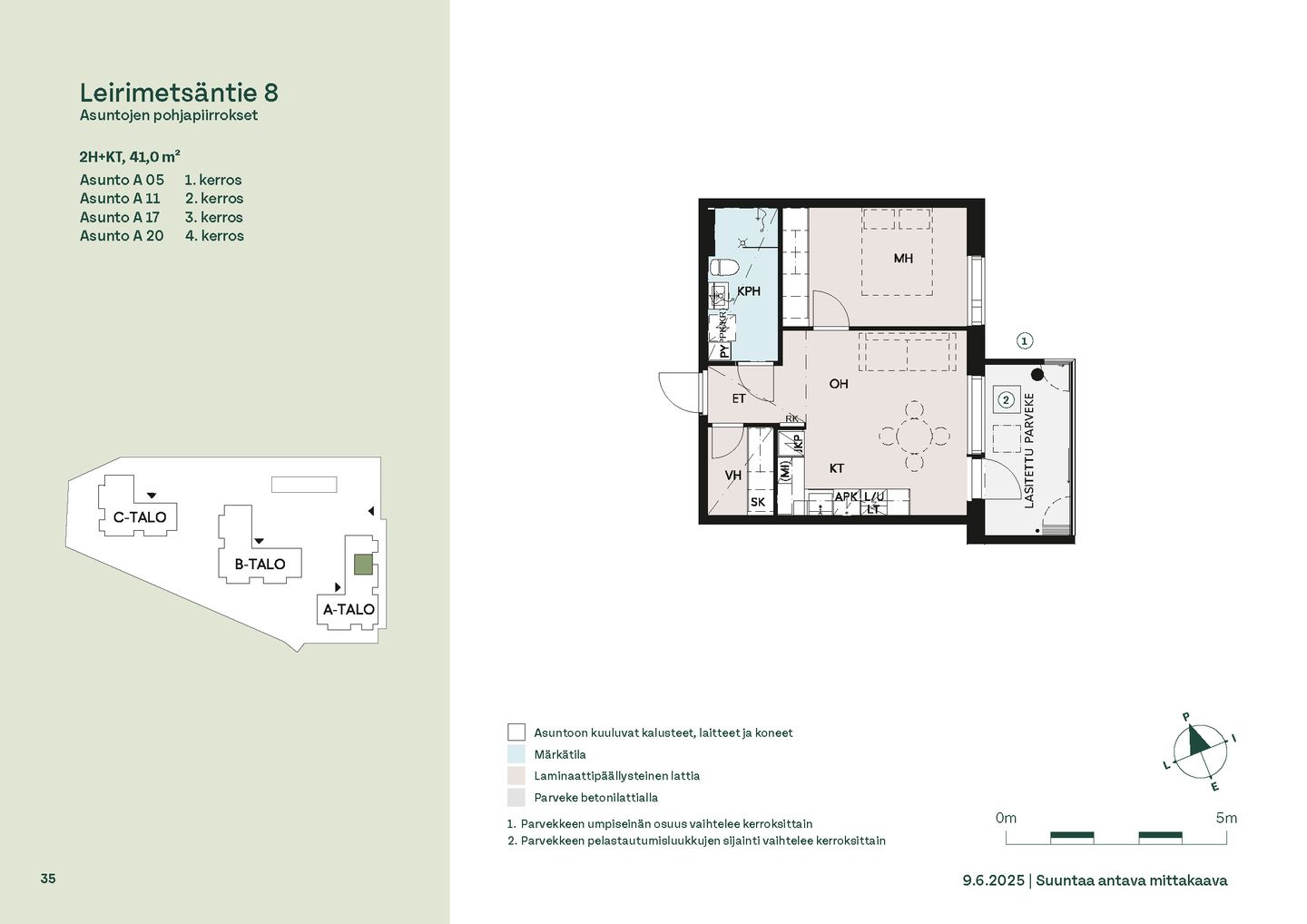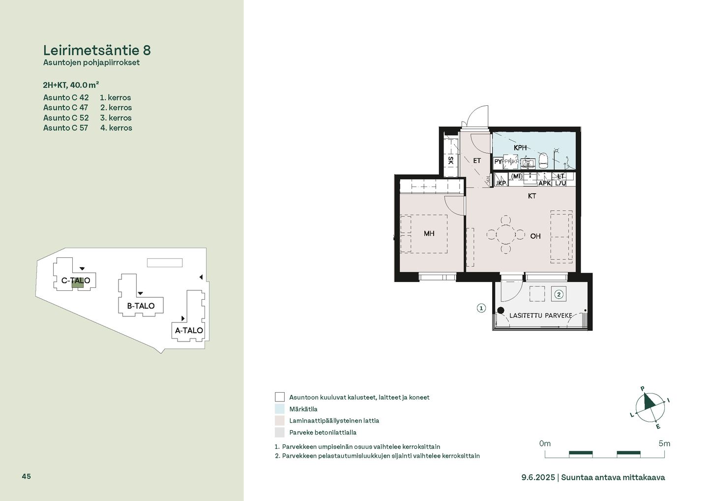 Leirimetsäntielle valmistuu 57 viihtyisää ja toimivaa kotia, joissa on panostettu valoon, näkymiin ja käytännöllisiin pohjaratkaisuihin. Useimmissa asunnoissa ikkunat avautuvat useaan ilmansuuntaan tarjoten sekä vehreitä metsänäkymiä että kaupunkimaisemia. Kaikissa kodeissa on lasitettu parveke – oma tila rentoutumiselle vuoden ympäri.