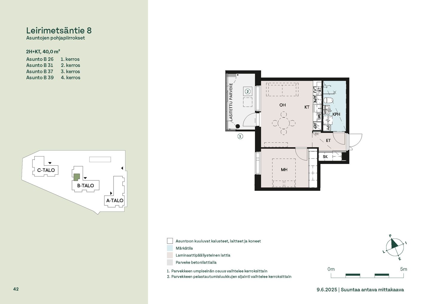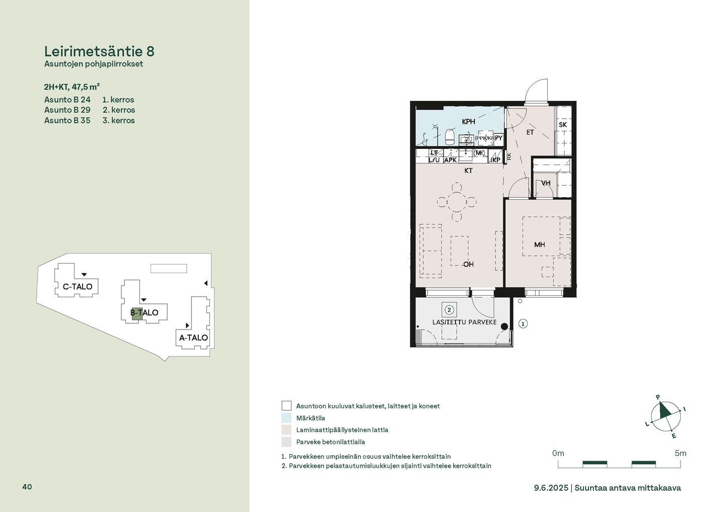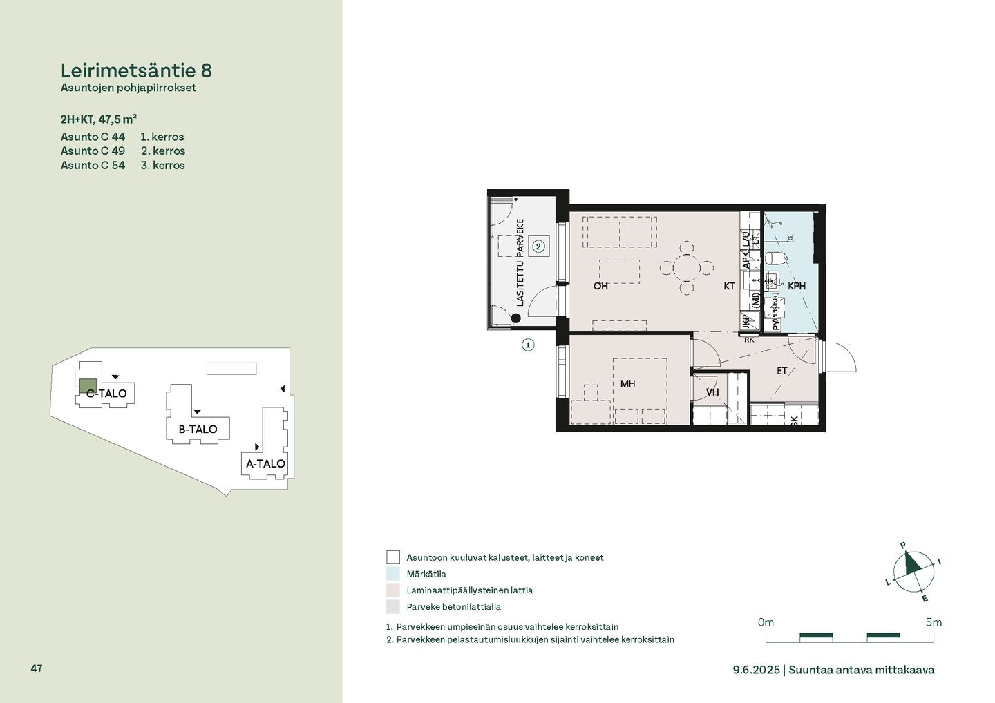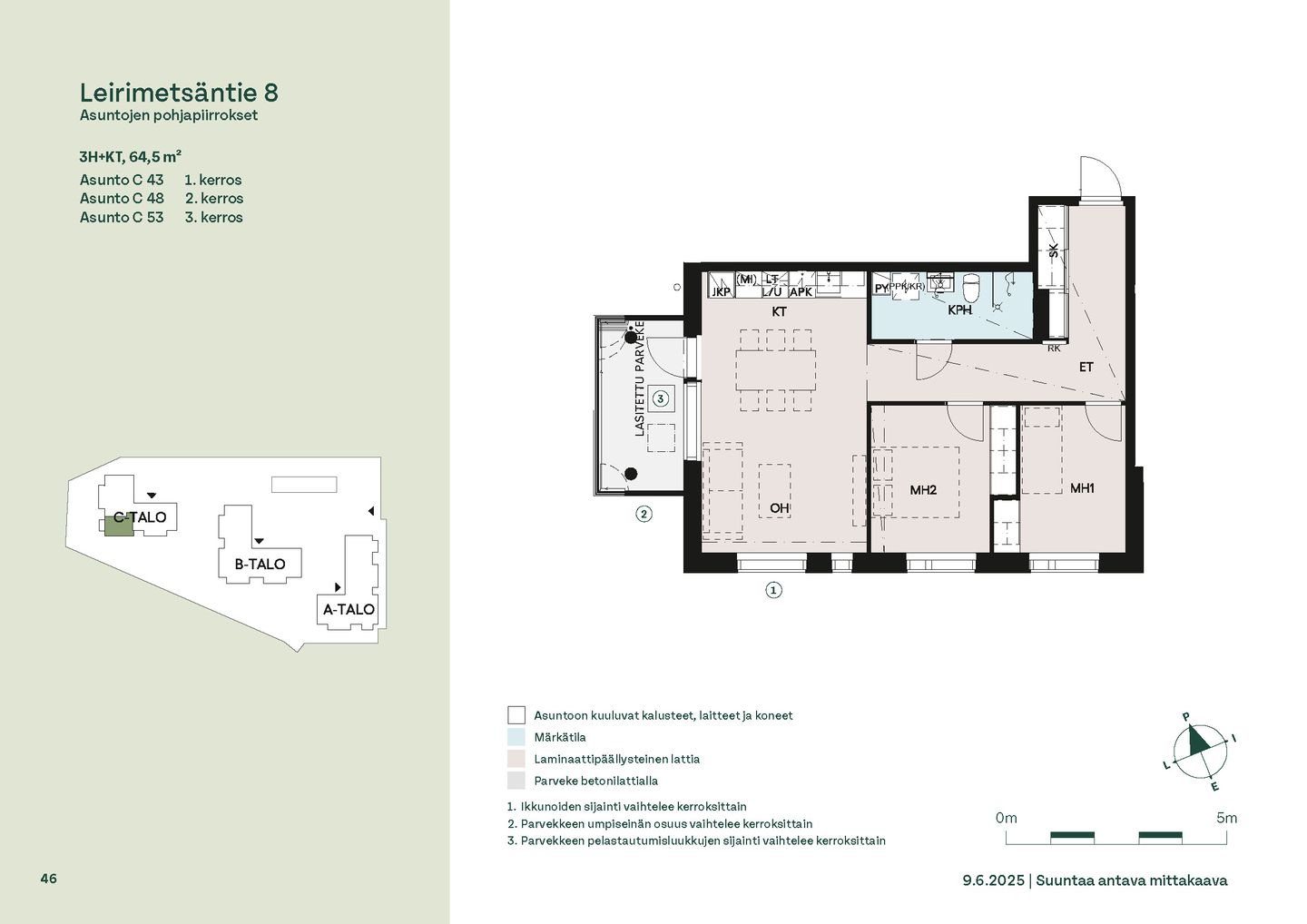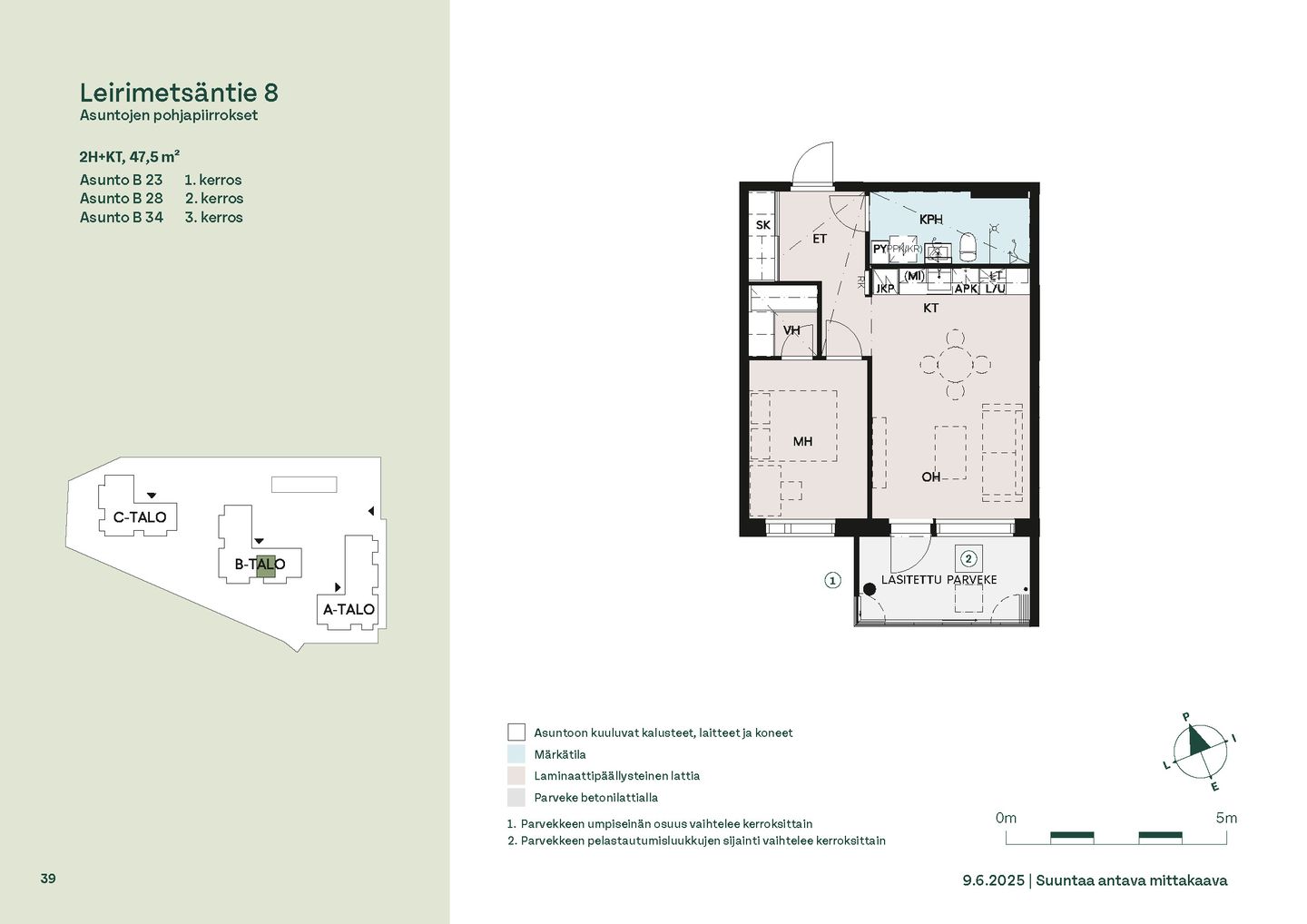 Leirimetsäntielle valmistuu 57 viihtyisää ja toimivaa kotia, joissa on panostettu valoon, näkymiin ja käytännöllisiin pohjaratkaisuihin. Useimmissa asunnoissa ikkunat avautuvat useaan ilmansuuntaan tarjoten sekä vehreitä metsänäkymiä että kaupunkimaisemia. Kaikissa kodeissa on lasitettu parveke – oma tila rentoutumiselle vuoden ympäri.