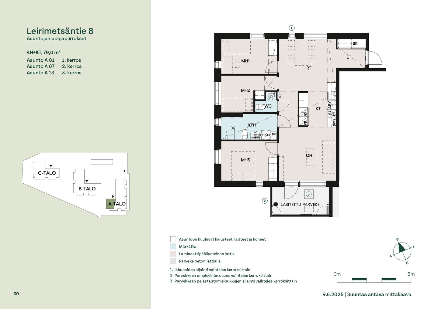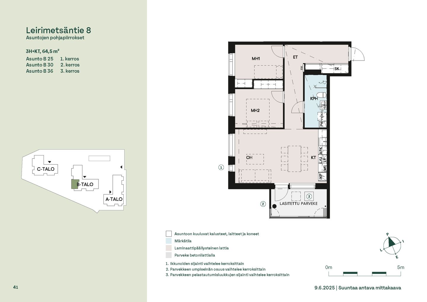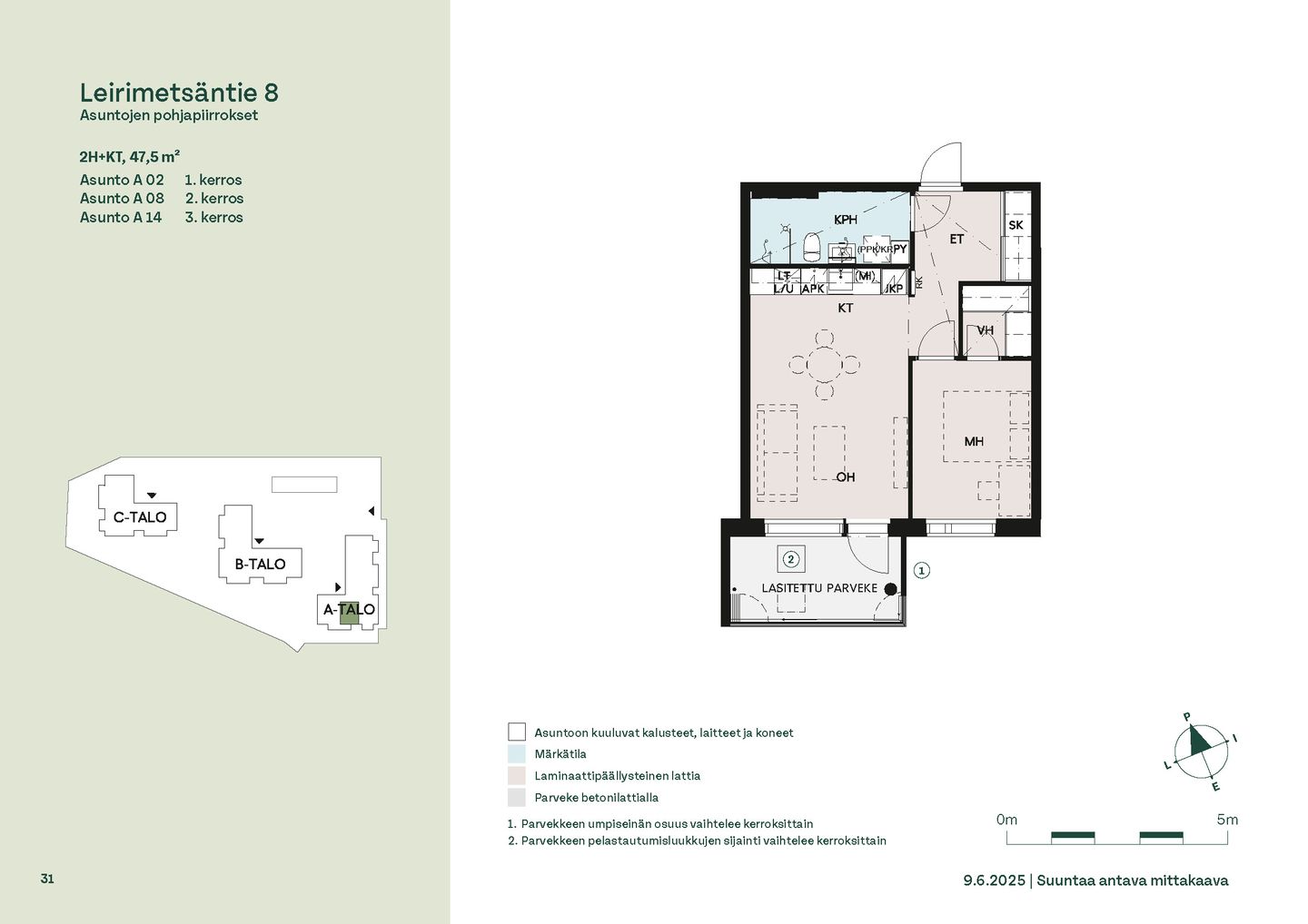 Asuntosäätiön uudet asumisoikeuskodit rakentuvat Säterinkallion metsäpuiston kupeeseen – rauhalliseen ympäristöön, jossa kaikki on lähellä. Erinomaisten kulkuyhteyksien ansiosta liikkuminen on vaivatonta niin arkena kuin vapaa-ajallakin. Leirimetsäntielle valmistuu 57 viihtyisää ja toimivaa kotia, joissa on panostettu valoon, näkymiin ja käytännöllisiin pohjaratkaisuihin. Useimmissa asunnoissa ikkunat avautuvat useaan ilmansuuntaan tarjoten sekä vehreitä metsänäkymiä että kaupunkimaisemia. Kaikissa kodeissa on lasitettu parveke – oma tila rentoutumiselle vuoden ympäri. Koteja löytyy kompakteista kaksioista aina tilaviin viiden huoneen perheasuntoihin. Pohjaratkaisuissa on runsaasti vaihtoehtoja, ja suurimmissa asunnoissa on oma sauna. Monista kodeista löytyy myös erillinen wc. Lattialämmitys kylpyhuoneissa lisää arjen mukavuutta. Pihapiiri on suunniteltu viihtyisäksi: istutusalueita, oleskelupaikkoja ja turvalliset leikkialueet tarjoavat tilaa yhdessäololle ja leikeille. Asukkaiden yhteisessä käytössä ovat talosauna, kerhotila sekä käytännölliset varastot polkupyörille, ulkoiluvälineille ja lastenvaunuille. Pyykkihuolto sujuu vaivattomasti B-talon talopesulassa, ja jokaisessa talossa on oma kuivaushuone. Kohde rakennetaan energiatehokkaaseen A-energialuokkaan. Pysäköintipaikat ja sähköautojen latauspisteet sijaitsevat pihakannen alla, jonne pääsee kätevästi sisäkautta. Leppävaara on alueena erityisen perheystävällinen. Lähistöllä on useita päiväkoteja ja koulut löytyvät kävelymatkan päästä. Kauppakeskus Sello palveluineen on vain pikaraitiotien pysäkinvälin päässä, ja läheisen Laajalahden kauniit luontopolut kutsuvat ulkoilemaan. Leppävaaran huvilahistoriaa edustavat Parkvilla ja Albergan kartano tuovat alueelle oman ainutlaatuisen tunnelmansa. Liikenneyhteydet ovat huippuluokkaa joka suuntaan. Onnella on osoite. Löydä omasi Säterinkalliosta.