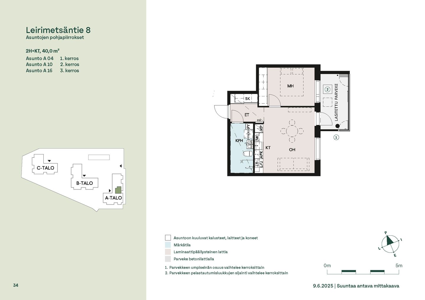 Koteja löytyy kompakteista kaksioista aina tilaviin viiden huoneen perheasuntoihin. Pohjaratkaisuissa on runsaasti vaihtoehtoja, ja suurimmissa asunnoissa on oma sauna. Monista kodeista löytyy myös erillinen wc. Lattialämmitys kylpyhuoneissa lisää arjen mukavuutta.
