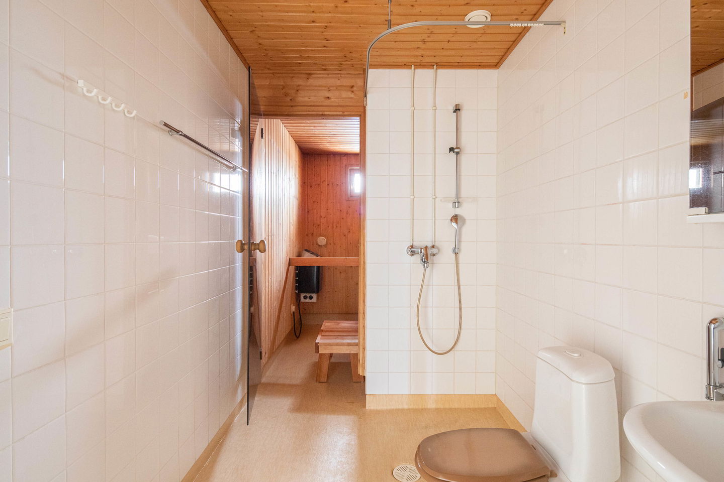 Yläkerta tarjoaa kaksi hyvänkokoista makuuhuonetta – toinen omalla parvekkeella, toinen rauhallisesti talon päädyssä. Keskellä oleva aula toimii monikäyttöisenä tilana esimerkiksi työpisteelle tai perheen yhteiseen käyttöön. Kerroksessa on myös kylpyhuone sekä sauna, jotka lisäävät asumismukavuutta.