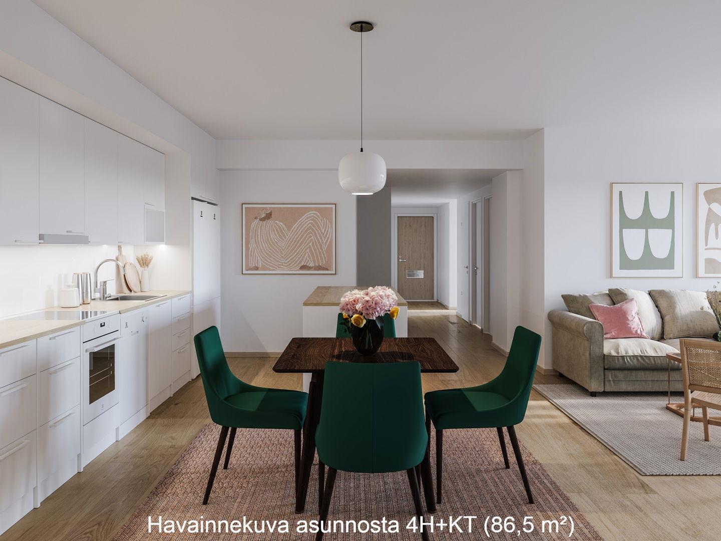 Asunnon ikkunat ja terassi ovat länteen, korttelin sisäpihan puolelle. Keittiö ja olohuone ovat yhtenäistä tilaa, jossa on mukava viettää aikaa perheen ja ystävien kesken. Keittiössä on reilusti laskutilaa, ja saareke sekä kaksi erillistä kylmälaitetta luovat hyvät puitteet ruuanlaittoon.