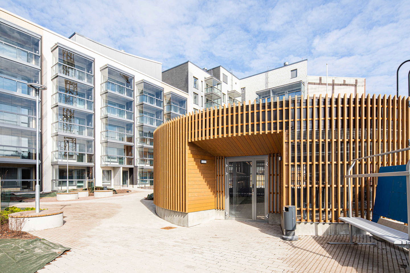 Korttelin yhteiseltä pihalta löytyvät leikkipaikat ja oleskelualueet viheristutuksineen. Oman talon sisäpihalla ulkoilevat arkipäivisin läheisen päiväkodin lapset ja muulloin piha on asukkaiden käytössä. Kestävää asumista edustavat talon katolle sijoitettavat aurinkopaneelit ja niittyviherkatto, arjen helppoutta puolestaan monipuoliset varastotilat, talopesula, kierrätyshuone sekä korttelin yhteinen imujätejärjestelmä. Kohteen tuntumaan valmistuvat myöhemmin myös alueen yhteinen kylätalo sekä vehreä puisto.