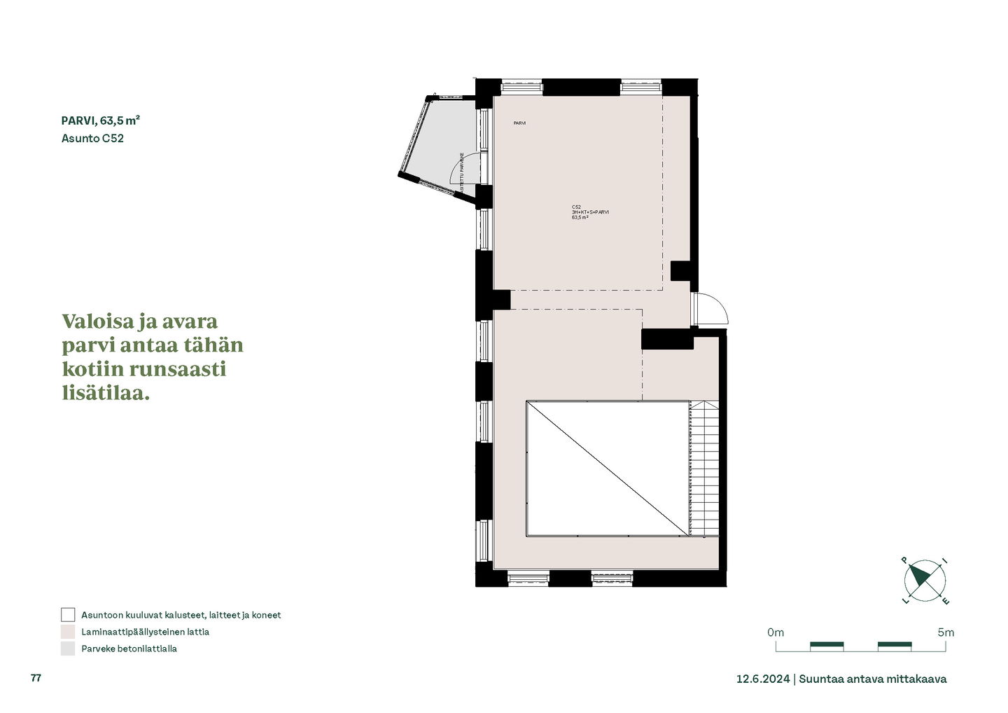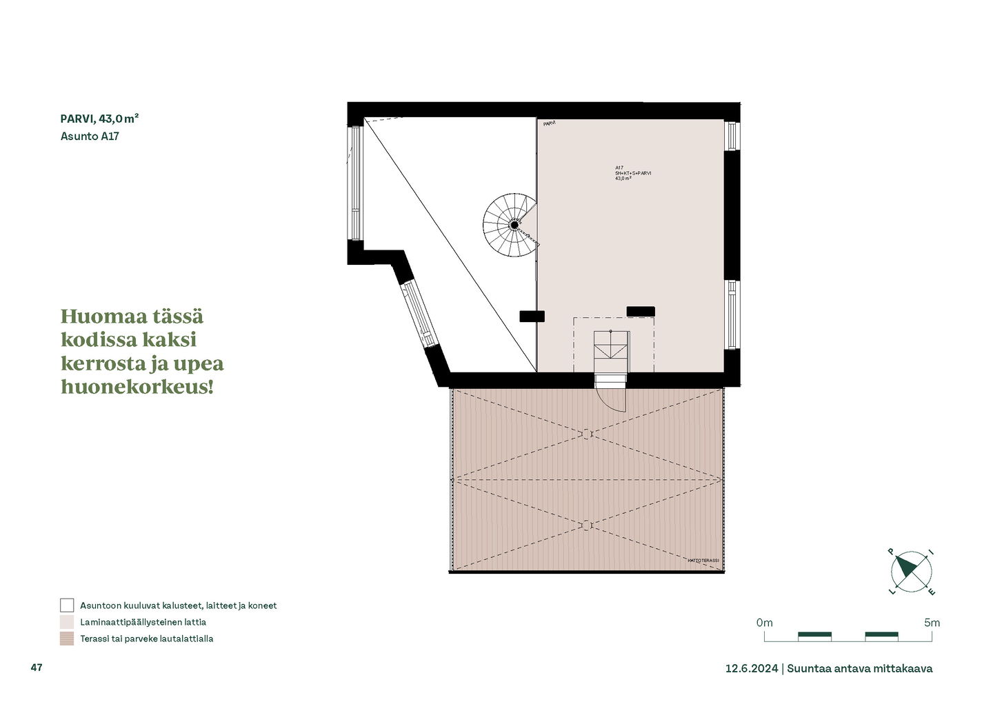 Yksiöistä tilaviin, viiden huoneen asuntoihin vaihtelevissa kodeissa on useita erilaisia asuntopohjia, jotka inspiroivat kokenuttakin sisustajaa. Osassa koteja on oma sauna ja ikkuna myös kylpyhuoneessa. Kaikissa asunnoissa on lasitetut parvekkeet tai terassit, ja keittiön varusteluun sisältyy astianpesukone. Ylimmistä kerroksista löytyvät tämän kohteen helmet: kuusi kaksikerroksista parviasuntoa, joissa on sekä parveke että osittain lasitettu kattoterassi. Kaksikerroksia asuntoja on myös talon matalammassa osassa, joista osaan on oma sisäänkäynti sisäpihalta sekä parveke ylemmässä kerroksessa.