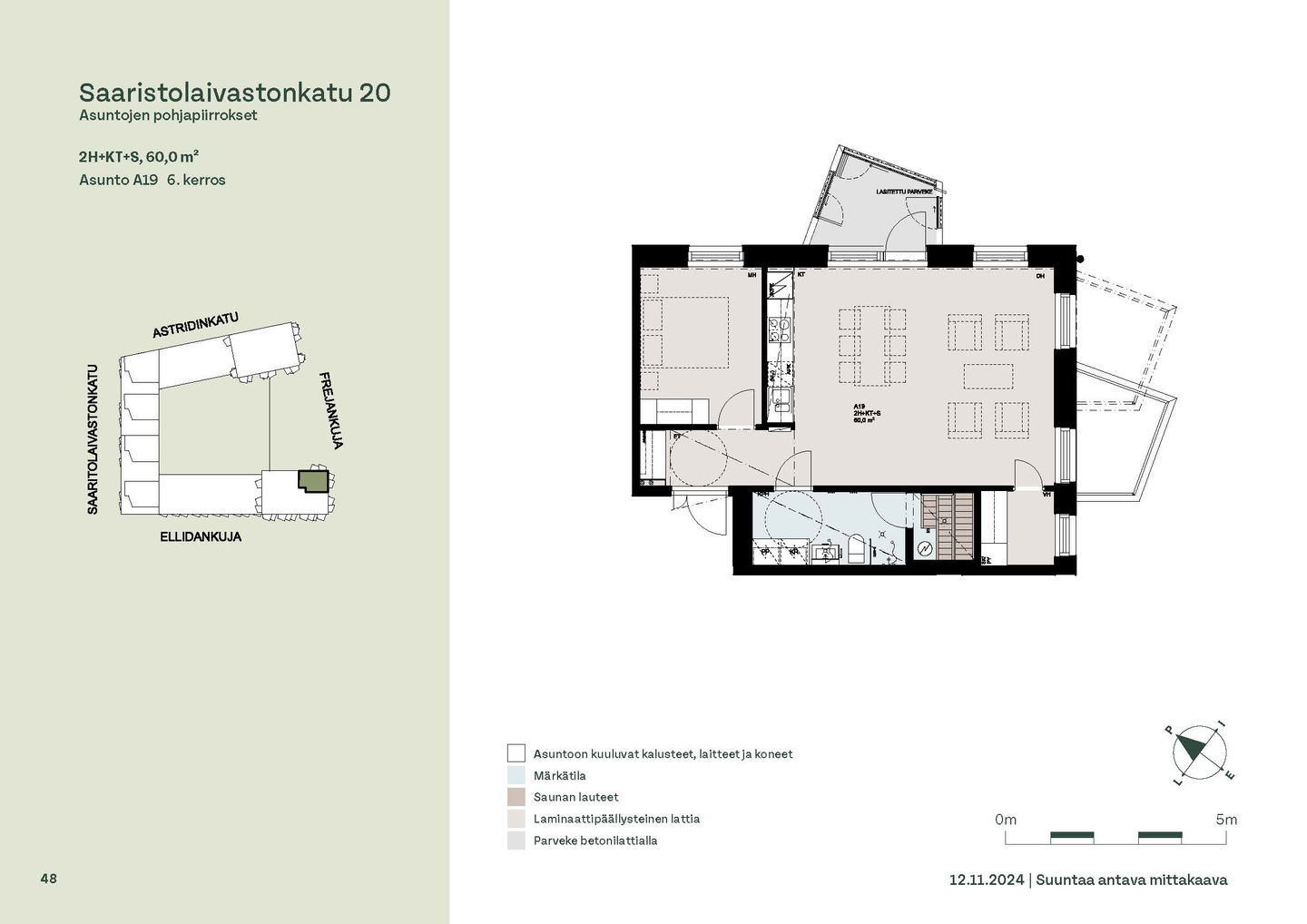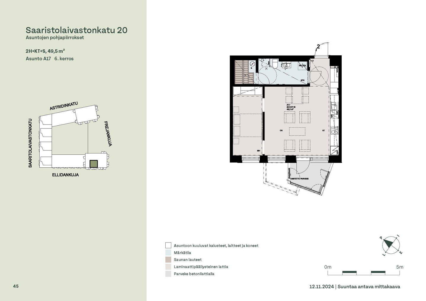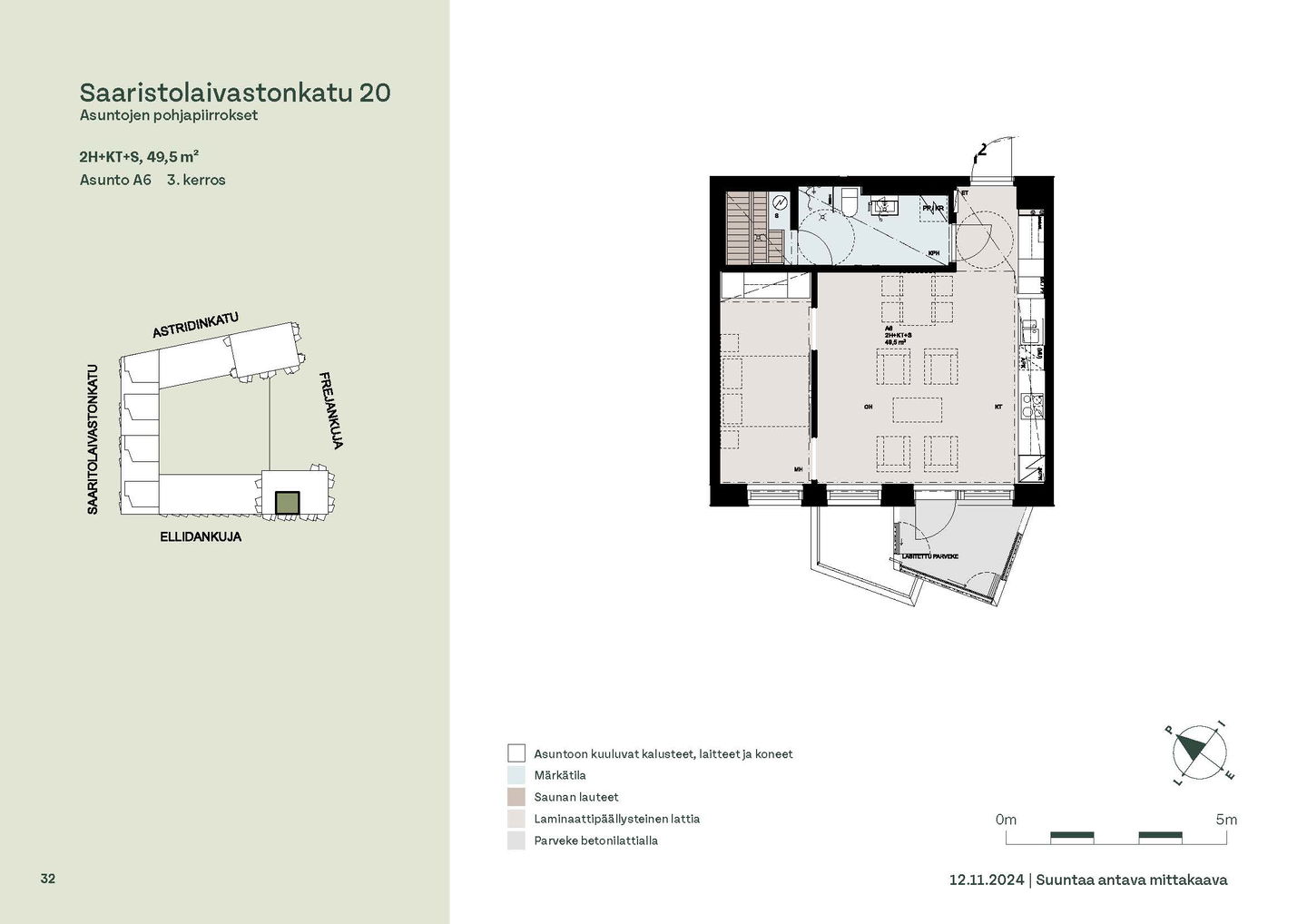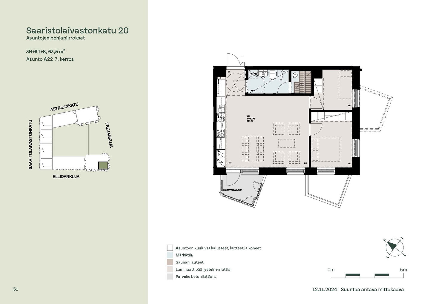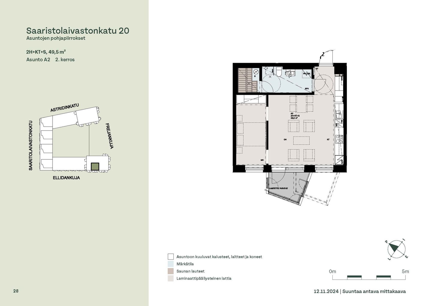 Asuntosäätiön ainutlaatuinen asumisoikeuskohde nousee lähelle meren rantaa Kruunuvuorenrannan upeimpien näkymien äärelle. Suojaisan korttelin muodostava kohde valmistuu kahdessa vaiheessa ja käsittää yhteensä kaksi 4–8-kerroksista asuinrakennusta. Vuoden 2026 alkupuolella valmistuvat toisen vaiheen 51 asumisoikeuskotia, joista osasta avautuvat upeat merimaisemat. Uuden aikakauden kaupunkiasumista edustavan korttelin suunnittelussa on panostettu yhteisöllisyyteen, jopa matalampien luhtitalojen kattoalueet on varattu asukkaiden virkistyskäyttöön. Talosaunan vilvoitteluterassilta avautuvat huikeat maisemat ja korttelipihalta löytyvät suojaisat leikki- ja oleskelualueet. Asukkaiden käytössä on talopesula, monipuoliset harraste- ja varastotilat sekä alueen yhteiskäyttöauto kadun varteen. Kaksioista tilaviin, viiden huoneen asuntoihin vaihtelevissa kodeissa on useita erilaisia asuntopohjia, jotka inspiroivat kokenuttakin sisustajaa. Kaikissa asunnoissa on lasitetut parvekkeet tai terassit ja keittiön varusteluun sisältyy astianpesukone. Kodit kylpevät luonnonvalossa ja ylimmistä kerroksista löytyvät tämän kohteen helmet: kaksikerroksiset parviasunnot, joissa on koko huoneiston levyinen parveke sekä kattoterassi. Osassa koteja on oma sauna ja ikkuna myös kylpyhuoneessa, sekä muutamissa pihatason kodeissa istutusten ympäröimät lasitetut terassit. Saaristolaivastonkadulla nautit mukavasta ja ekologisesta asumisesta. Kohde varustetaan sähköisellä lukitusjärjestelmällä, ja asuntojen vesikiertoisen lattialämmityksen ja -viilennyksen tarvitsema lämmitysenergia tuotetaan maalämmöllä. Kotiovelta avautuvat mitä kauneimmat ulkoilureitit merenrantaan ja alueen viehättäviin puistoihin – lyhyen venematkan päässä kaupungin sykkeestä.