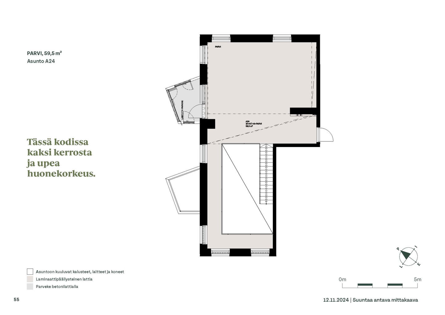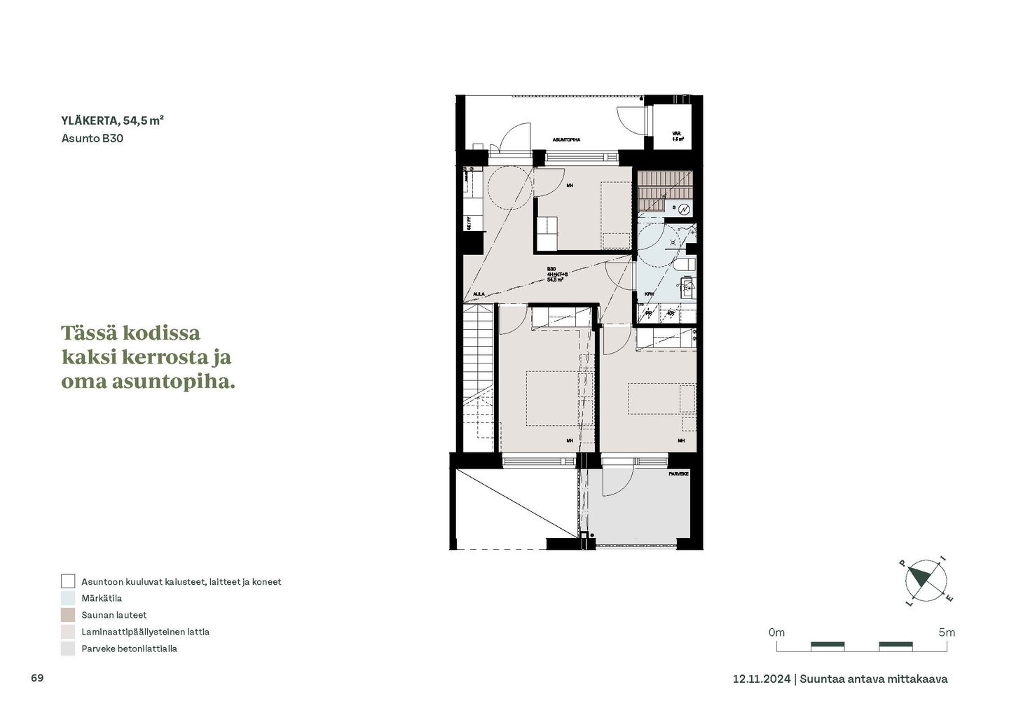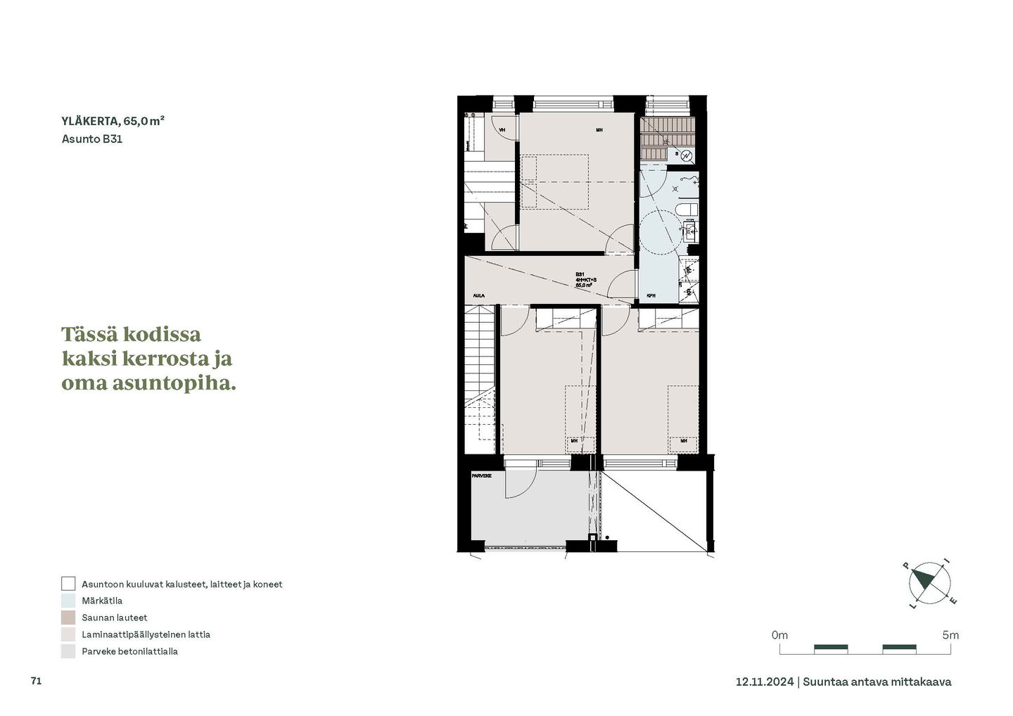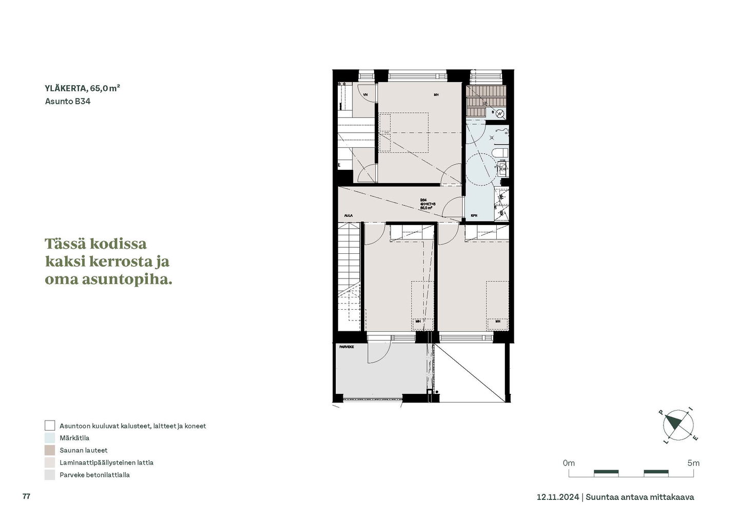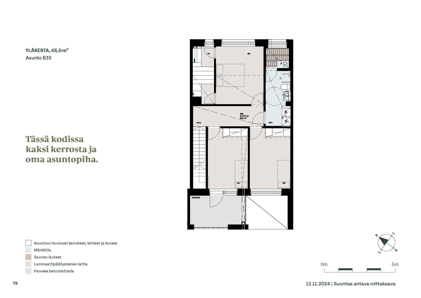 Kaksioista tilaviin, viiden huoneen asuntoihin vaihtelevissa kodeissa on useita erilaisia asuntopohjia, jotka inspiroivat kokenuttakin sisustajaa. Kaikissa asunnoissa on lasitetut parvekkeet tai terassit ja keittiön varusteluun sisältyy astianpesukone. Kodit kylpevät luonnonvalossa ja ylimmistä kerroksista löytyvät tämän kohteen helmet: kaksikerroksiset parviasunnot, joissa on koko huoneiston levyinen parveke sekä kattoterassi. Osassa koteja on oma sauna ja ikkuna myös kylpyhuoneessa, sekä muutamissa pihatason kodeissa istutusten ympäröimät lasitetut terassit.
